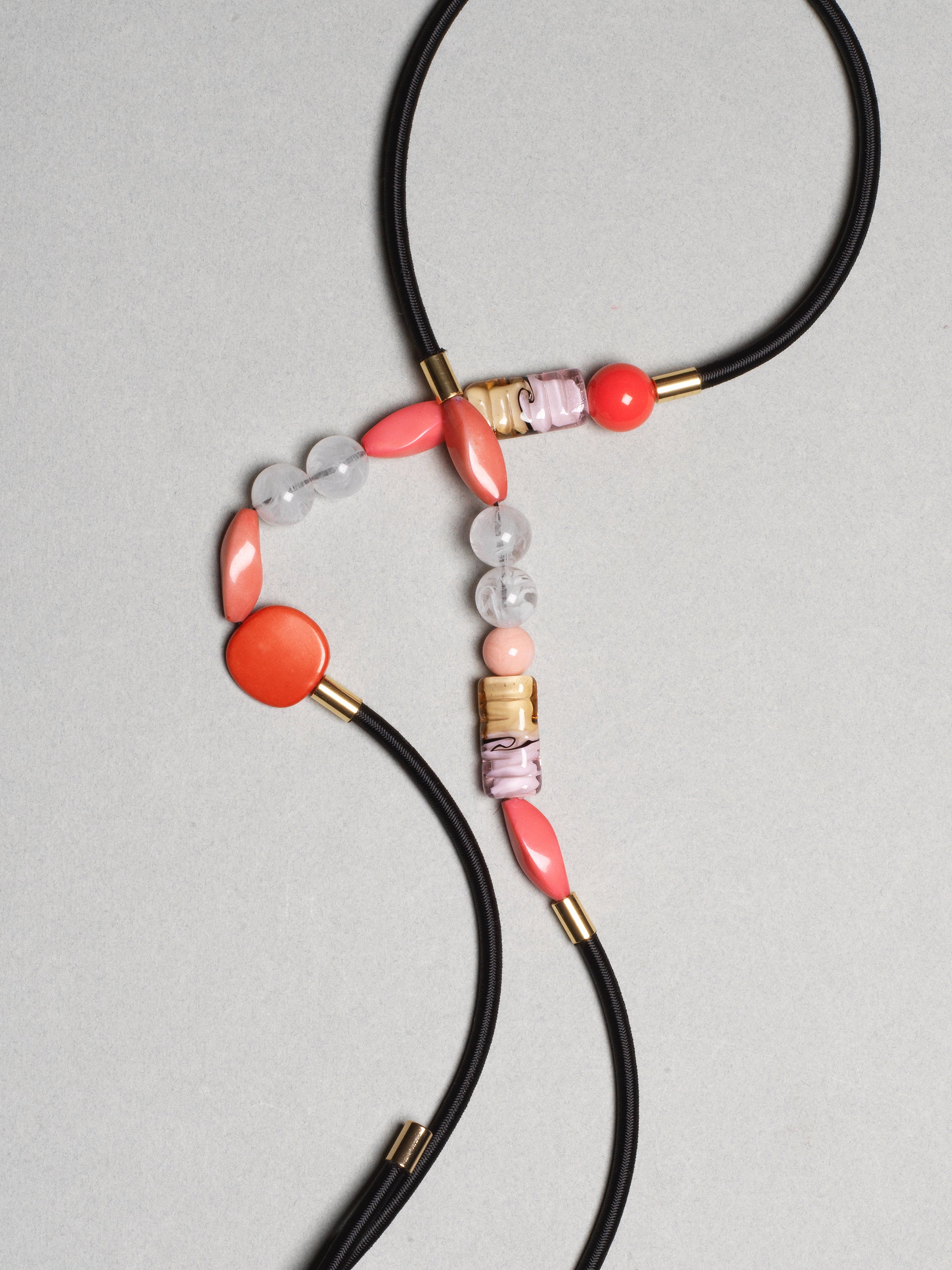 Gold-plated brass end caps and elastic cord are used as additional materials for this piece. The flexible fastening makes the chain suitable for any type of glasses temple.