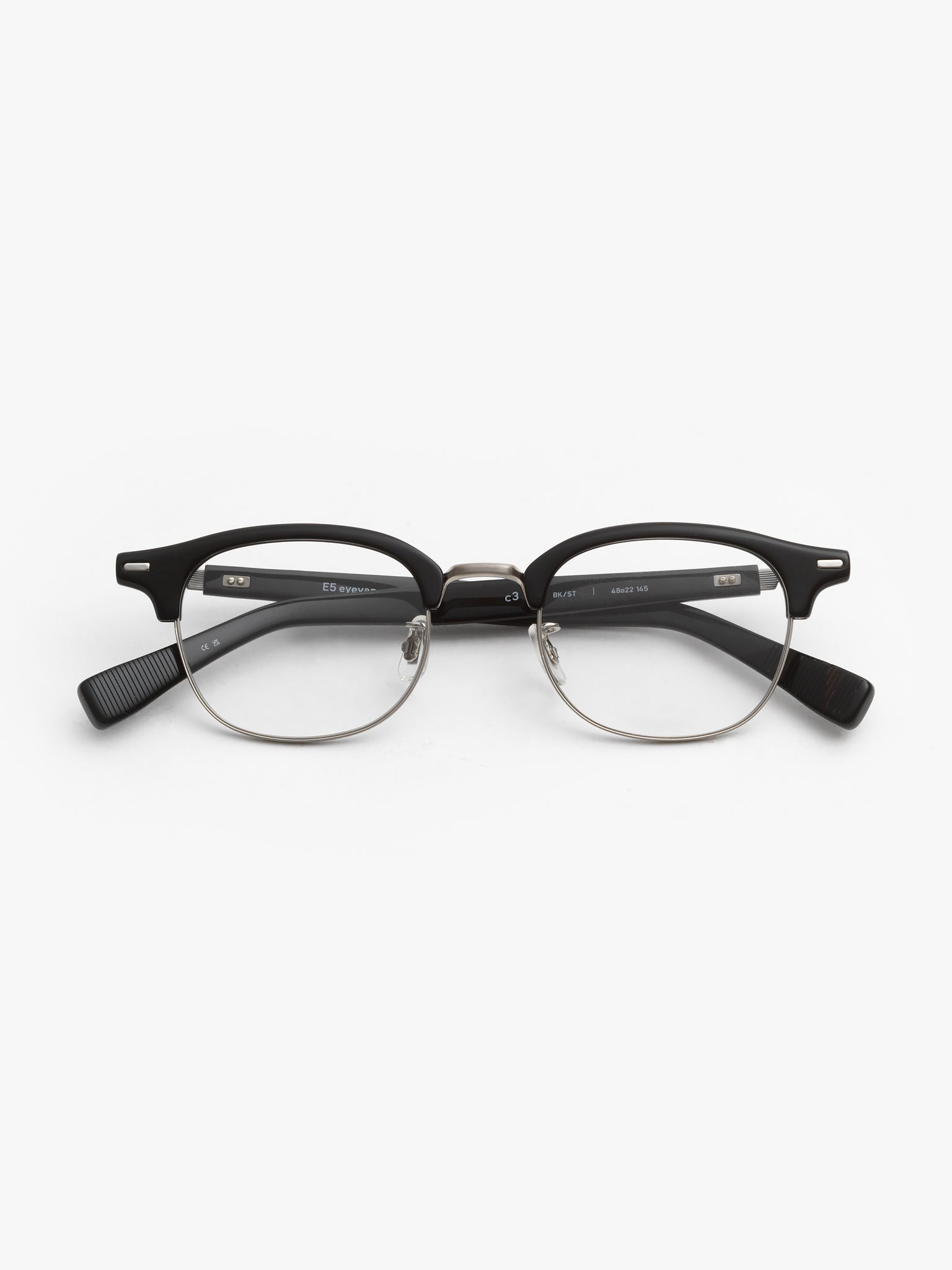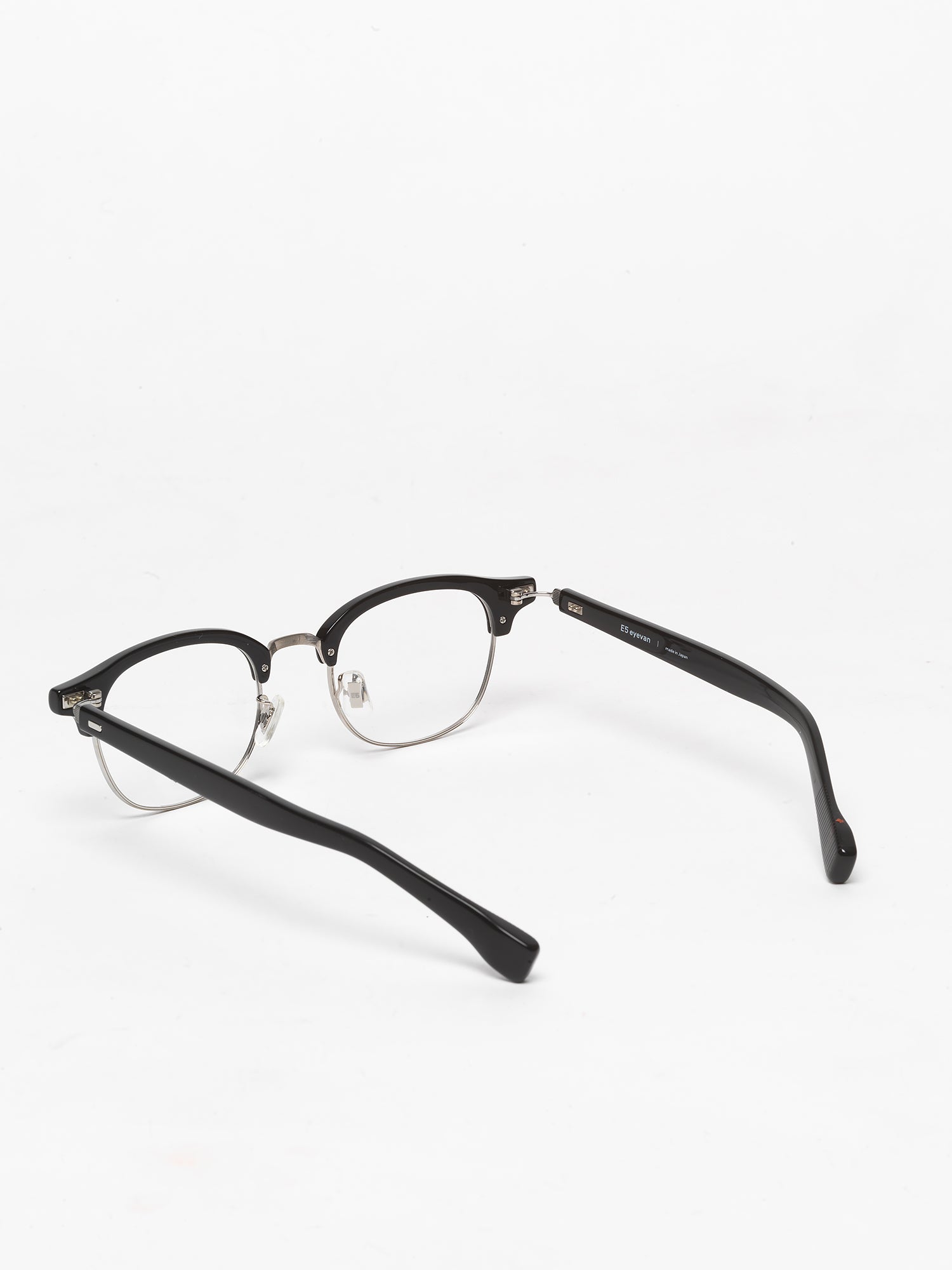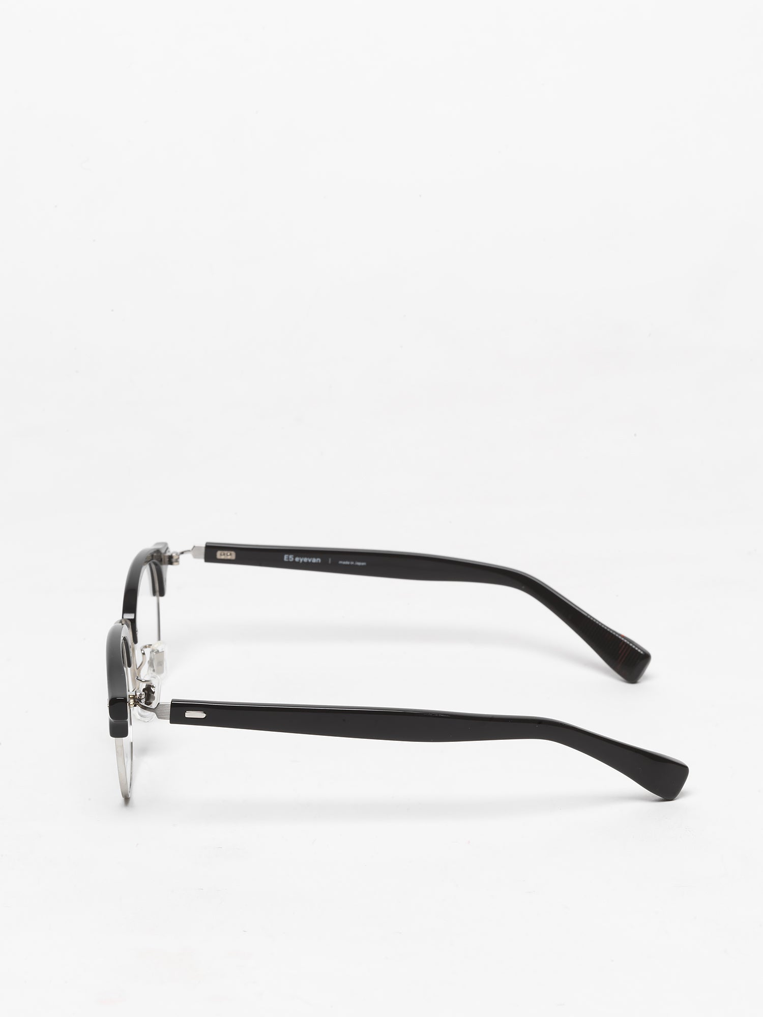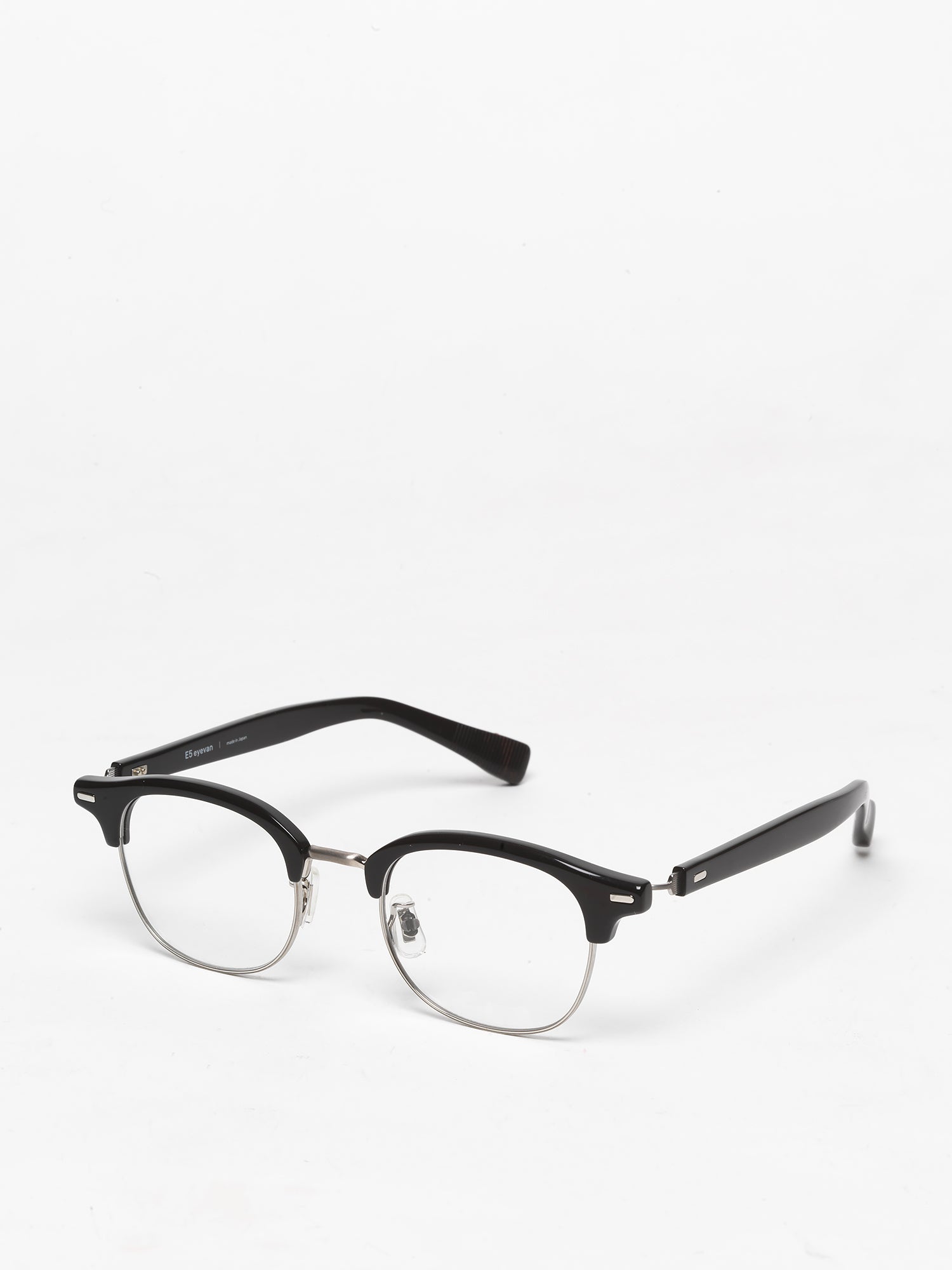 The first clubmaster frame from E5 Eyevan. The front is made of “high-count acetate” a special plastic that is high density, less deformed and less impact from the human body, and less susceptible to age-related changes. Assembled with lightweight and strong titanium rim and bridge. The unique L-shaped temples are the result of the pursuit of comfort and ease of adjustment of opticians. Combined with the long acetate temple tips, the appropriate weight and area in contact with the temporal area are taken into consideration. The ideal product that is comfortable to wear, lightweight and hard to break.
