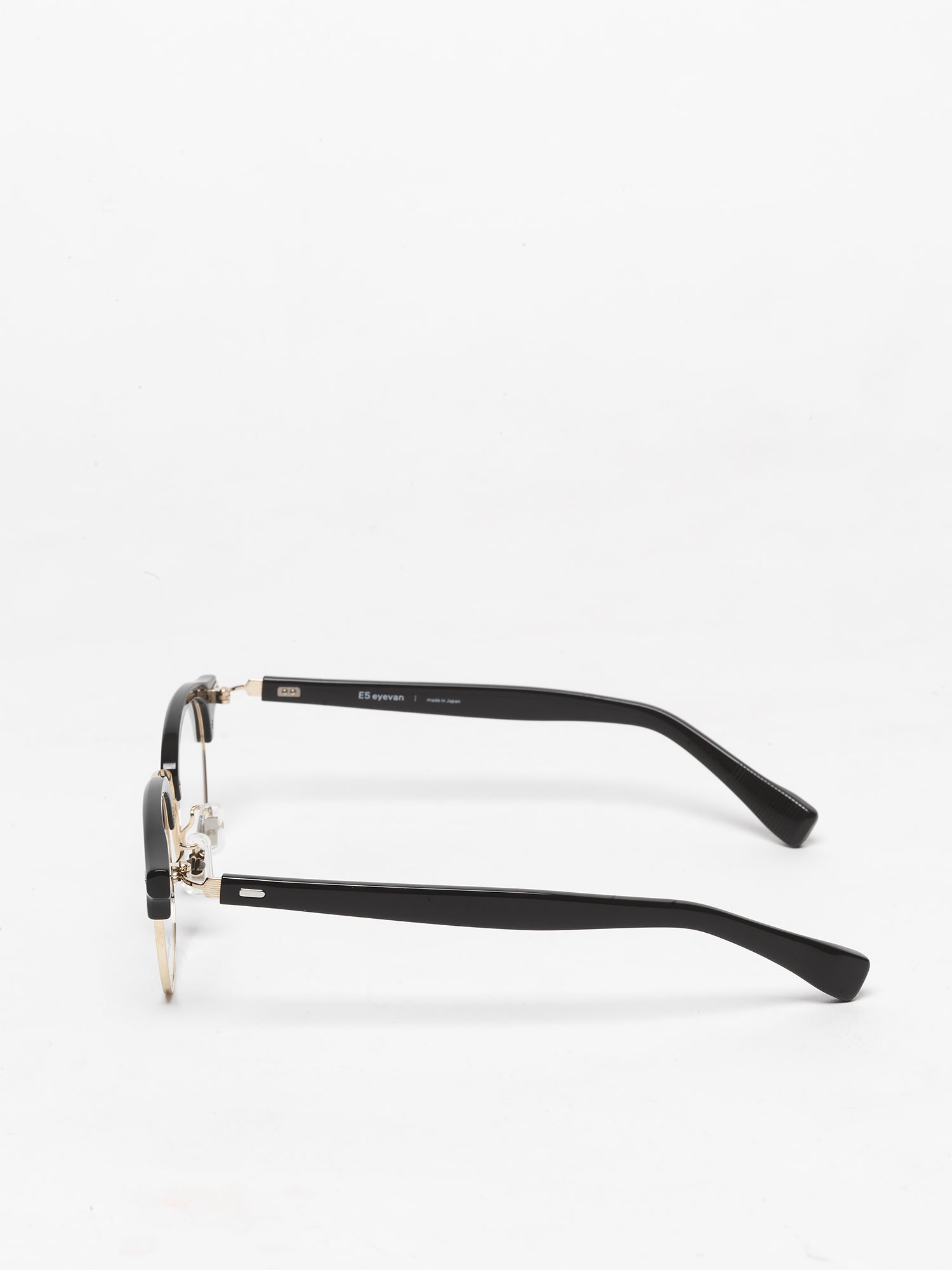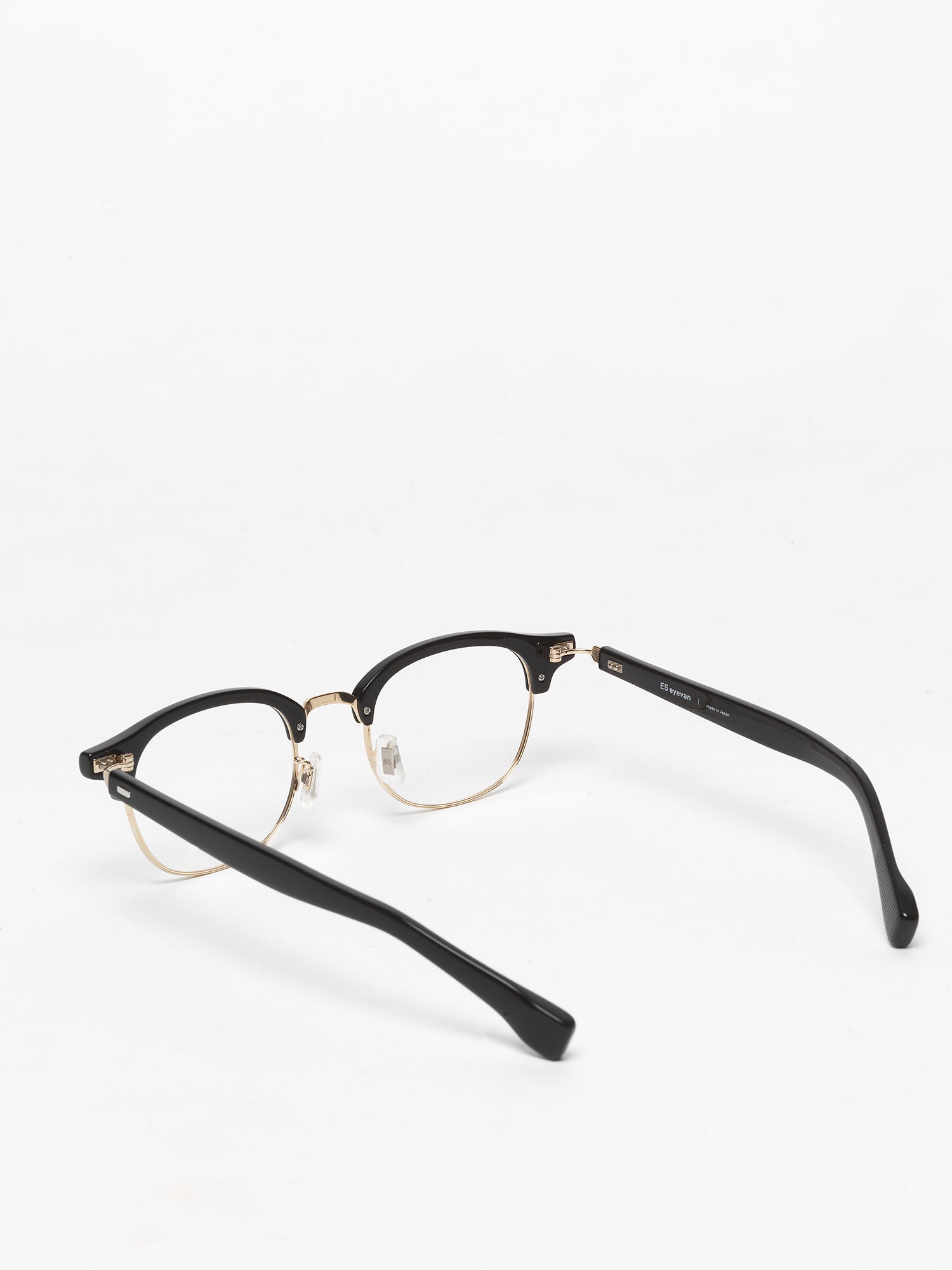 The first clubmaster frame from E5 Eyevan. The front is made of “high-count acetate” a special plastic that is high density, less deformed and less impact from the human body, and less susceptible to age-related changes. Assembled with lightweight and strong titanium rim and bridge. The unique L-shaped temples are the result of the pursuit of comfort and ease of adjustment of opticians. Combined with the long acetate temple tips, the appropriate weight and area in contact with the temporal area are taken into consideration. The ideal product that is comfortable to wear, lightweight and hard to break.