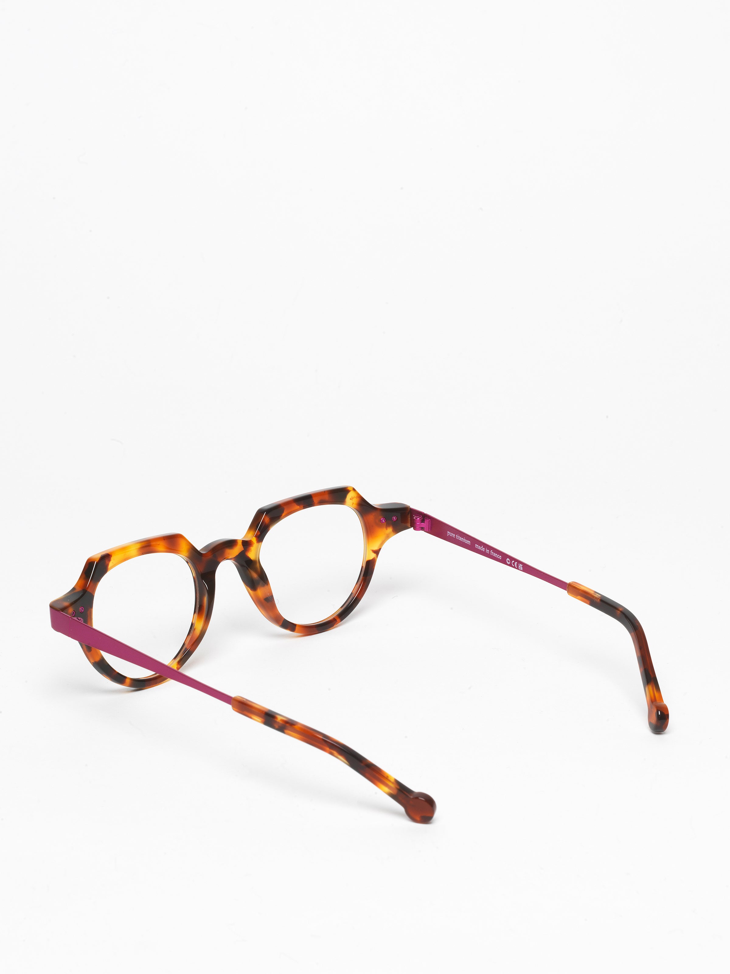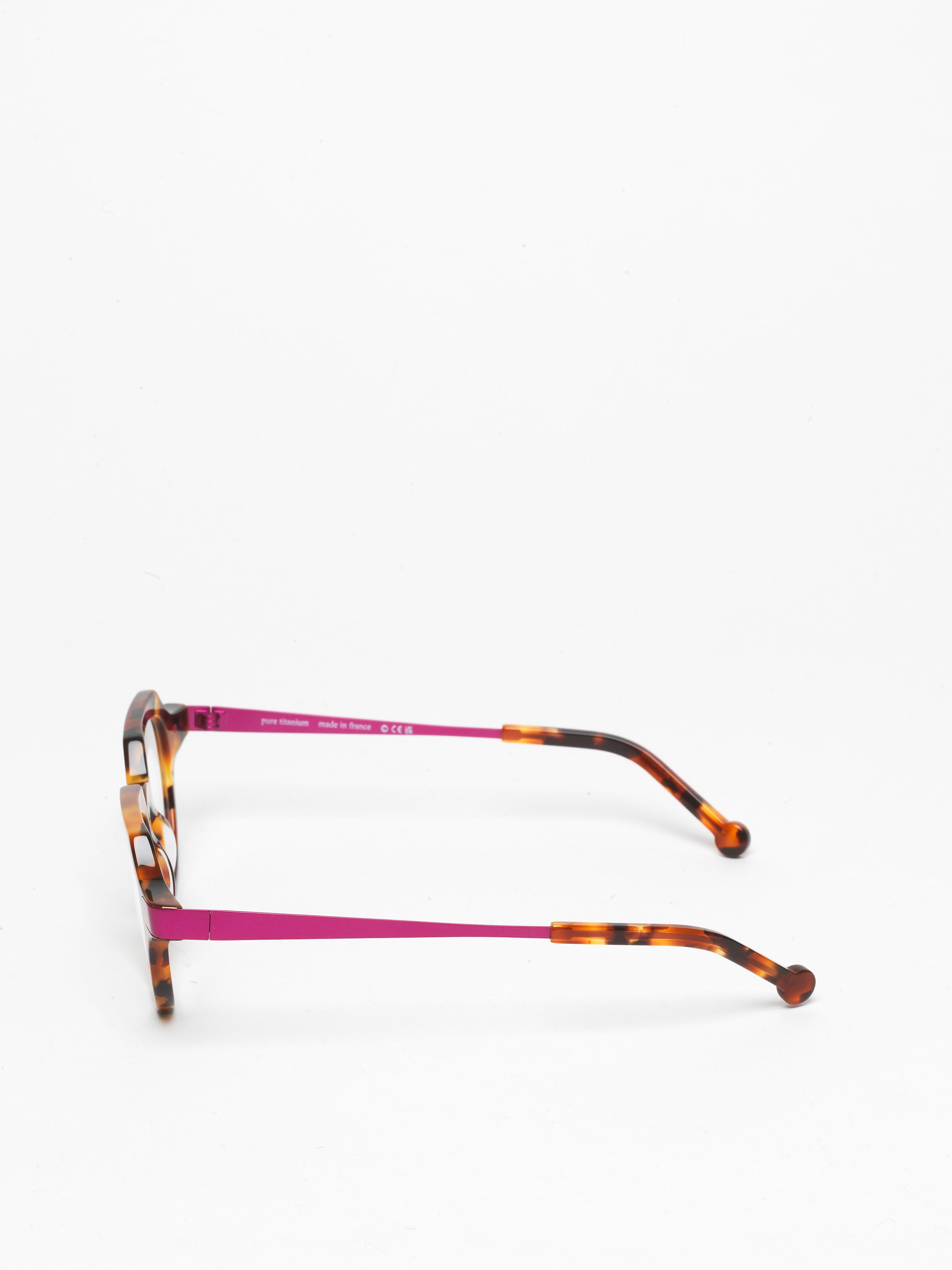 - bright tortoiseshell acetate frame paired with neon pink titanium temples