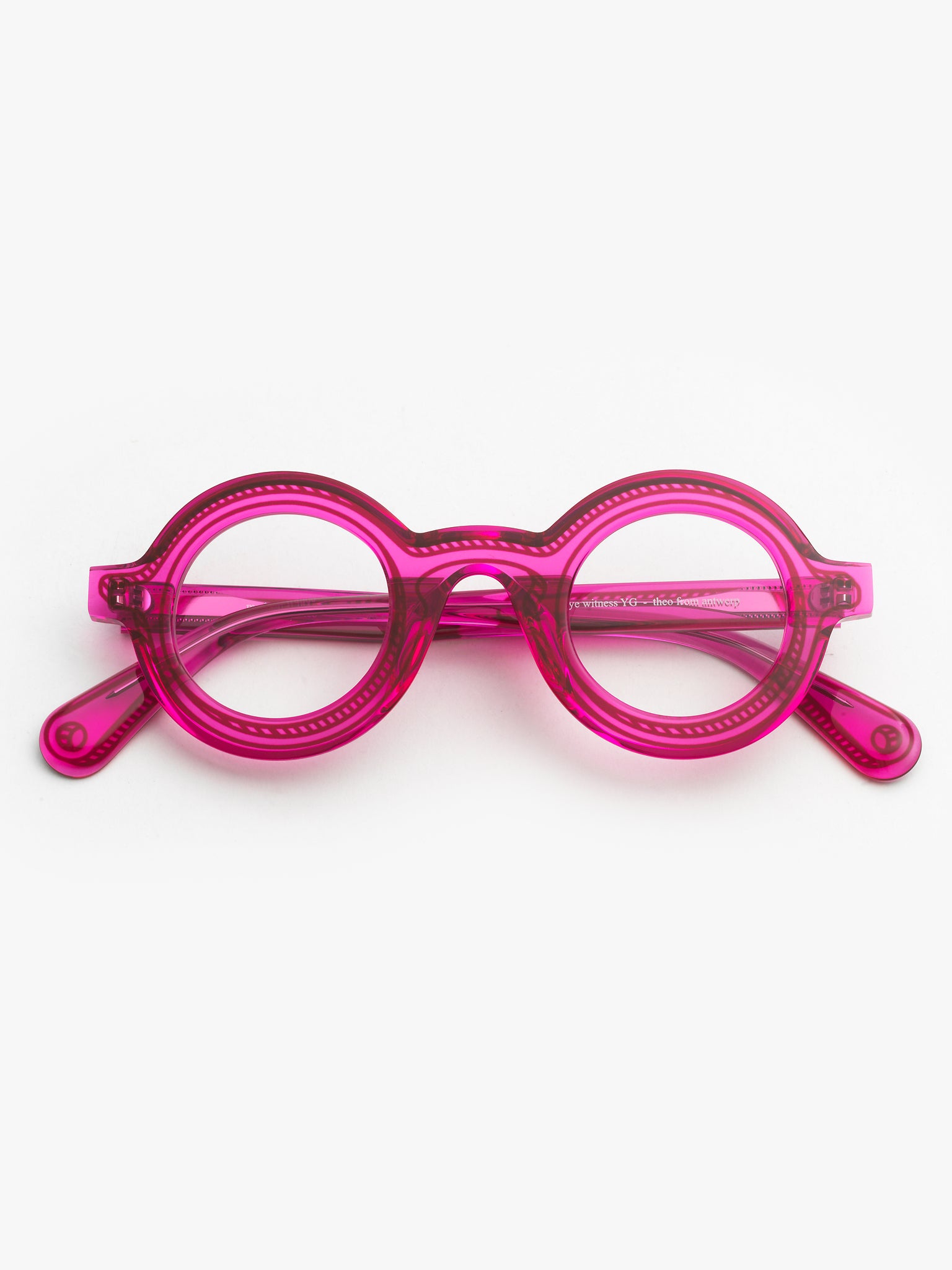 Bold round shape with flat surfaces, crafted in a glossy transparent color and adorned with a decorative pattern outlining the entire frame.