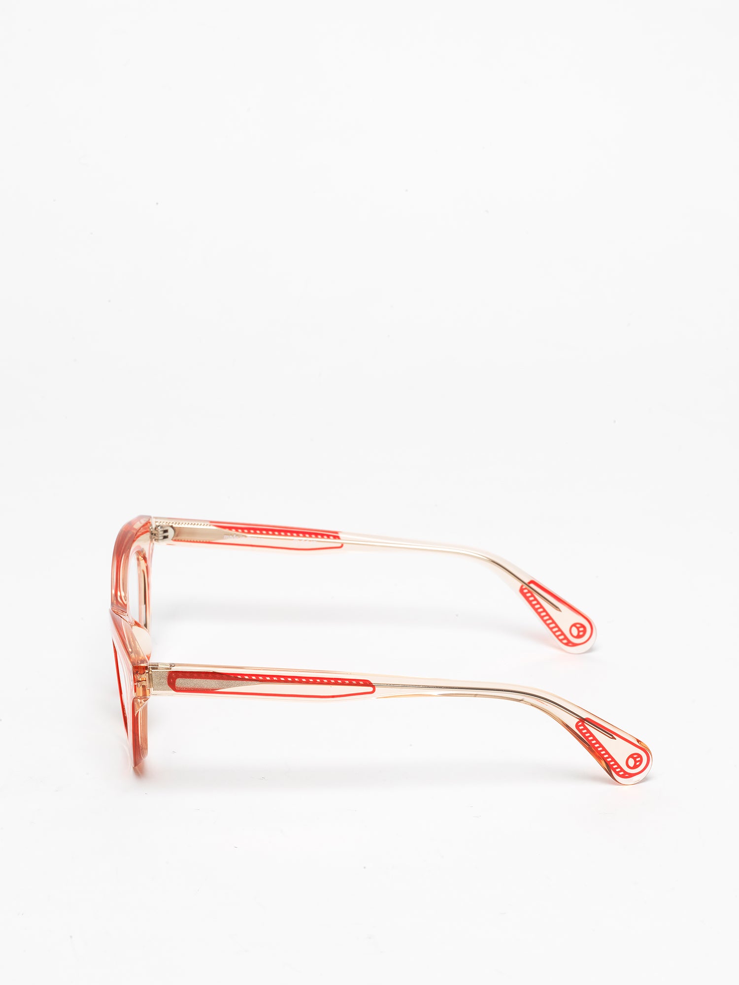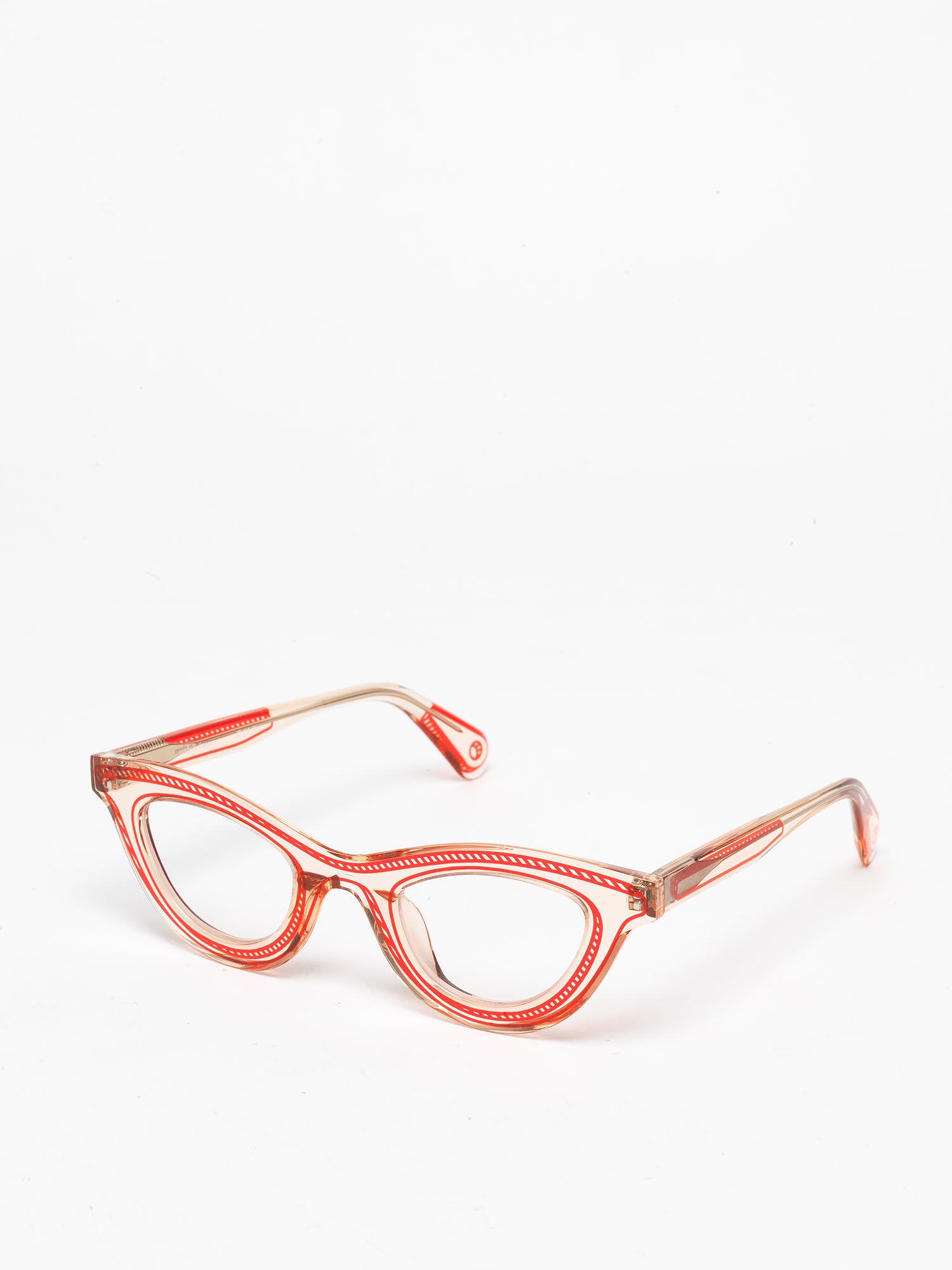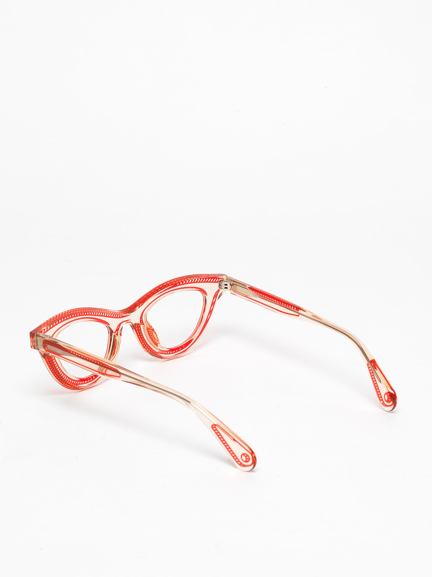Thick, oversize and gentle cat-eye shape with flat surfaces, in a glossy transparent color, featuring a decorative pattern that outlines the entire frame.