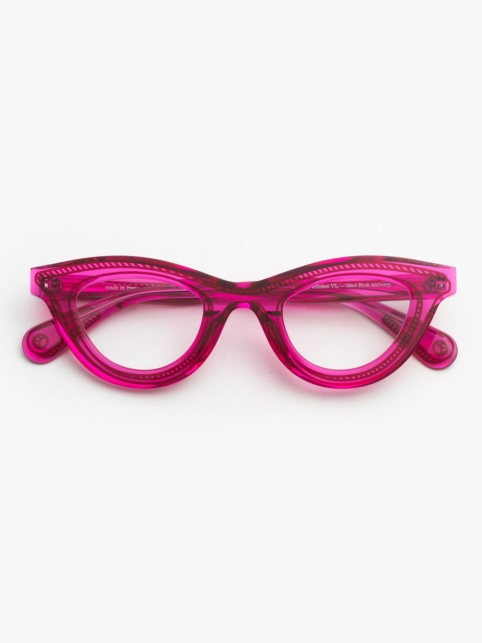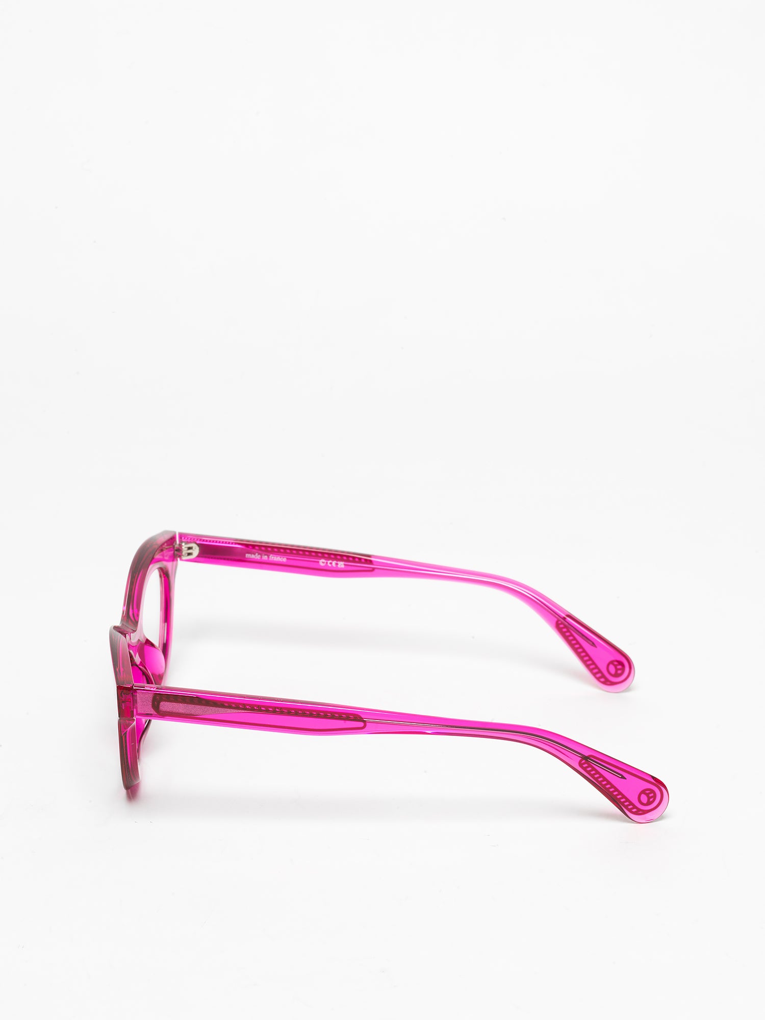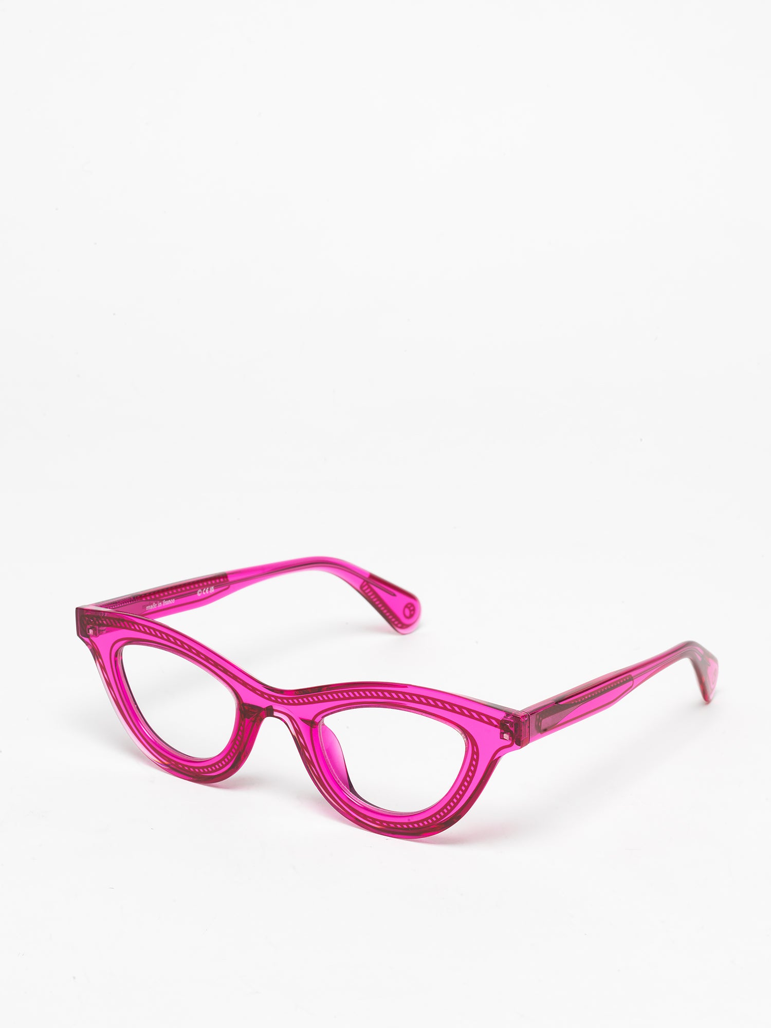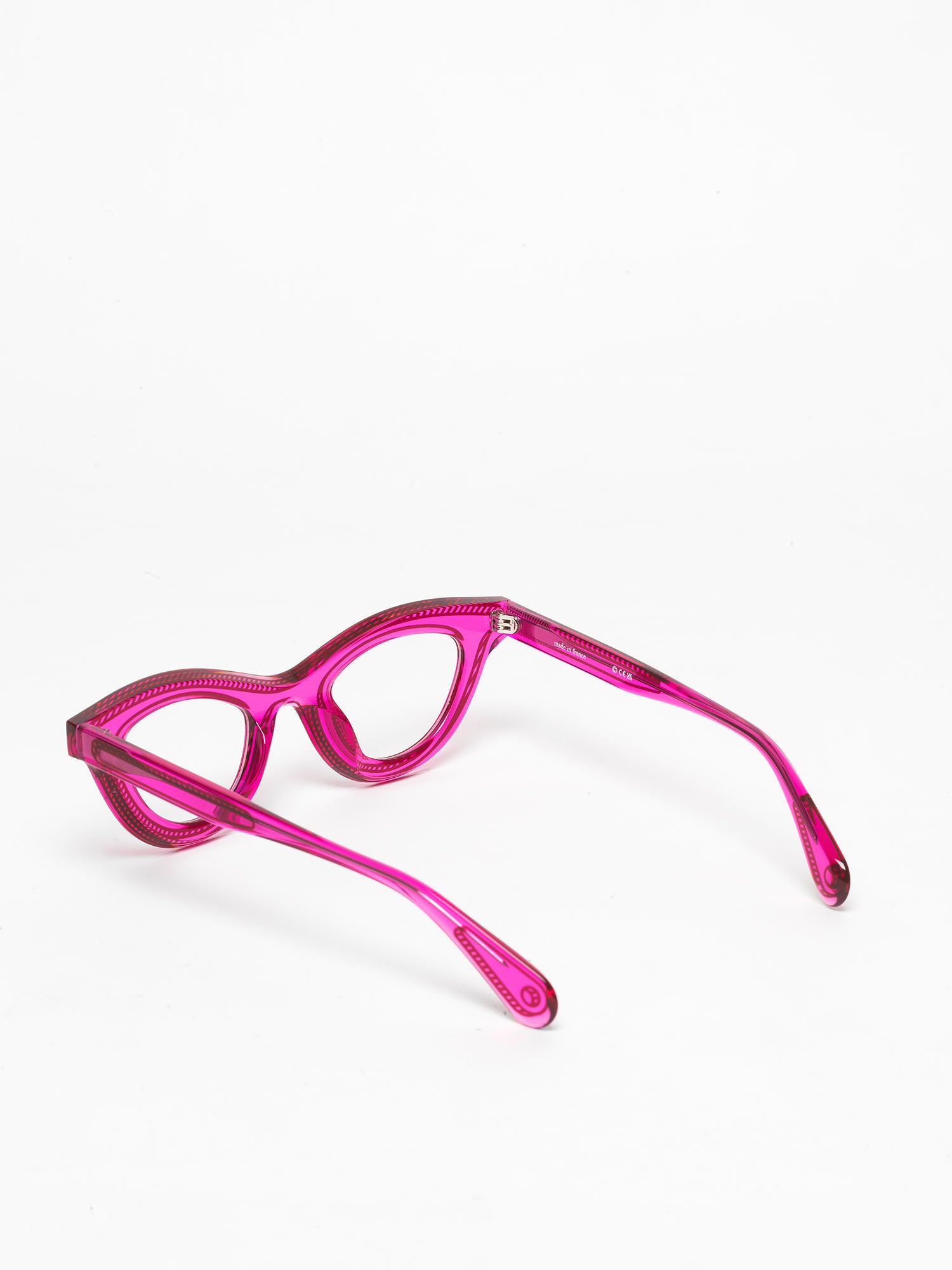 Thick, oversize and gentle cat-eye shape with flat surfaces, in a glossy transparent color, featuring a decorative pattern that outlines the entire frame.