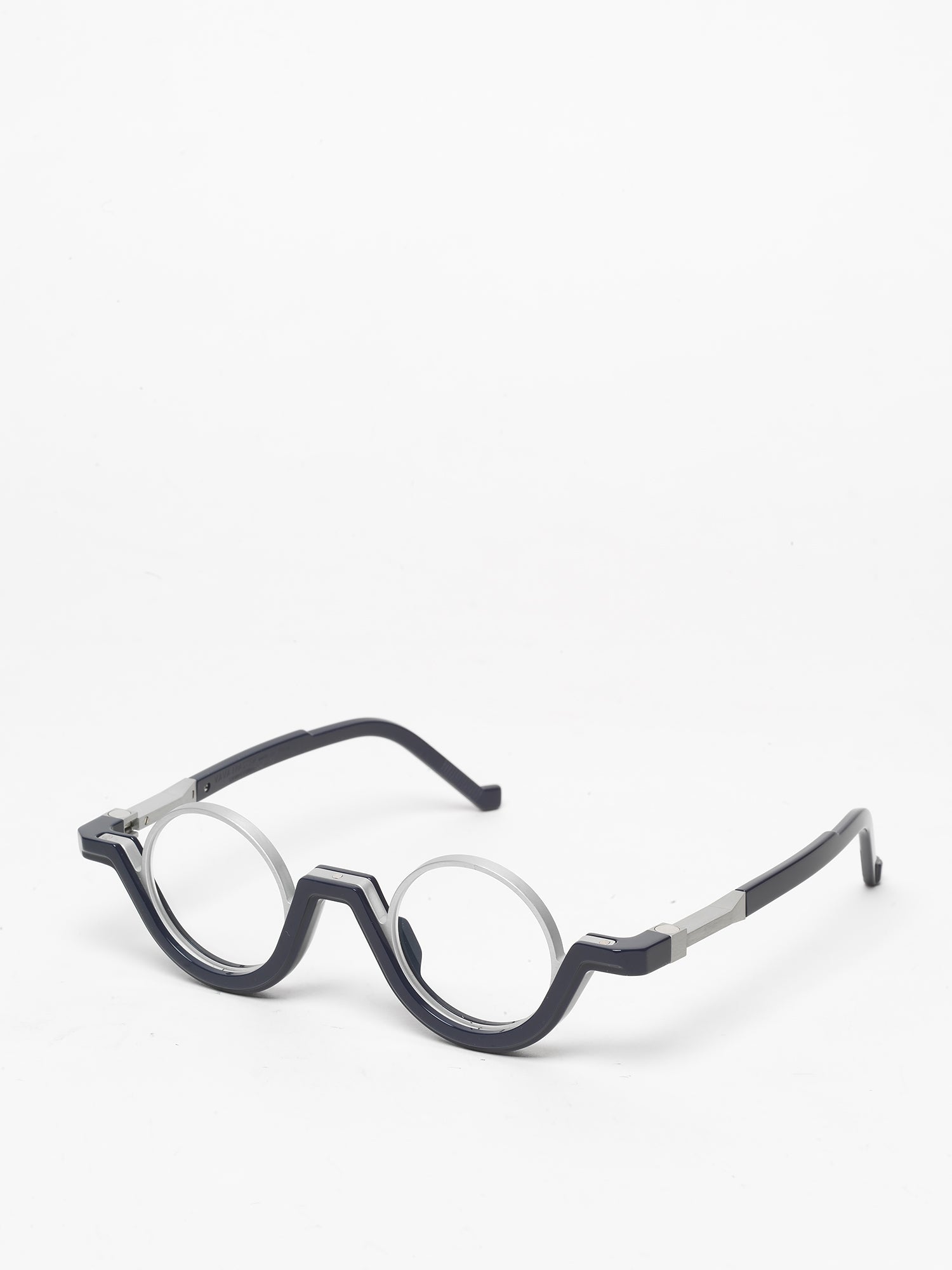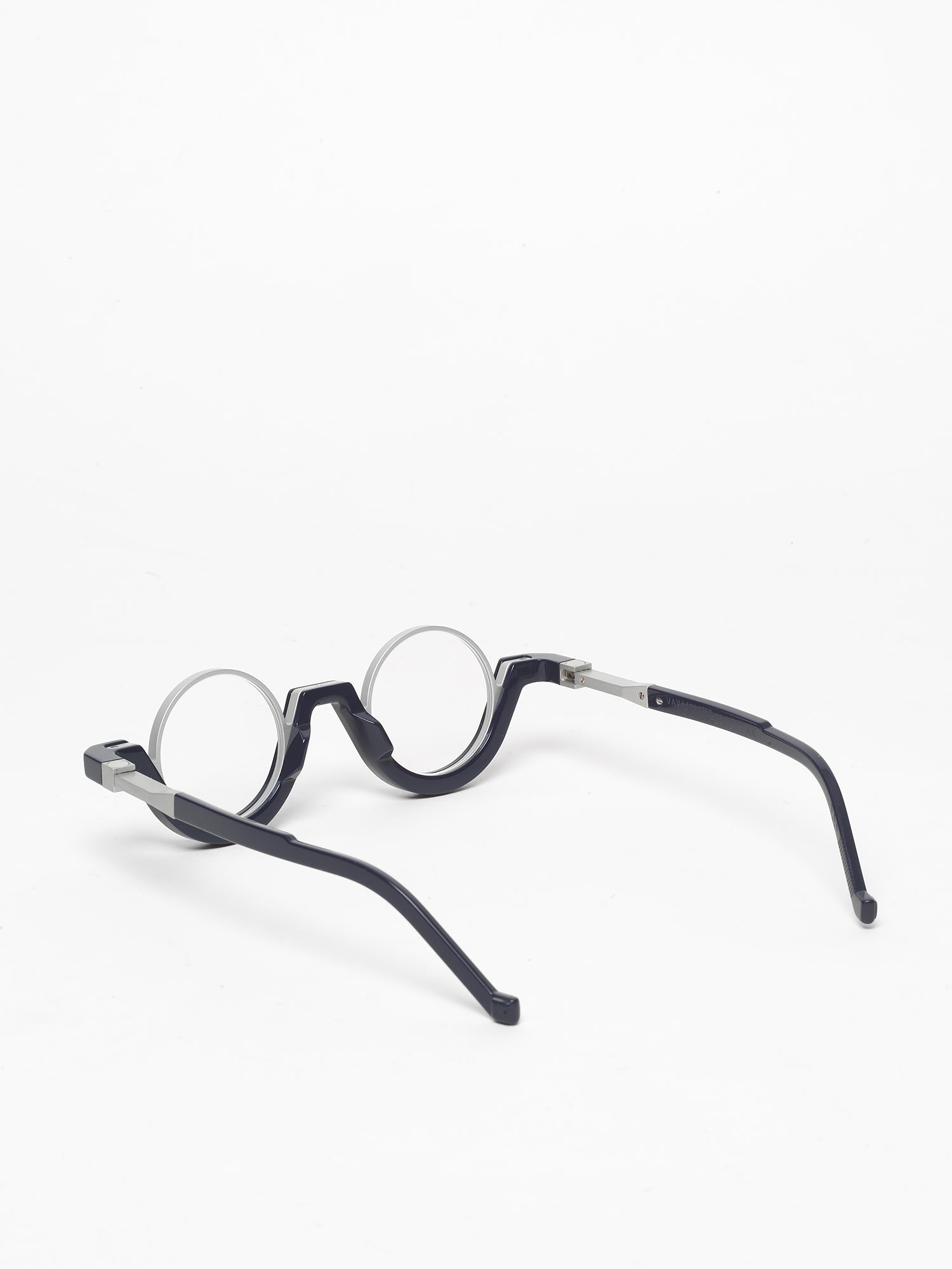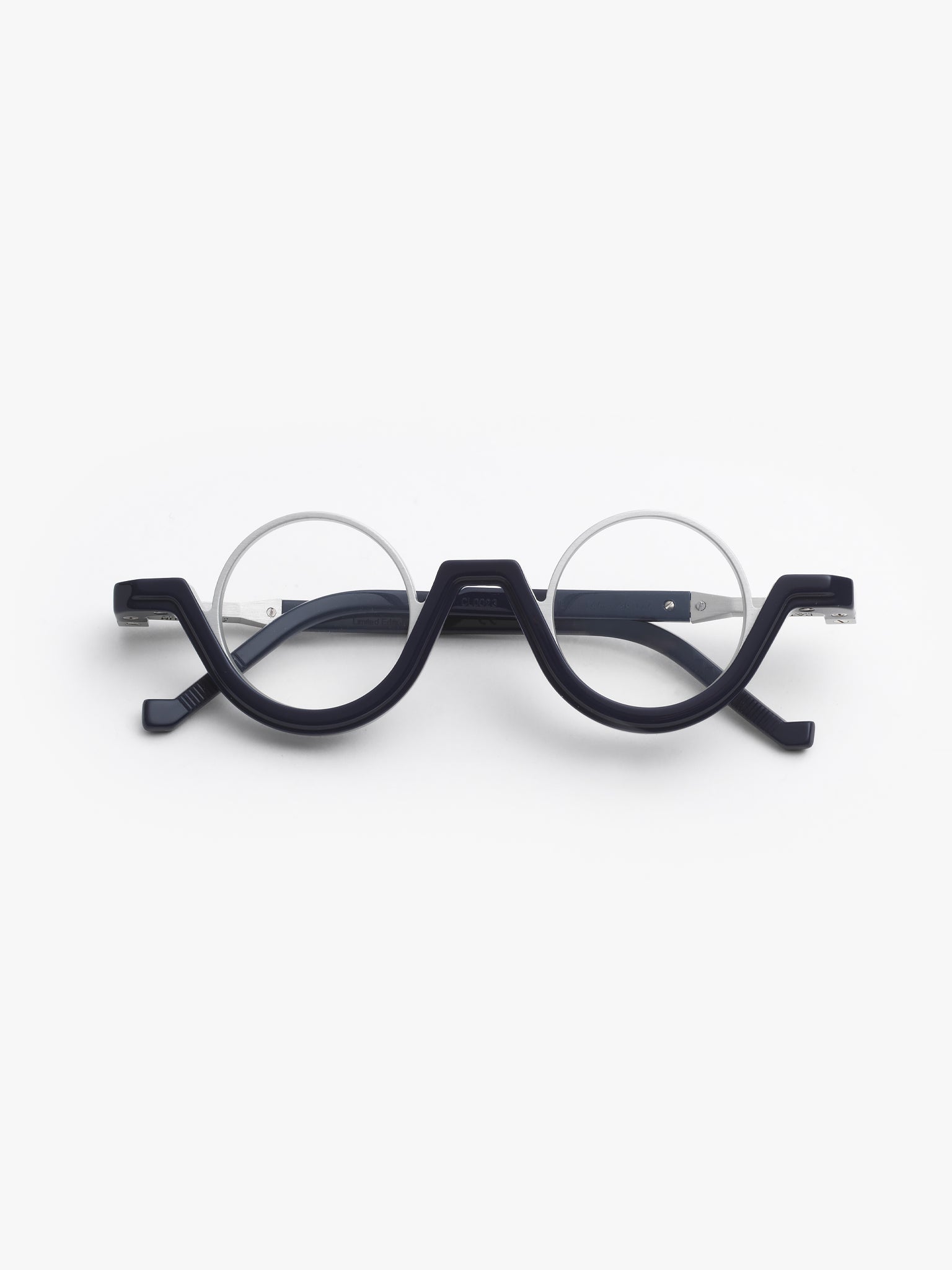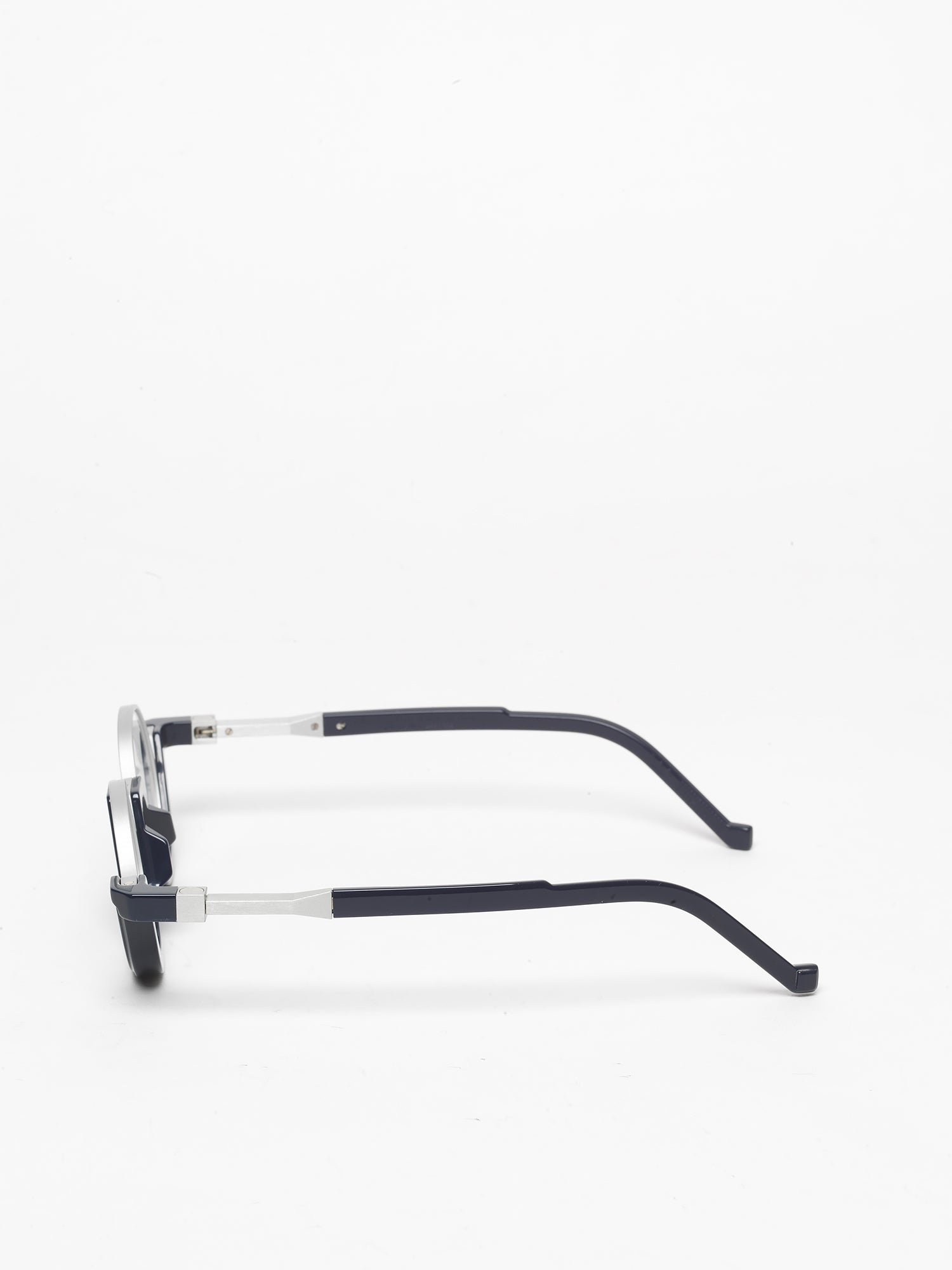 - solid glossy dark blue acetate frame combined with matte silver aluminium