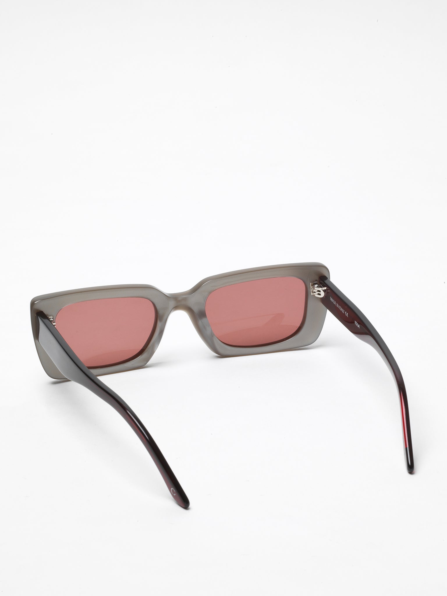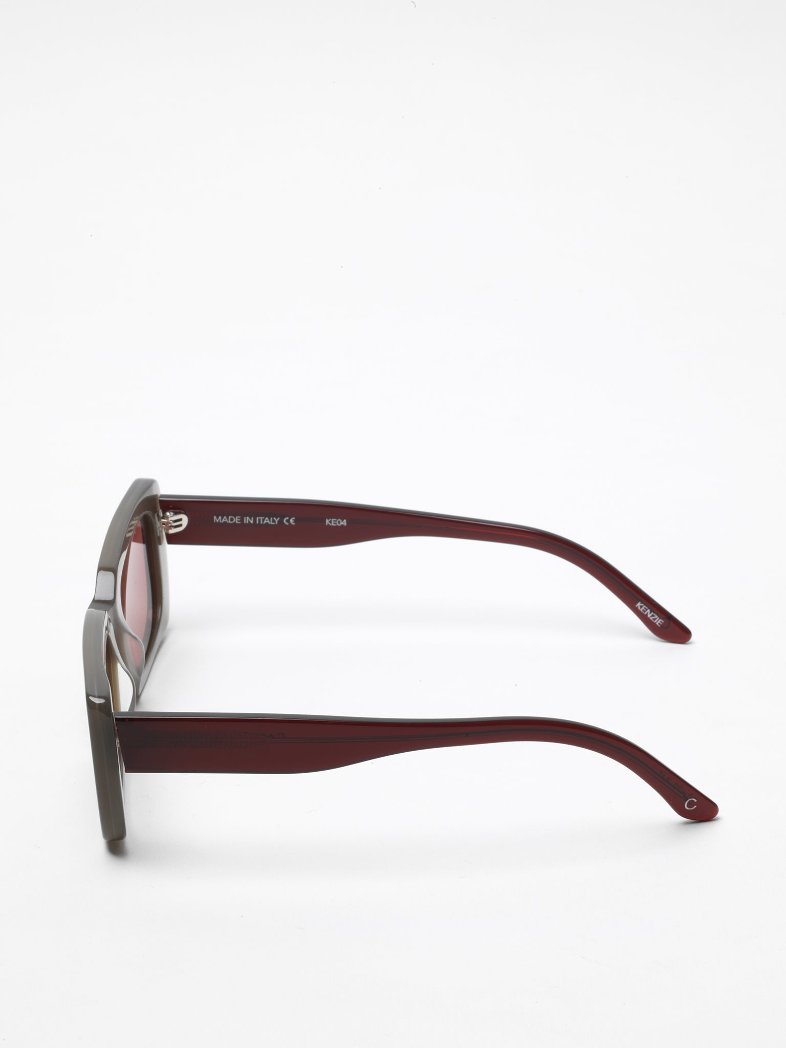 • shiny silver acetate front frame, paired with blood red acetate temples