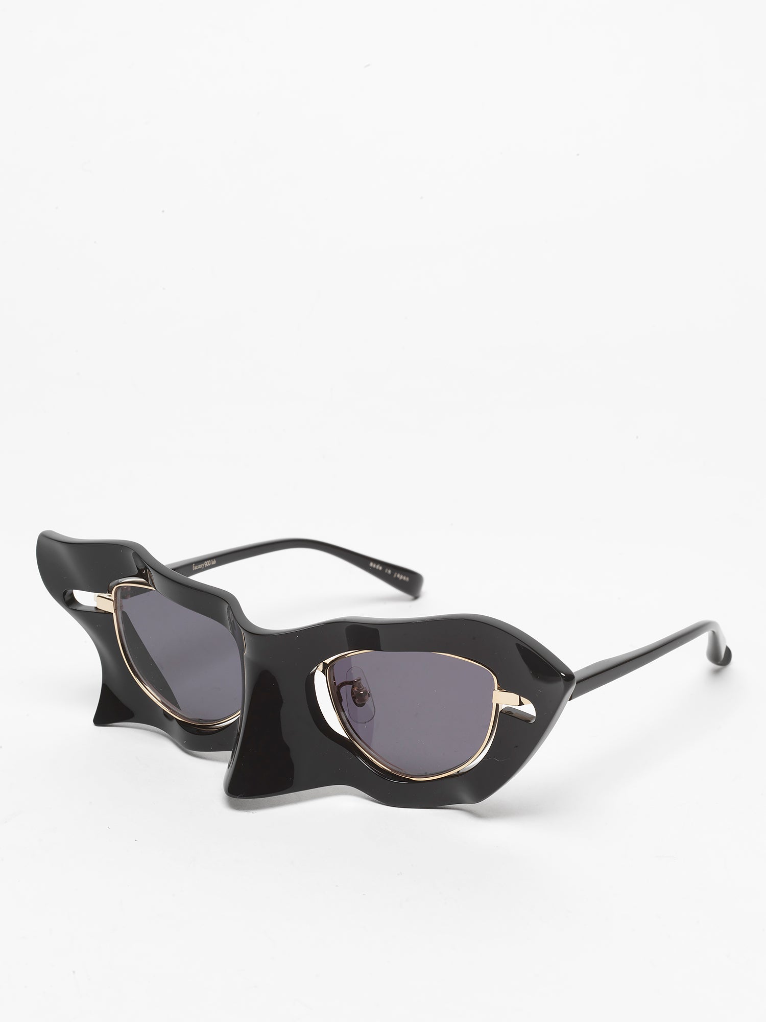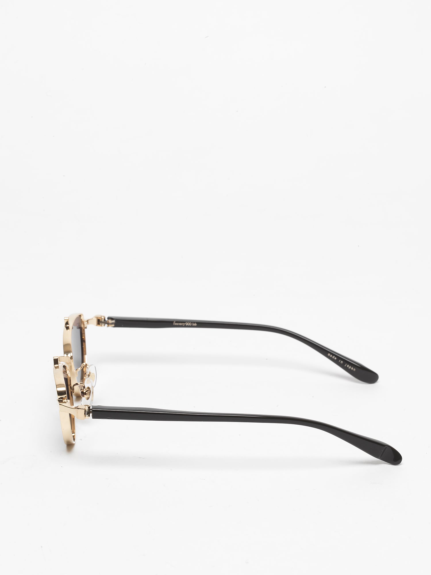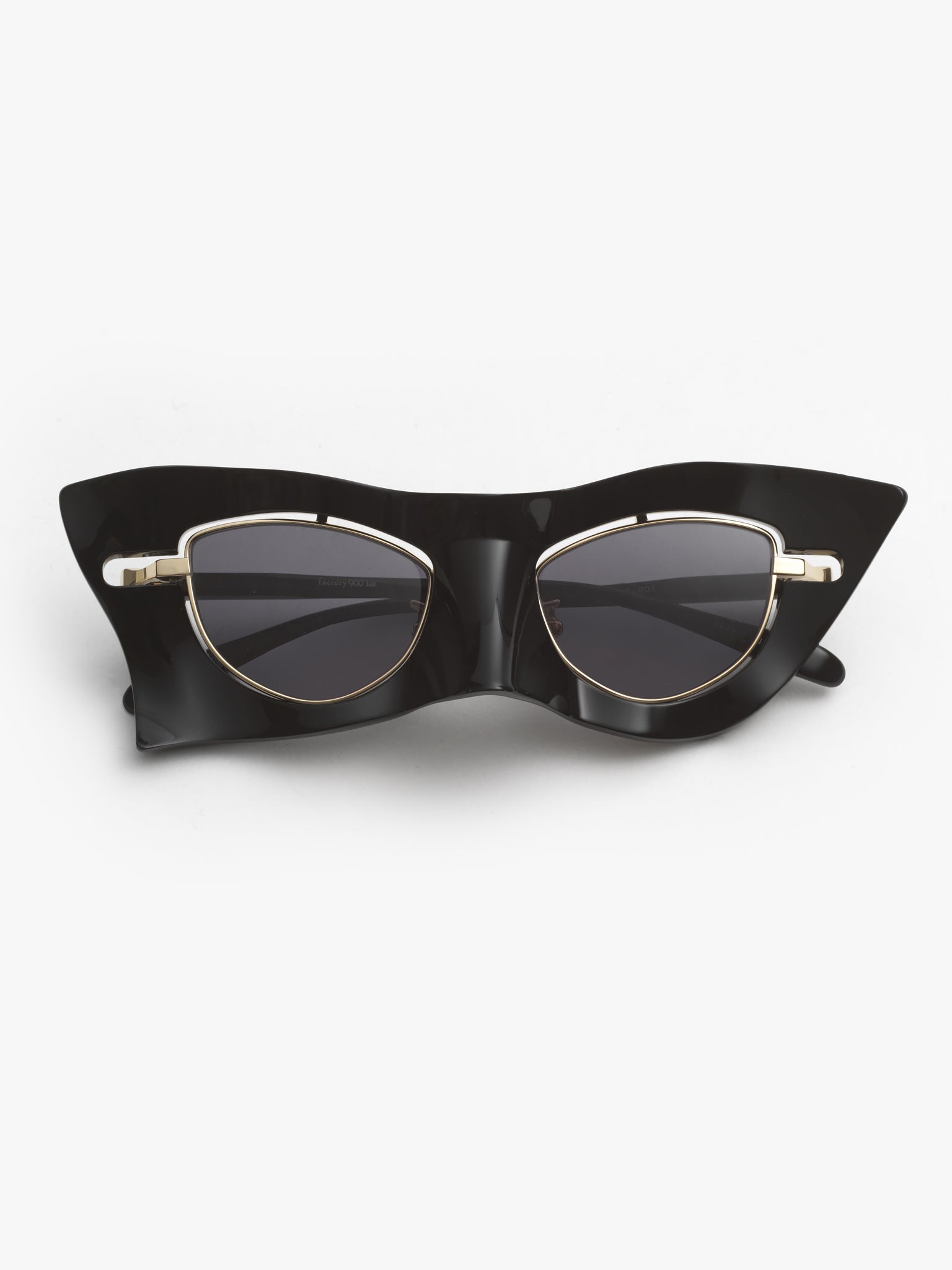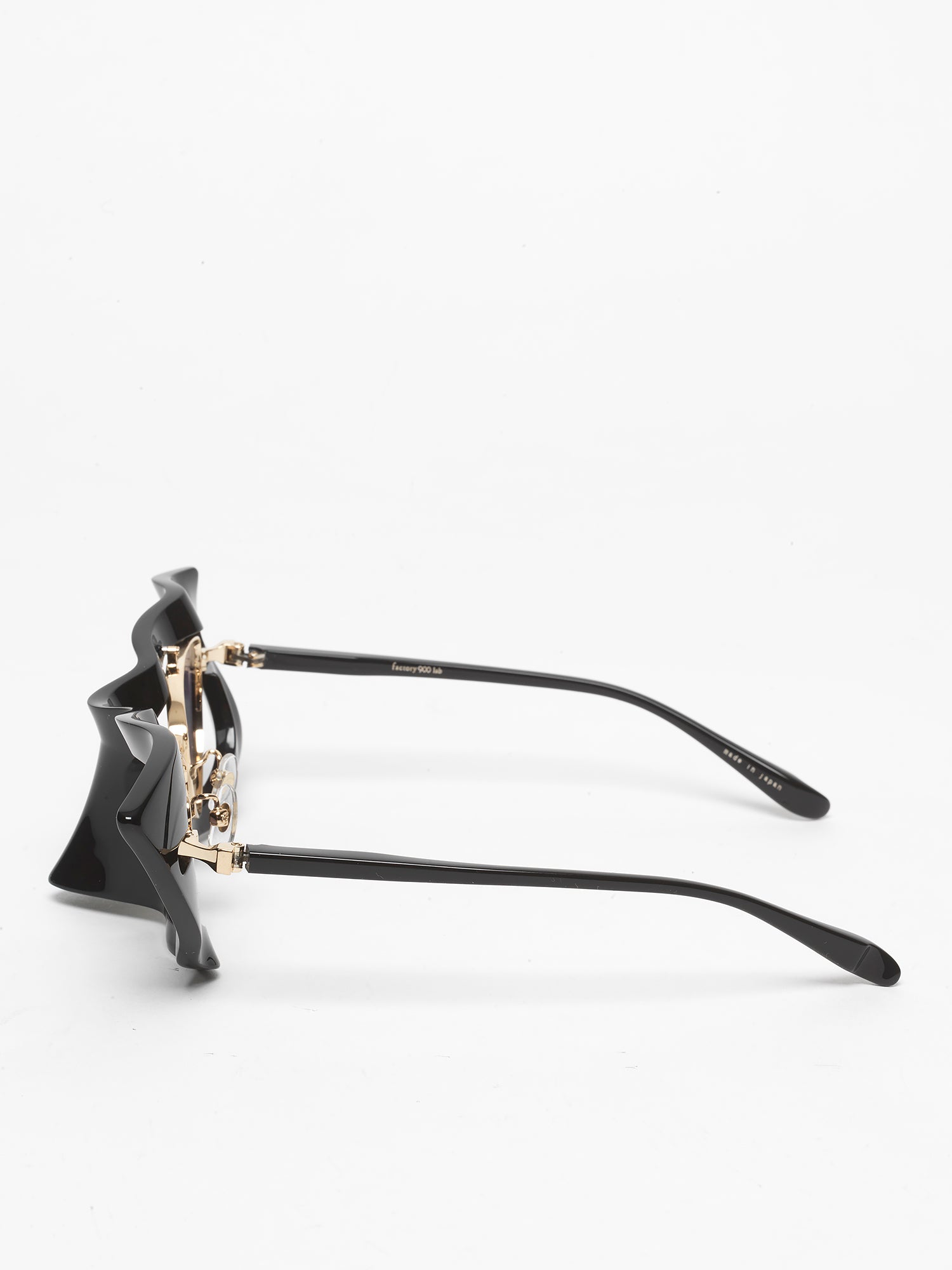 One of a kind: FACTORY 900 sunglasses in black with mask design construction, glossy finish, rimmed lenses paired with dark lenses.
