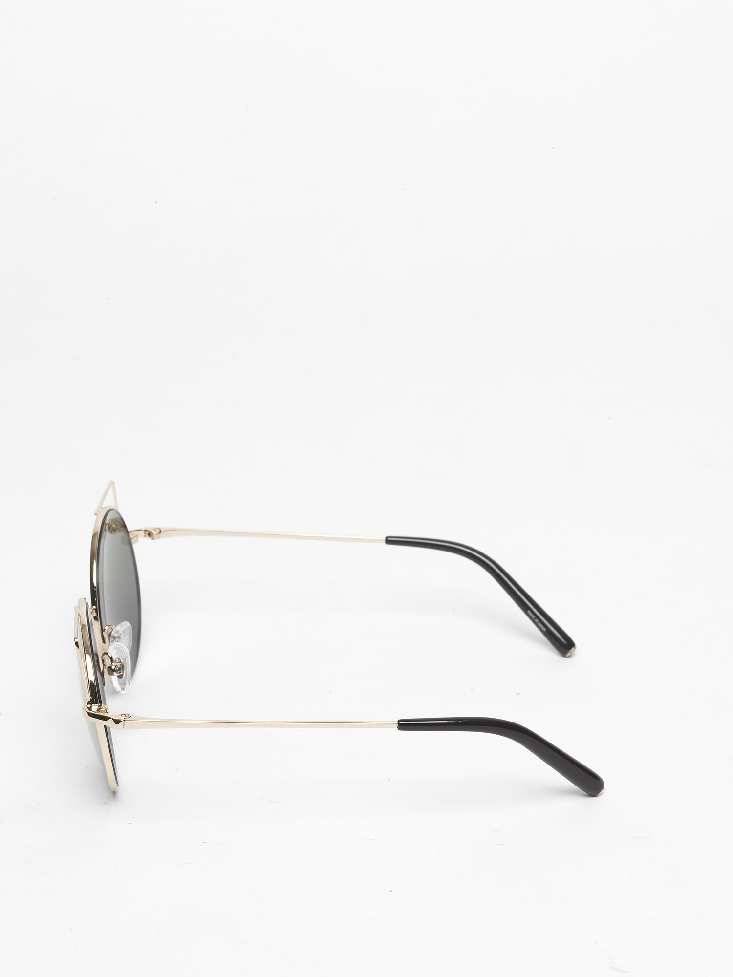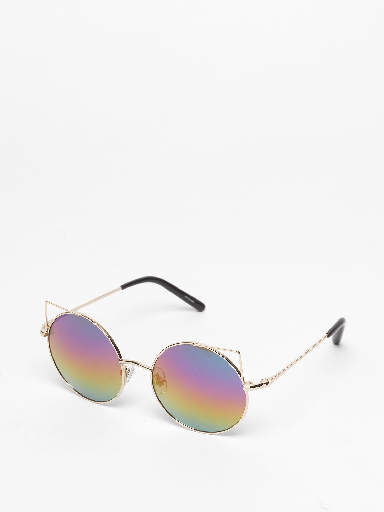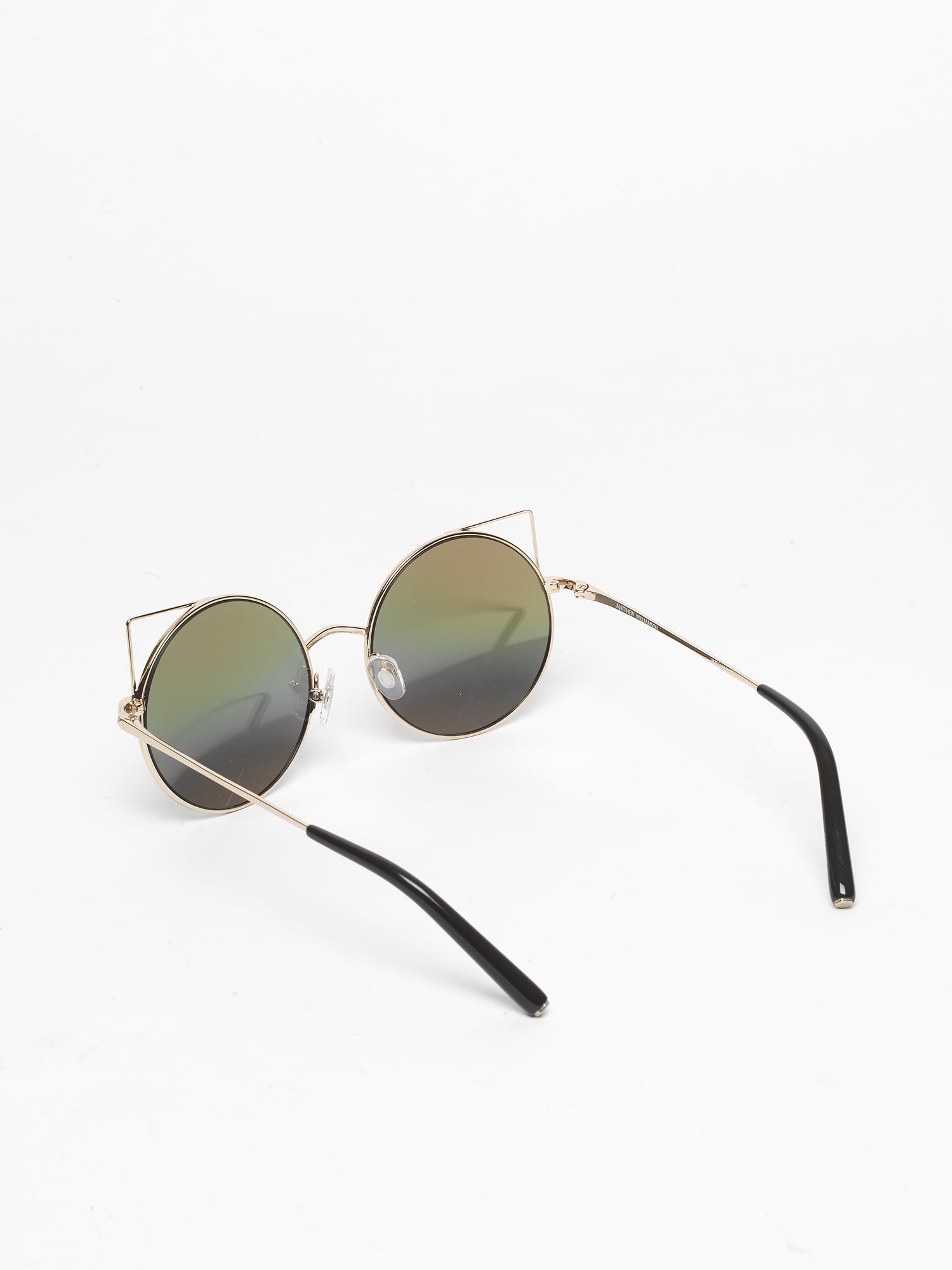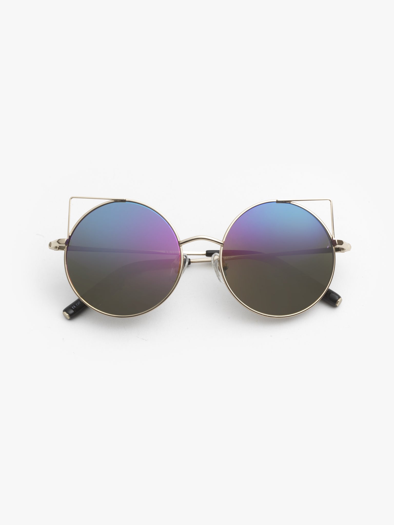 The 122 style is a round-shaped eyewear made from ultra-light metal, featuring subtle cat-eye inspired details while maintaining its core circular form. The frame is finished in a glossy golden hue, paired with mirrored lenses in rainbow colors, which define a signature collection of eyewear by Matthew Williamson.