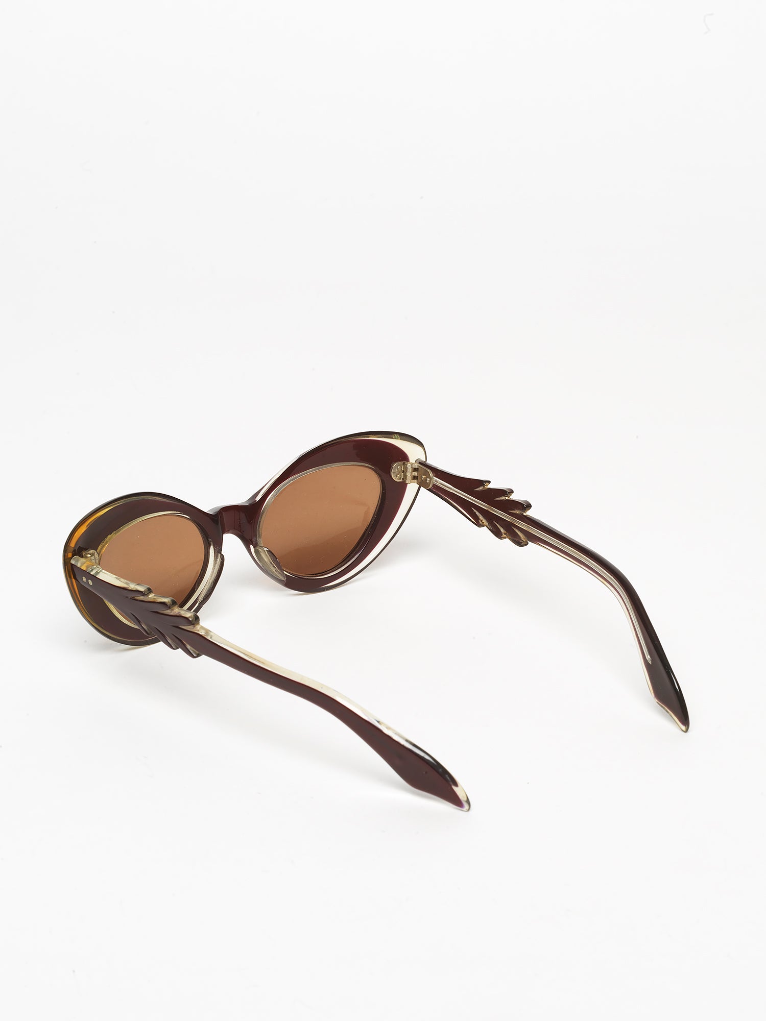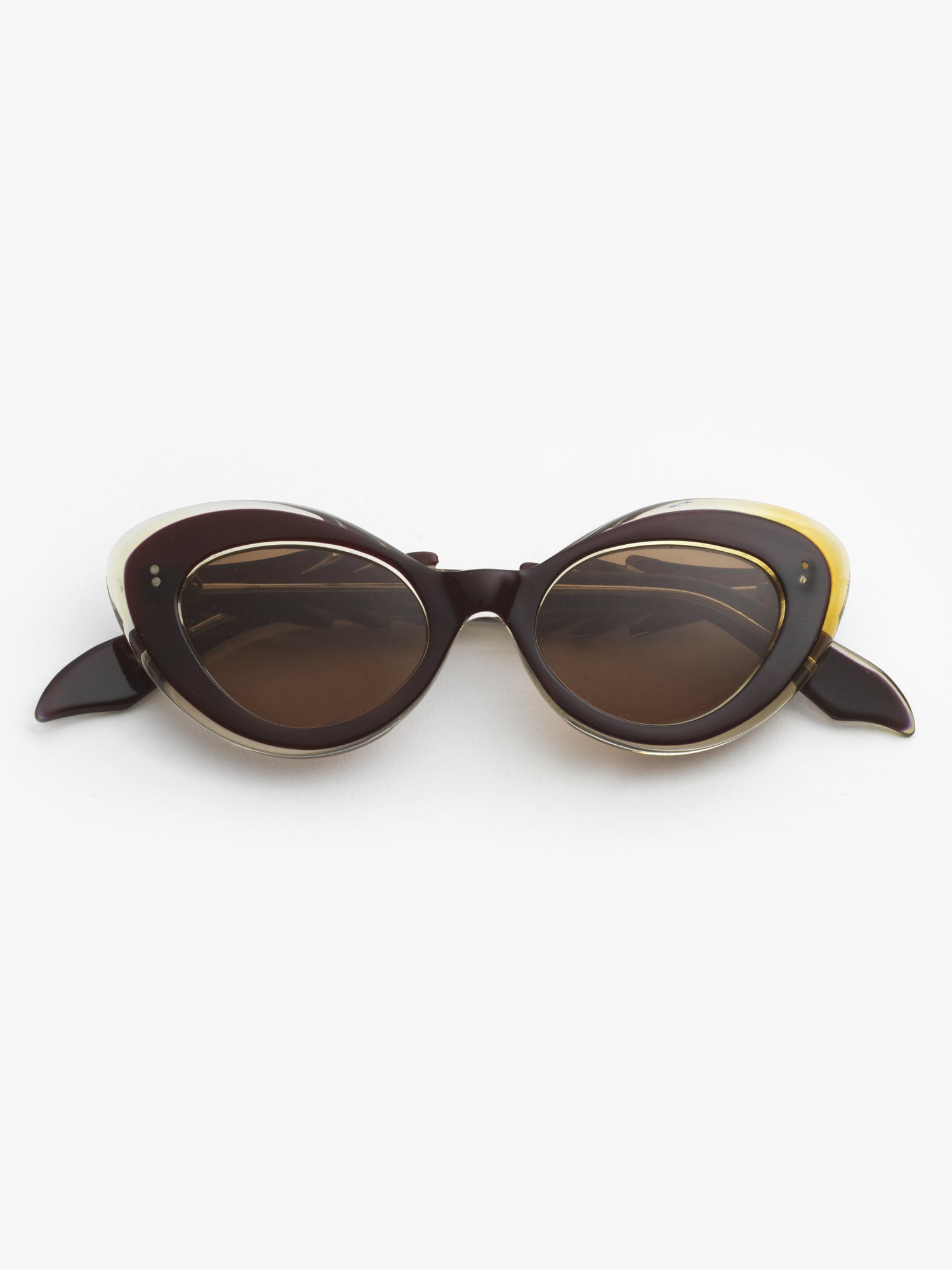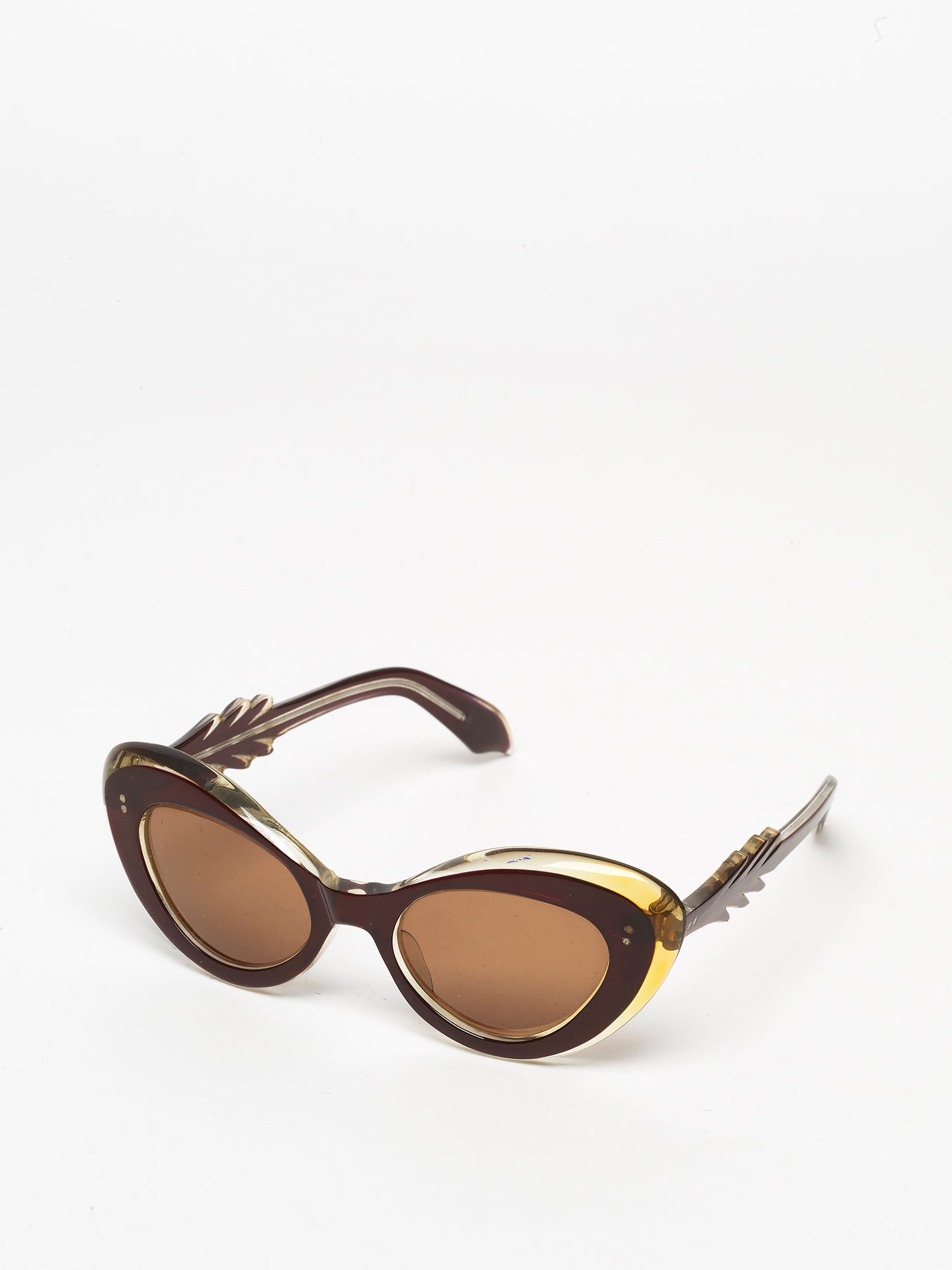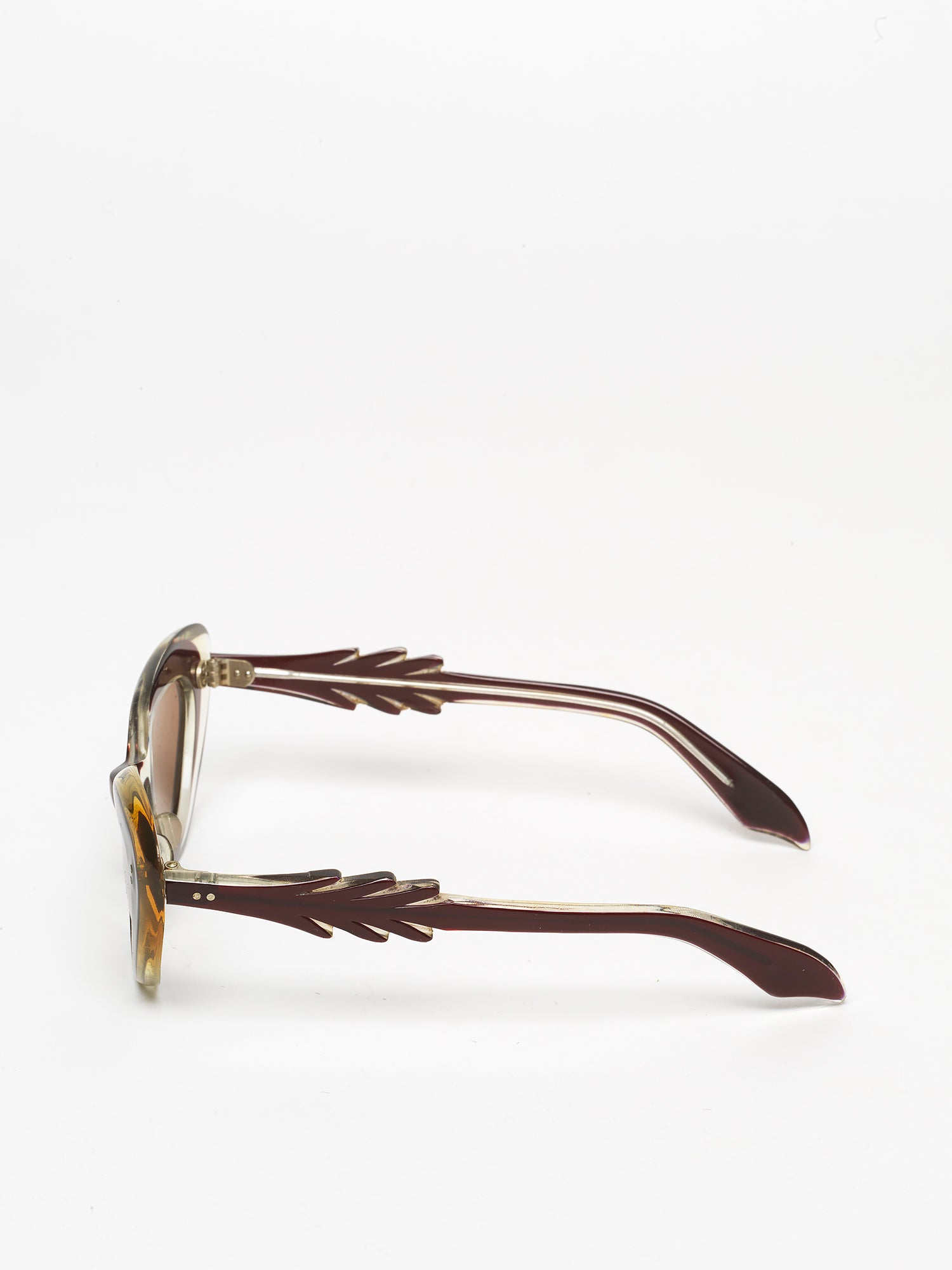 Small and thick cat-eye shape, with a combination of solid and transparent colors. The uniqueness of this piece is also evident in the herringbone pattern on the temples.