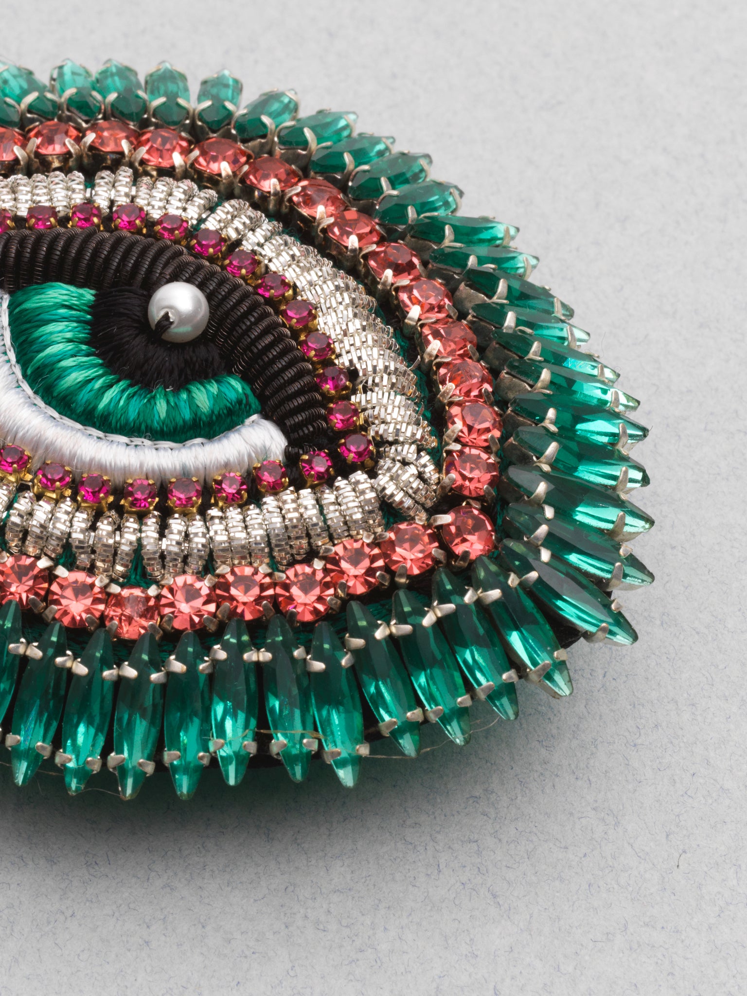Dive into this green look with the Hollywood Eye Brooch, made up of 5 rows of green pearls and rhinestones.