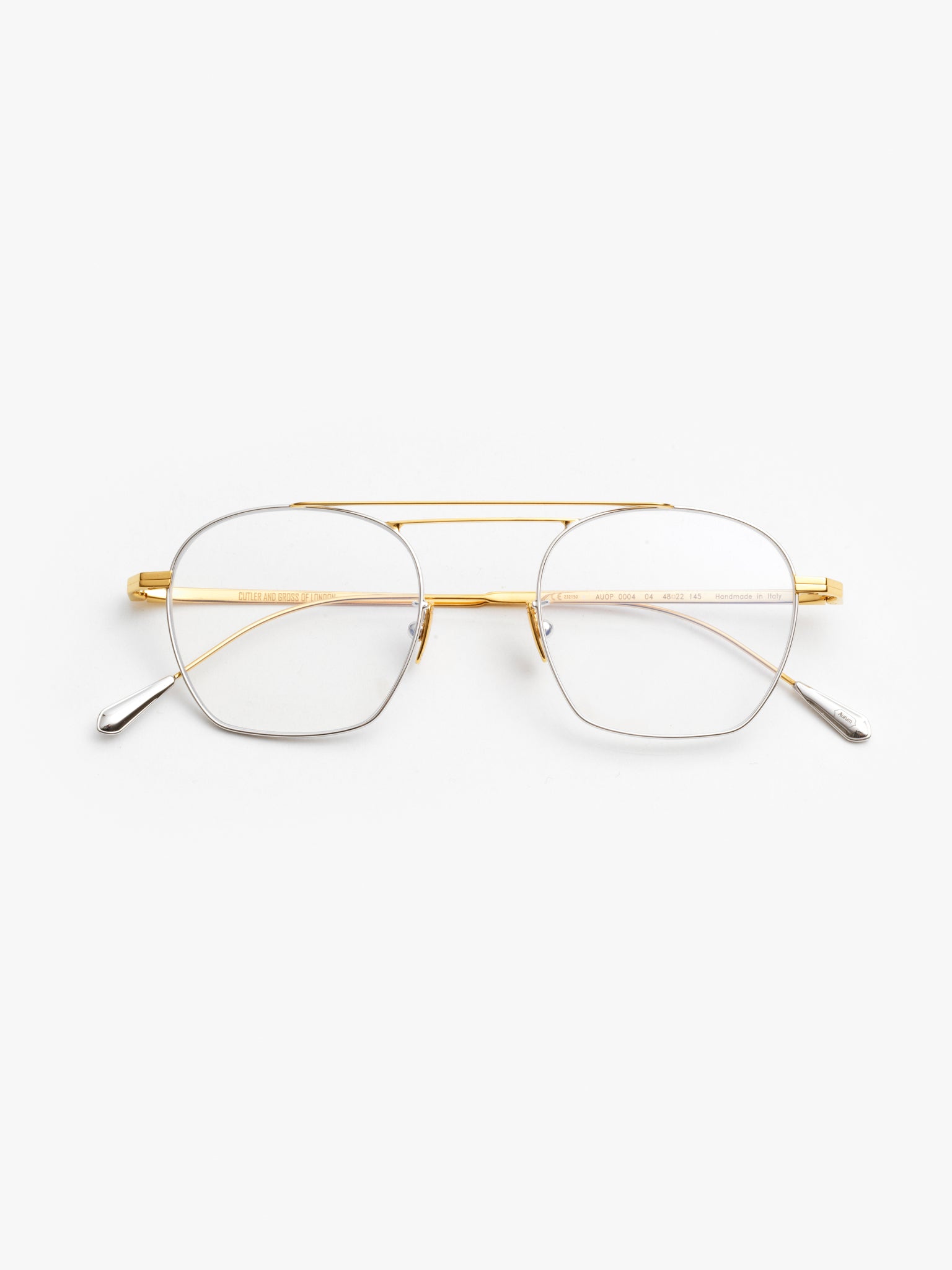 The 0004 frame presents a subtle update on the classic navigator frame, sculpted with octagonal edges and a double browline. It's handcrafted in Italy from polished precious metals to an ultra-light design.