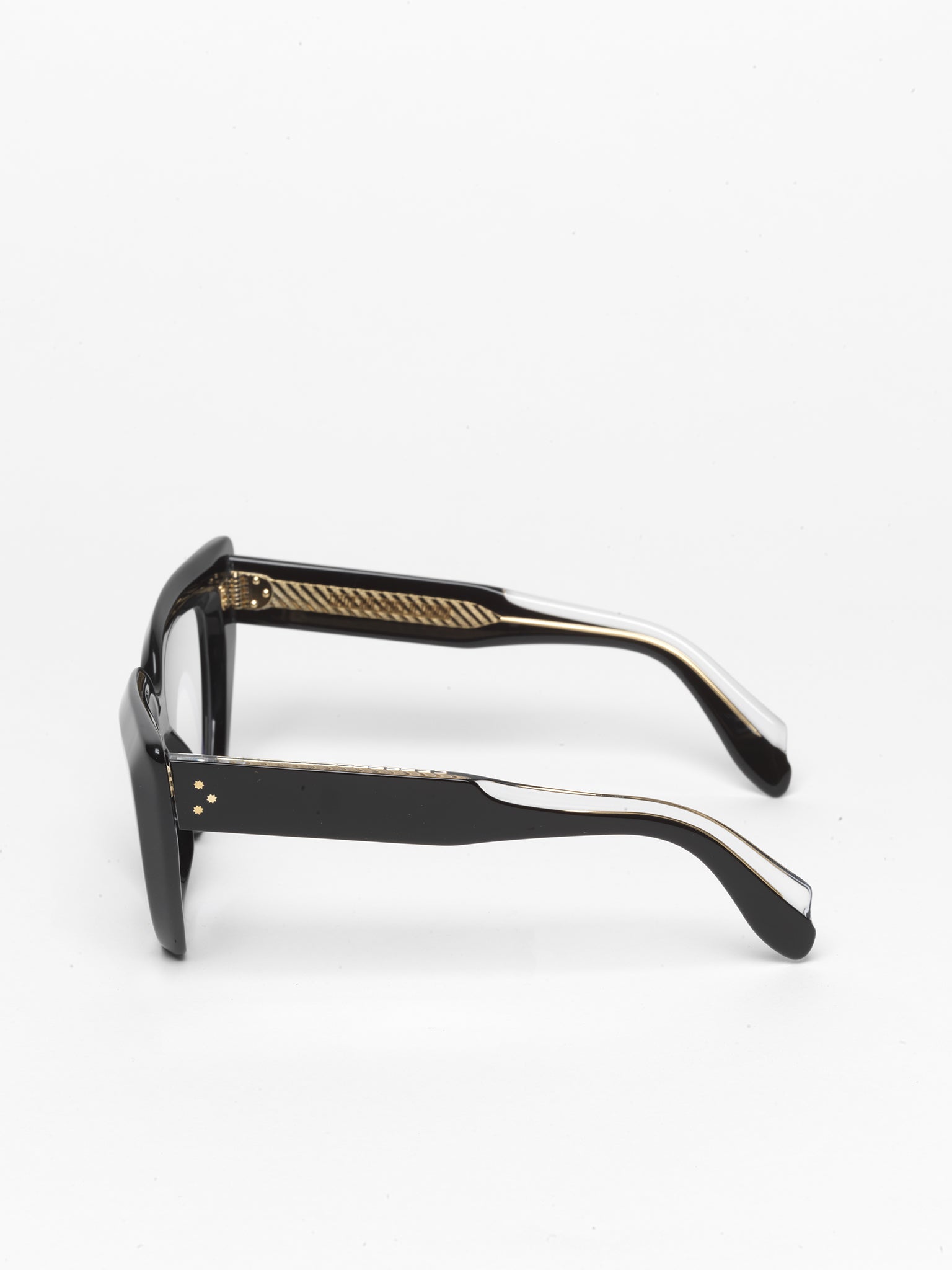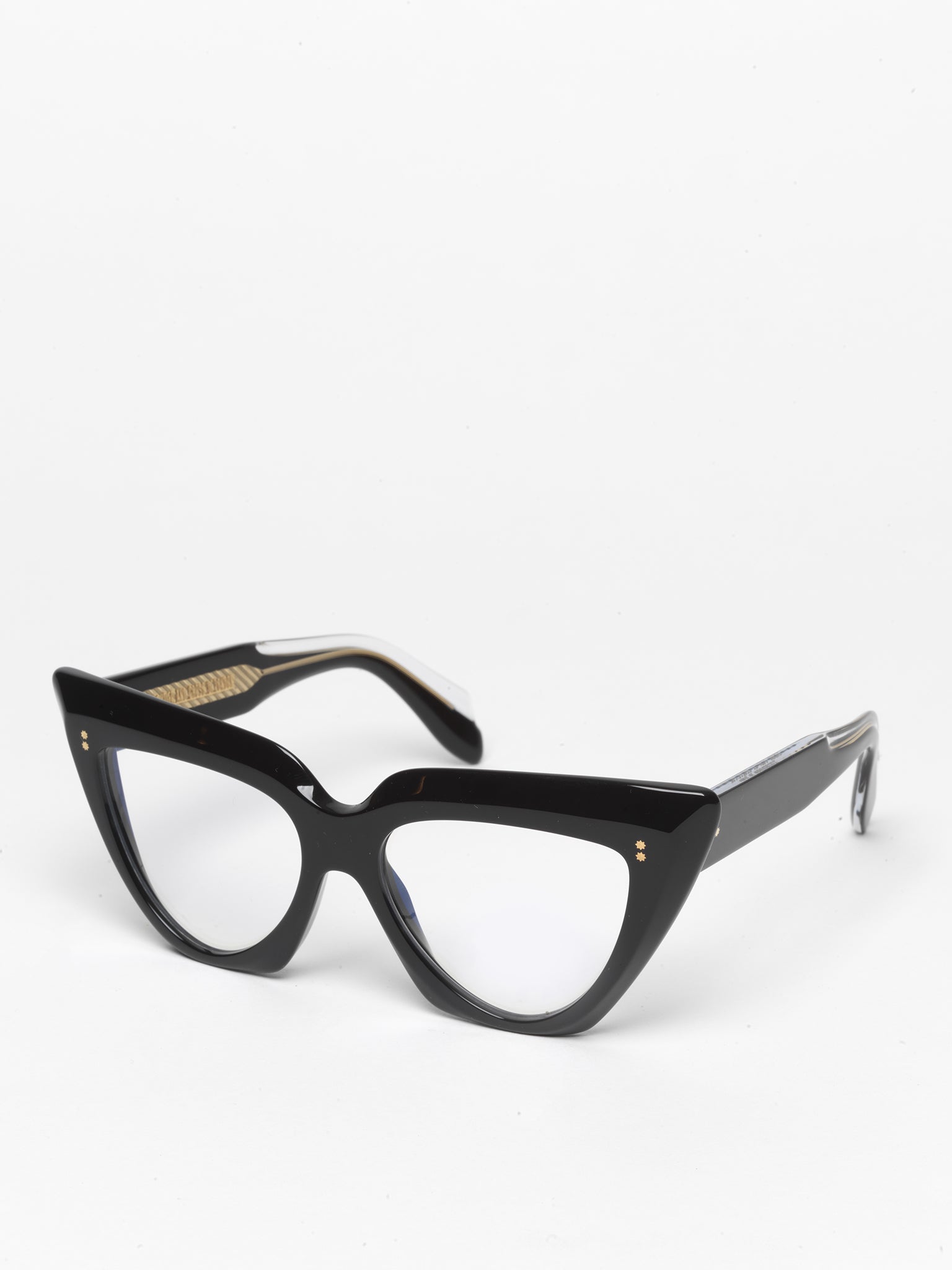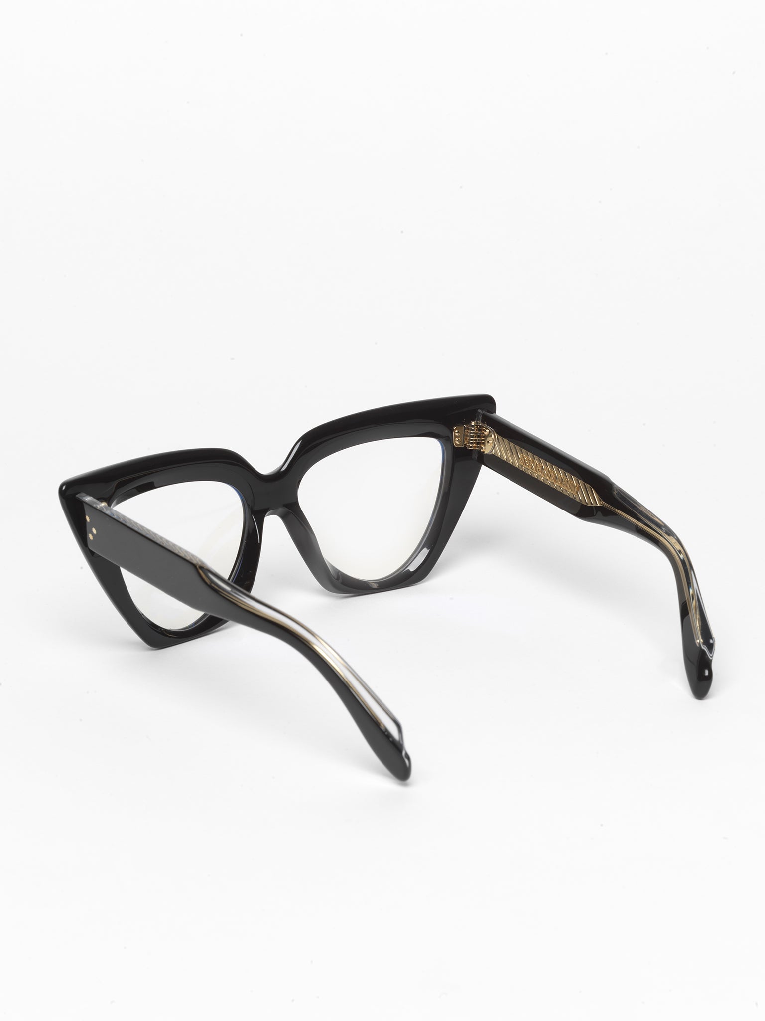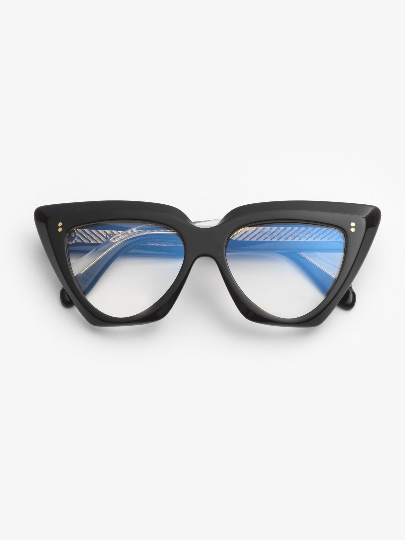 A maximalist take on the cat-eye – the 1407 optical is shaped with a high stepped browline that drops to a rounded base. The split-layer construction adds luminosity, tempering pigmented black acetate with crystal edges. It's sculpted with bevelling and accented with polished compass star pins.