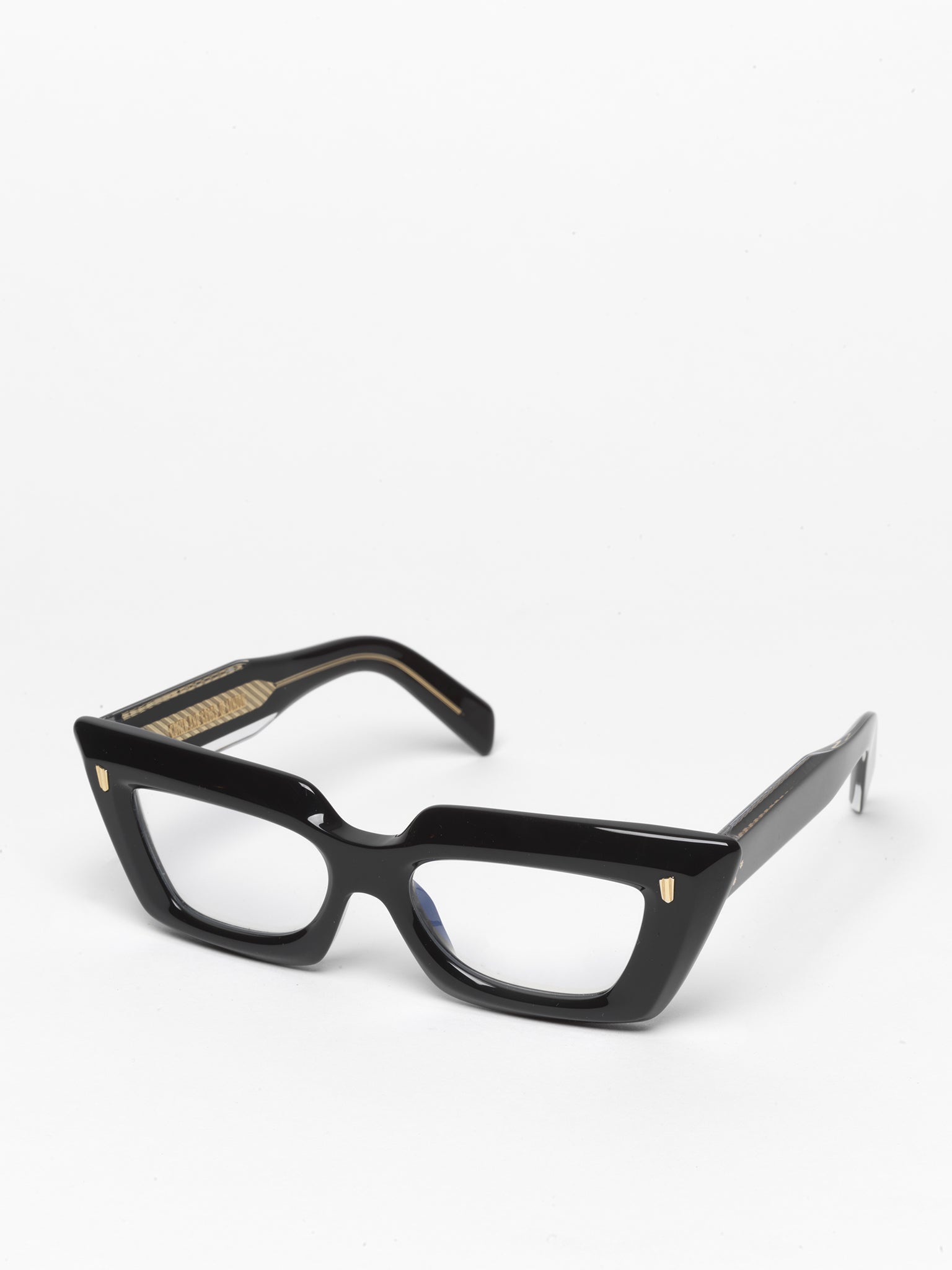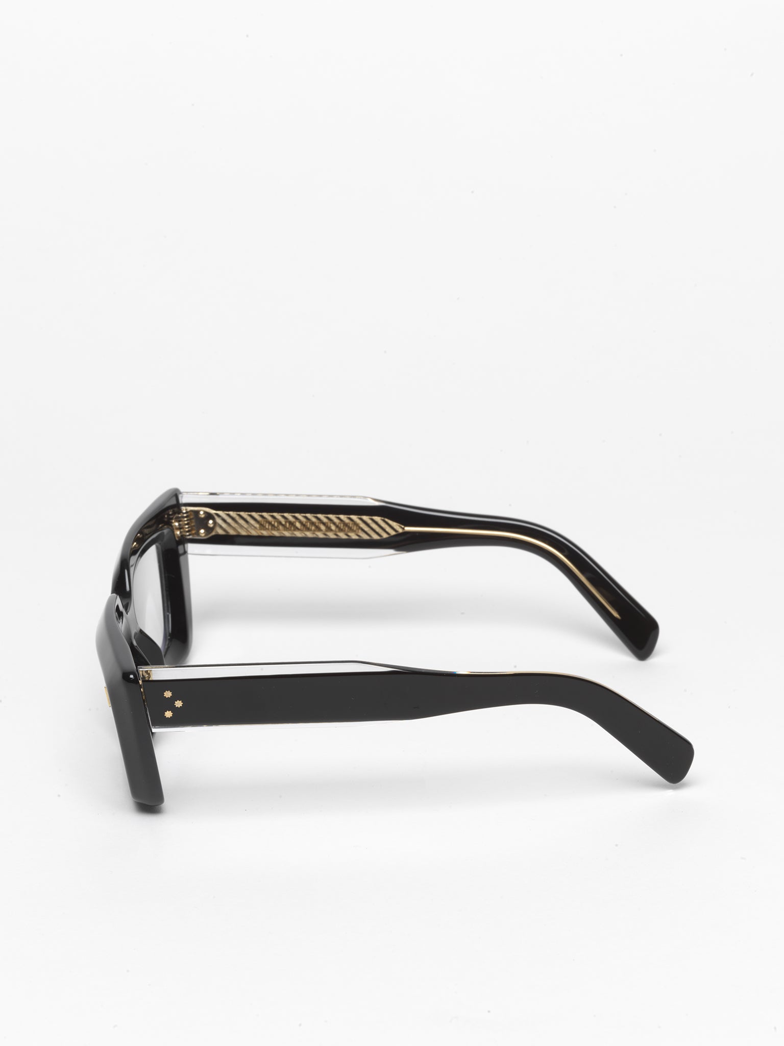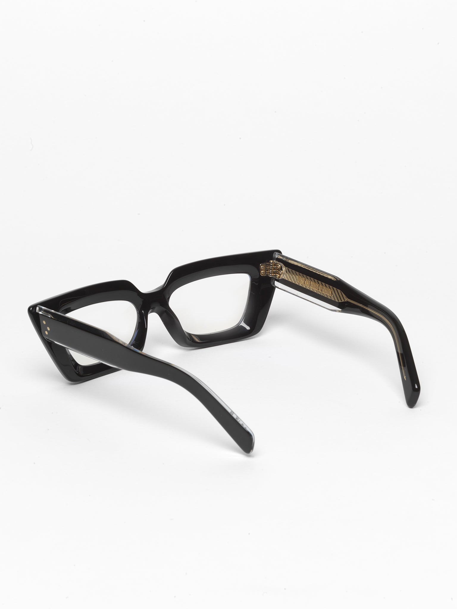 The 1408 frame transforms 90s optics into the here and now. It's shaped into a mini cat-eye silhouette with a split-layer construction that juxtaposes pigmented black acetate with crystal edges. Chamfering adds depth to the design, which is accented with polished oyster and compass star pins.
