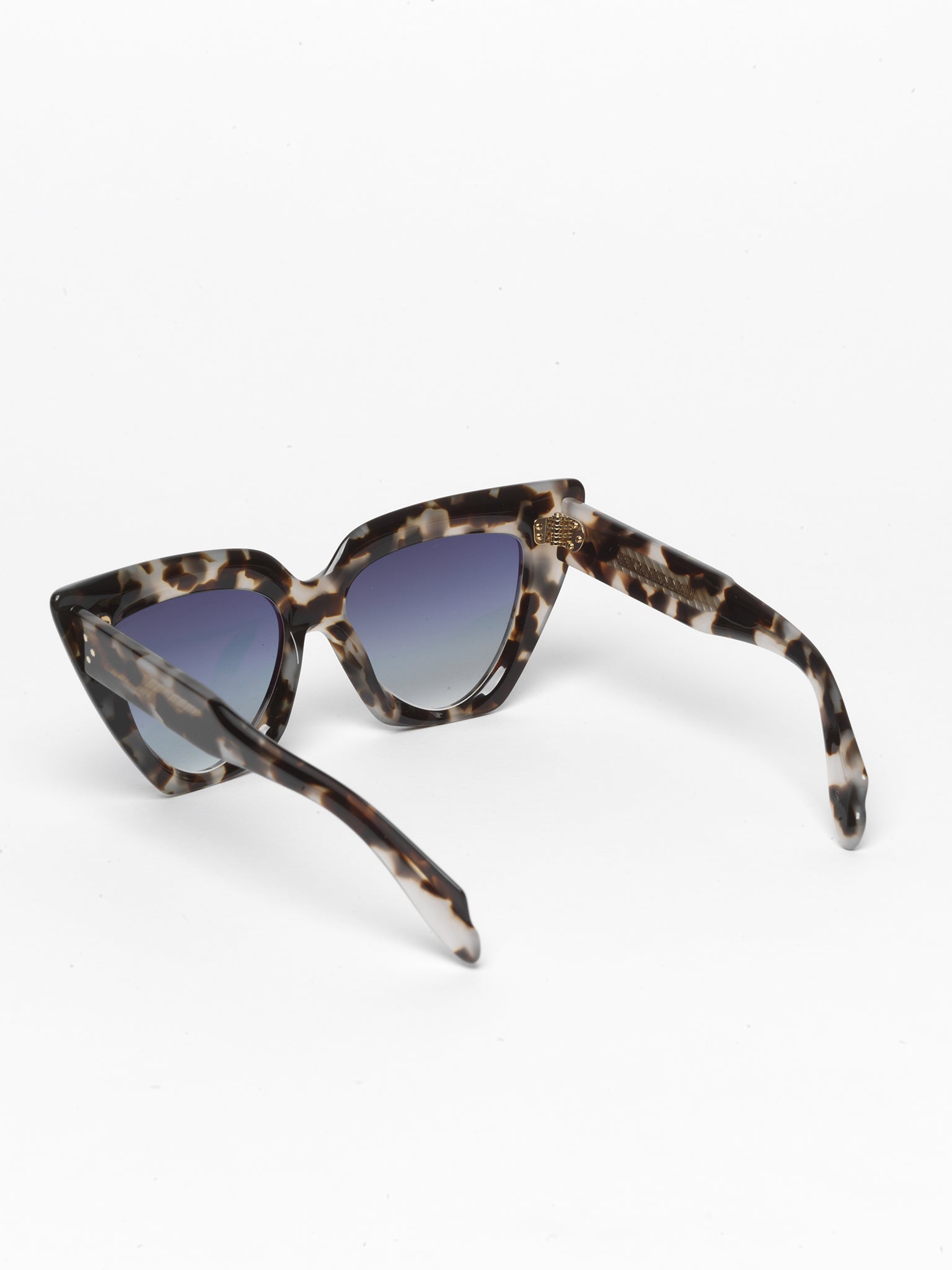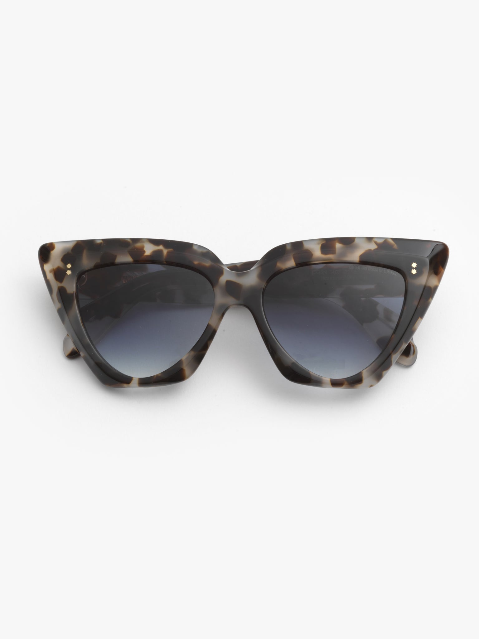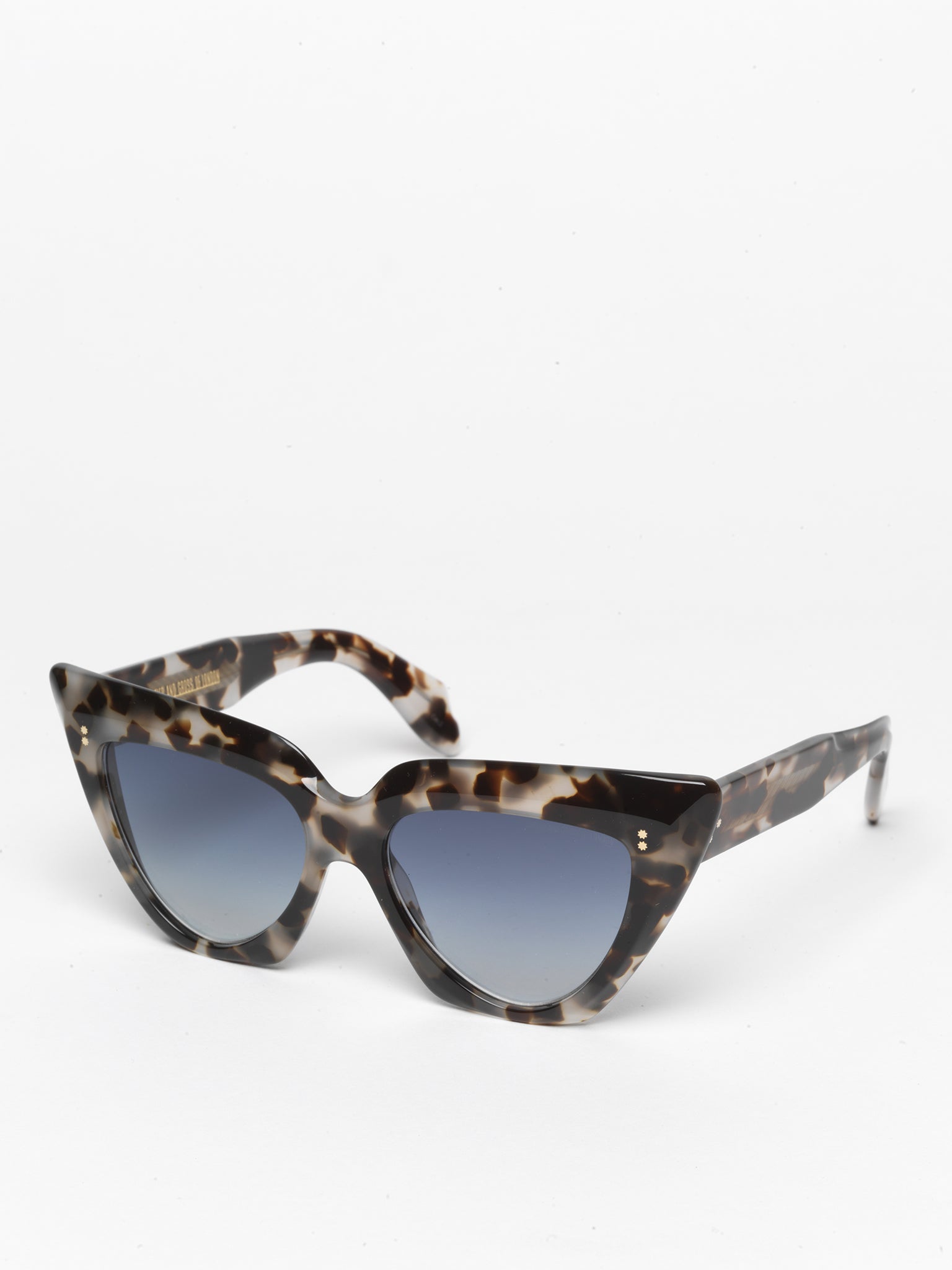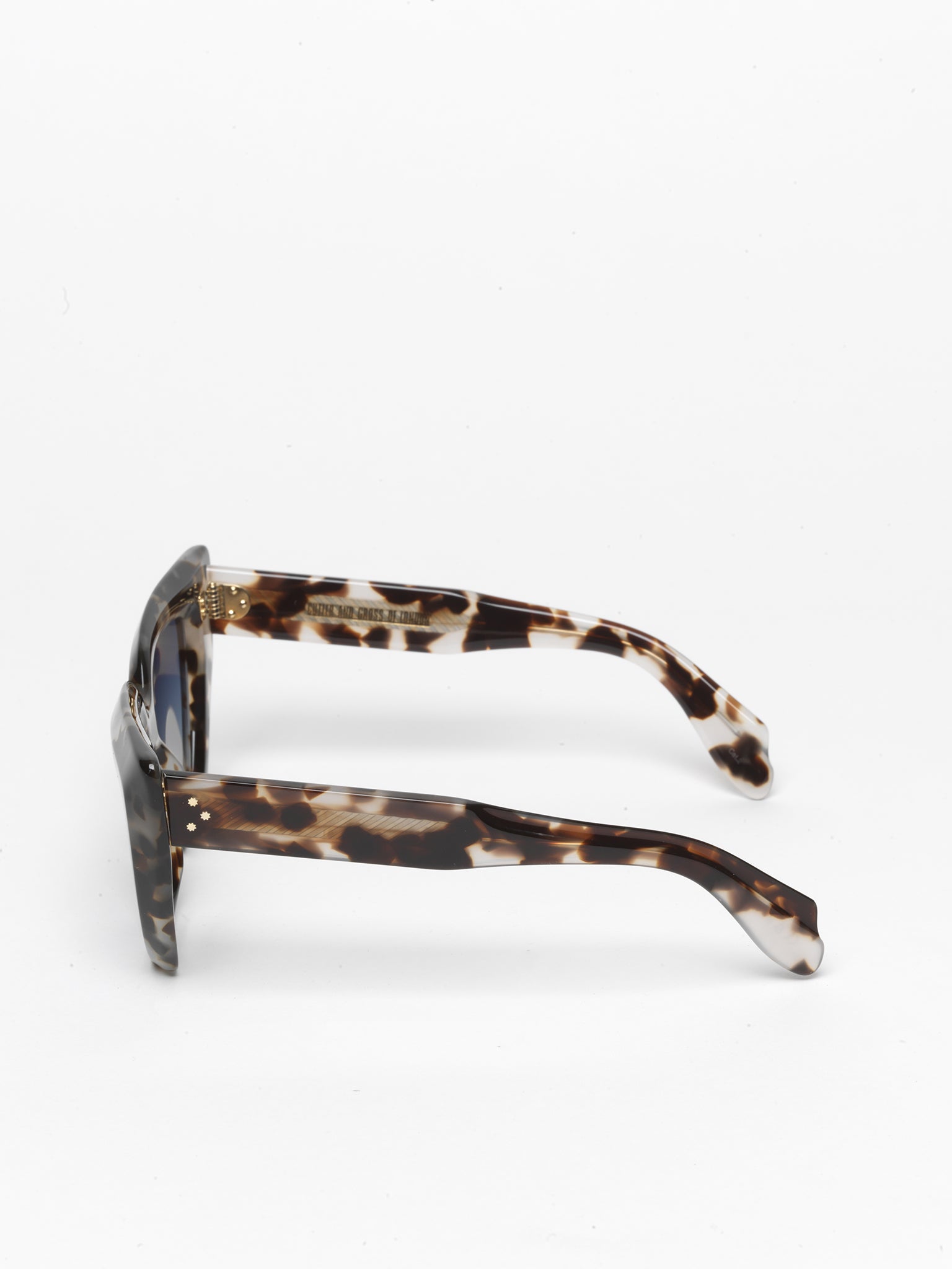 Sculpted with a high stepped browline that plunges to a rounded base, the 1407 is a magnified take on the cat-eye sunglass. The split-layer construction adds luminosity to the design, which is detailed with house signatures: Hazard core wire and Compass Star pins. It's sculpted with bevelled edges and culminates in Fender tips.
