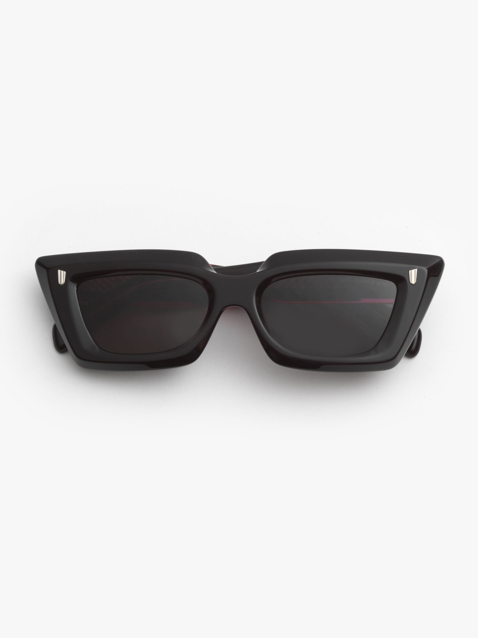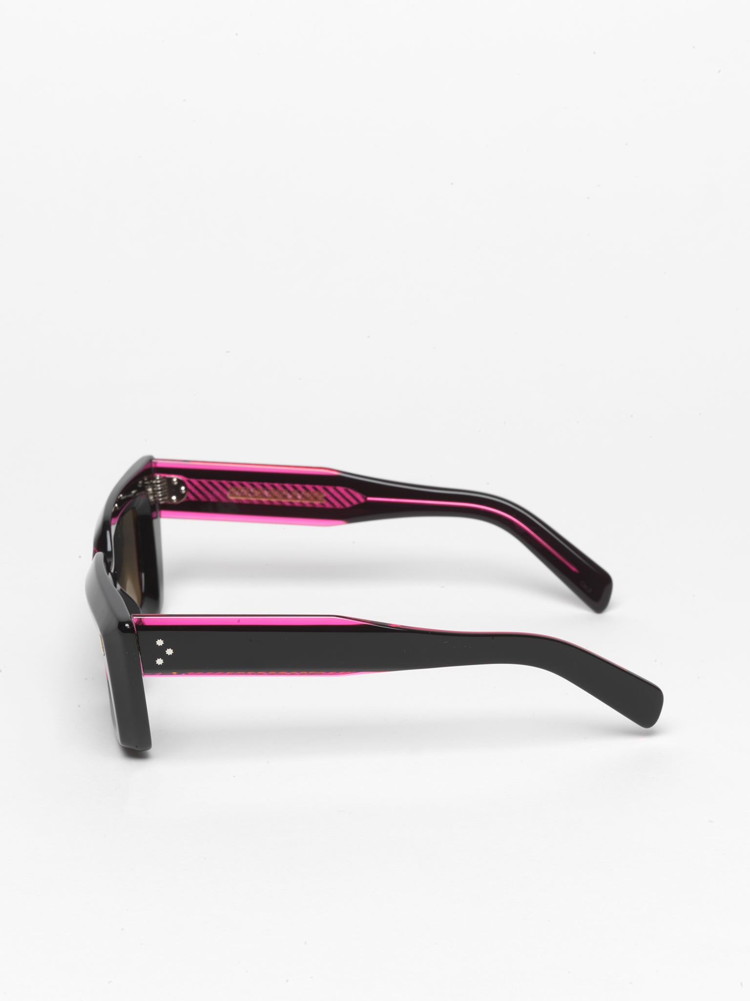 The 1408 frame transforms 90s optics into the here and now. It's shaped into a mini cat-eye silhouette with a split-layer construction that juxtaposes pigmented black acetate with pink edges. Chamfering adds depth to the design, which is accented with polished oyster and compass star pins.