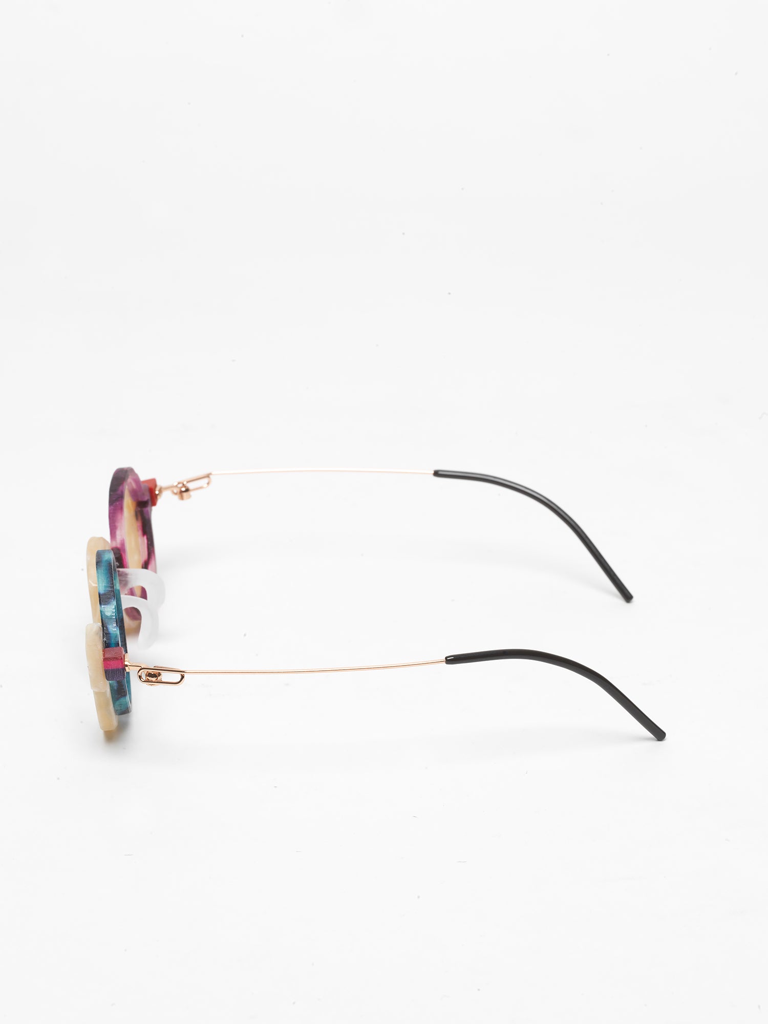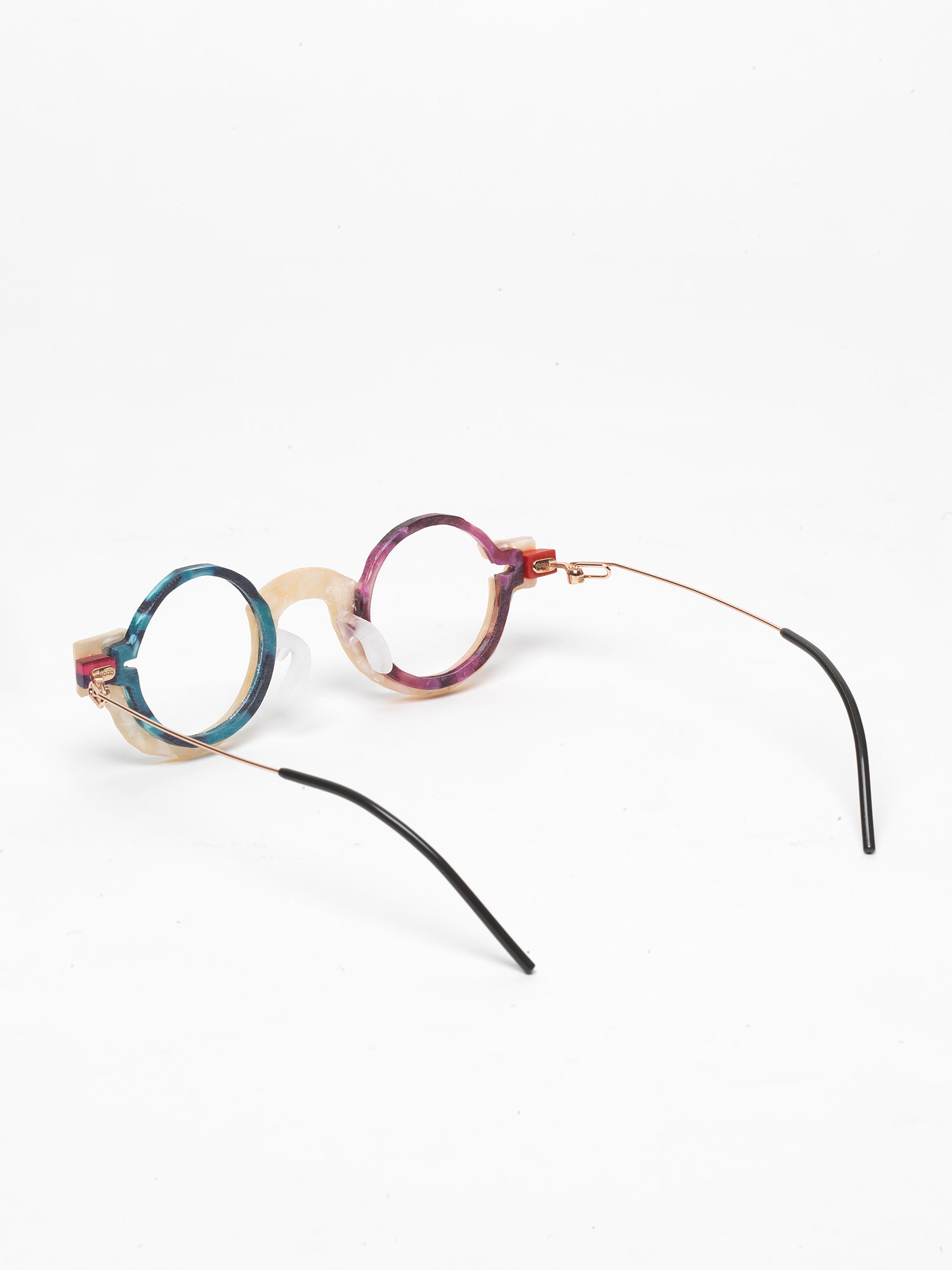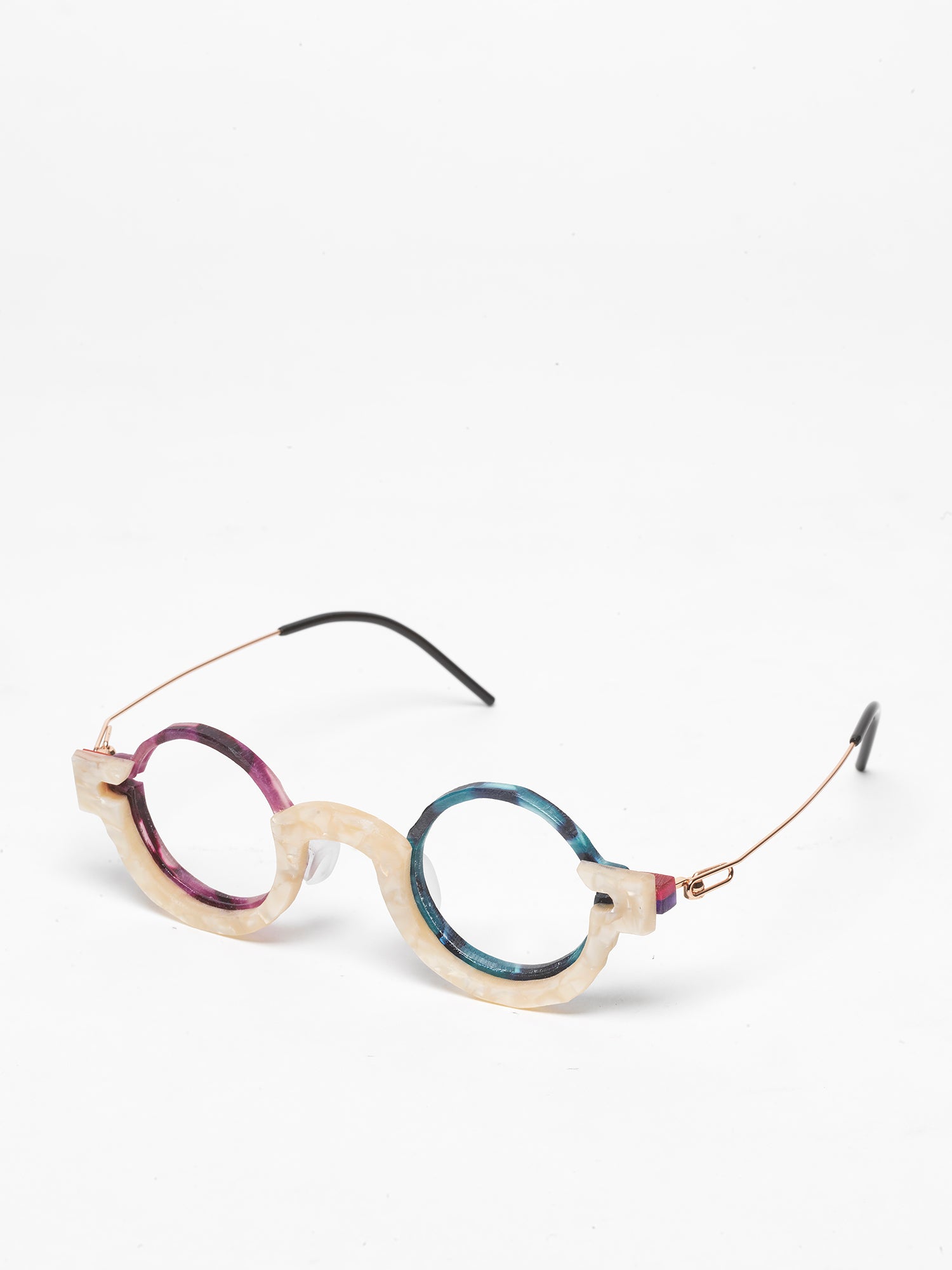 - mother-of-pearl cellulose acetate frame, with chromatic additions in marbled purple and blue