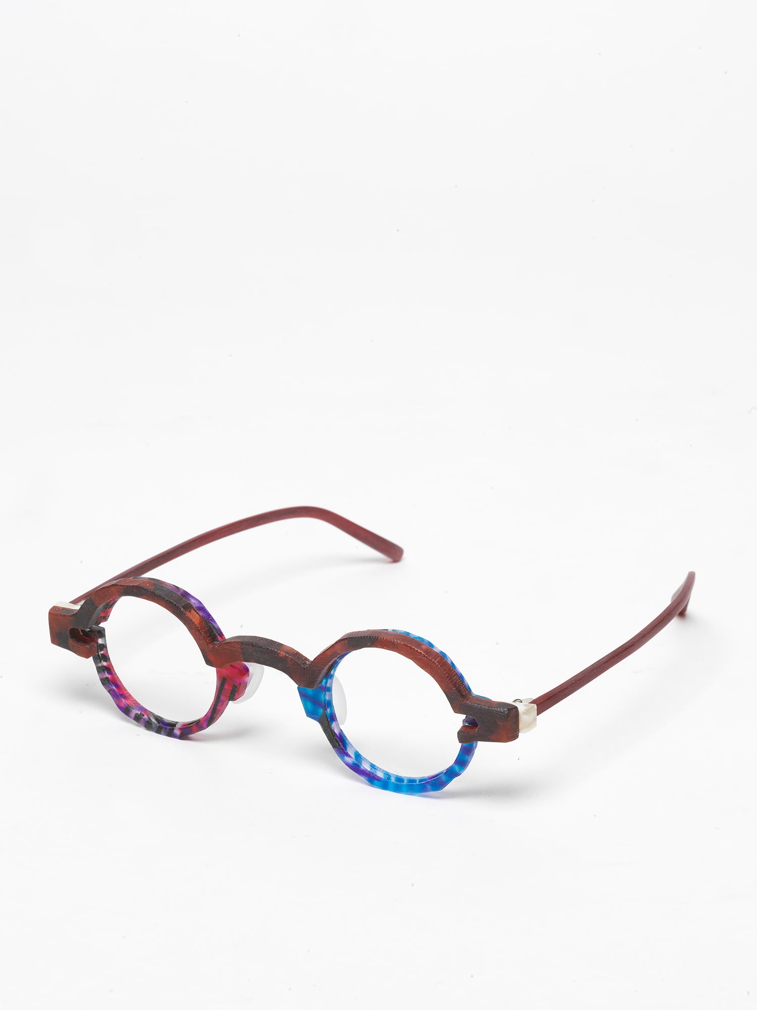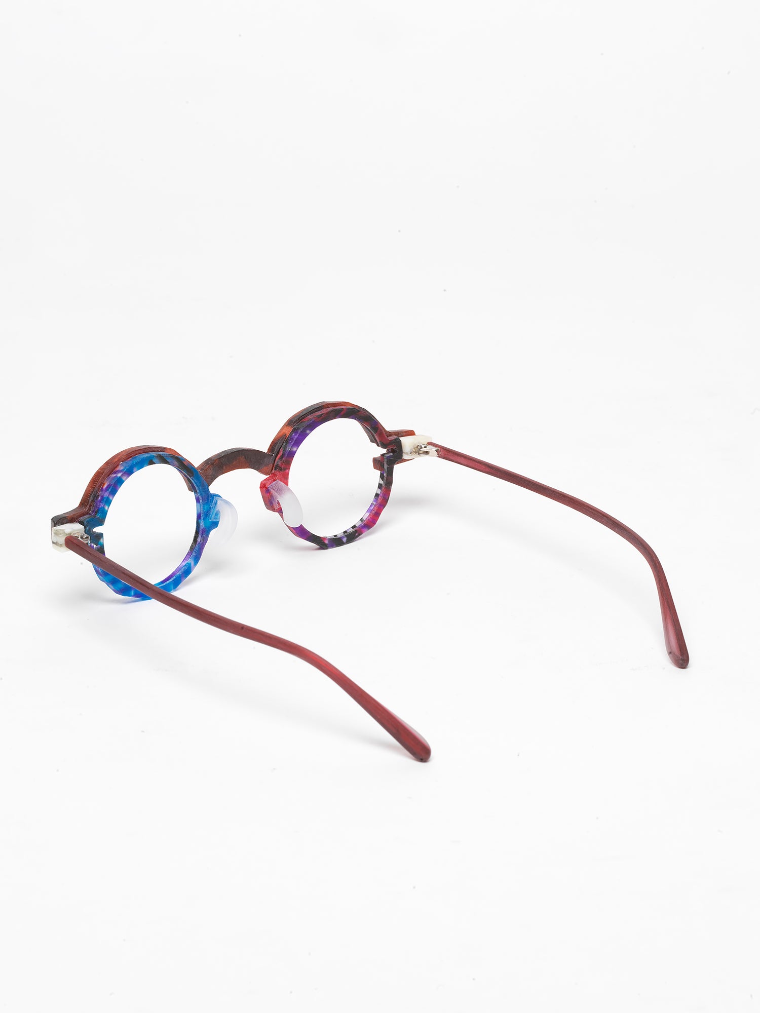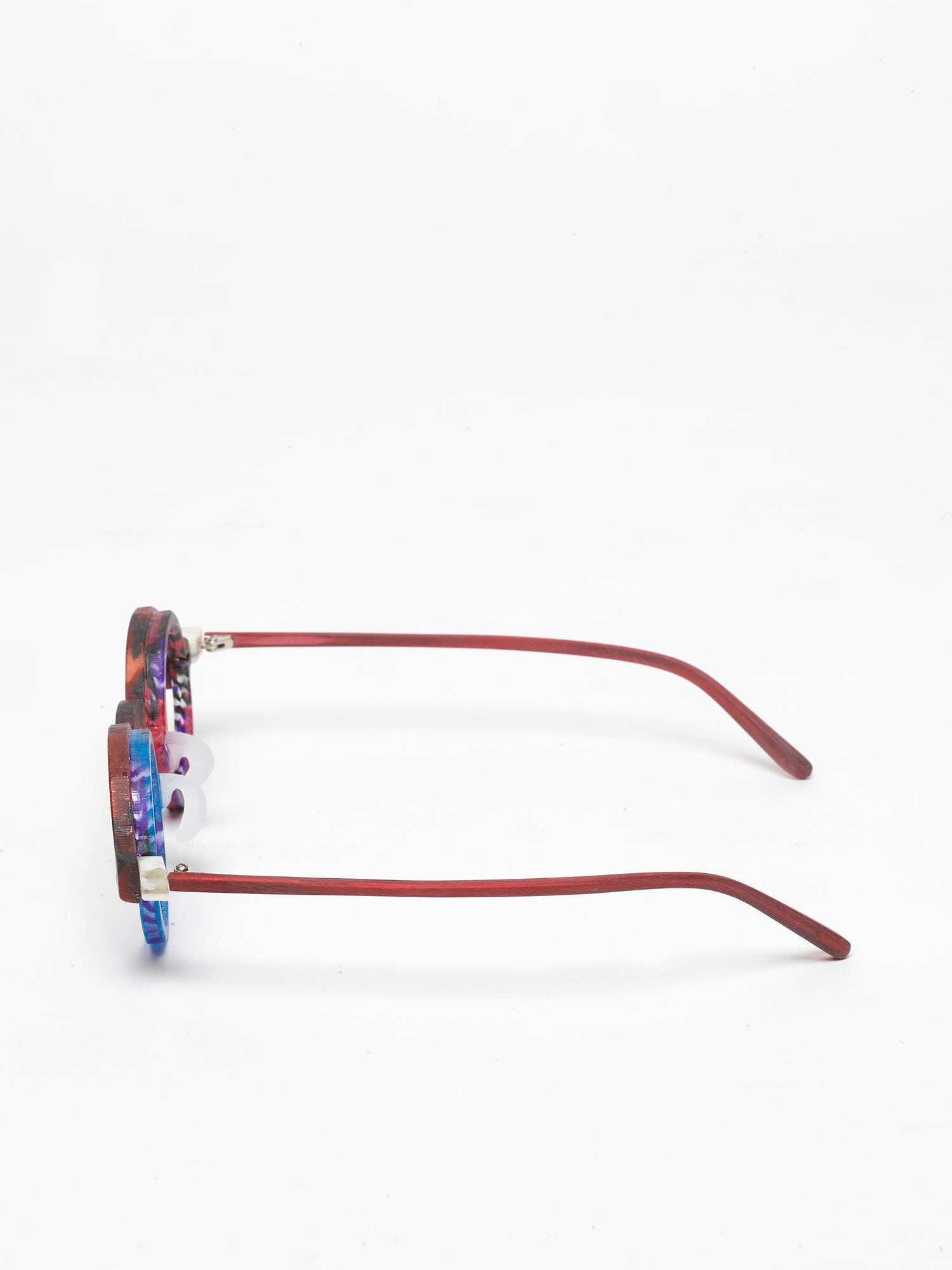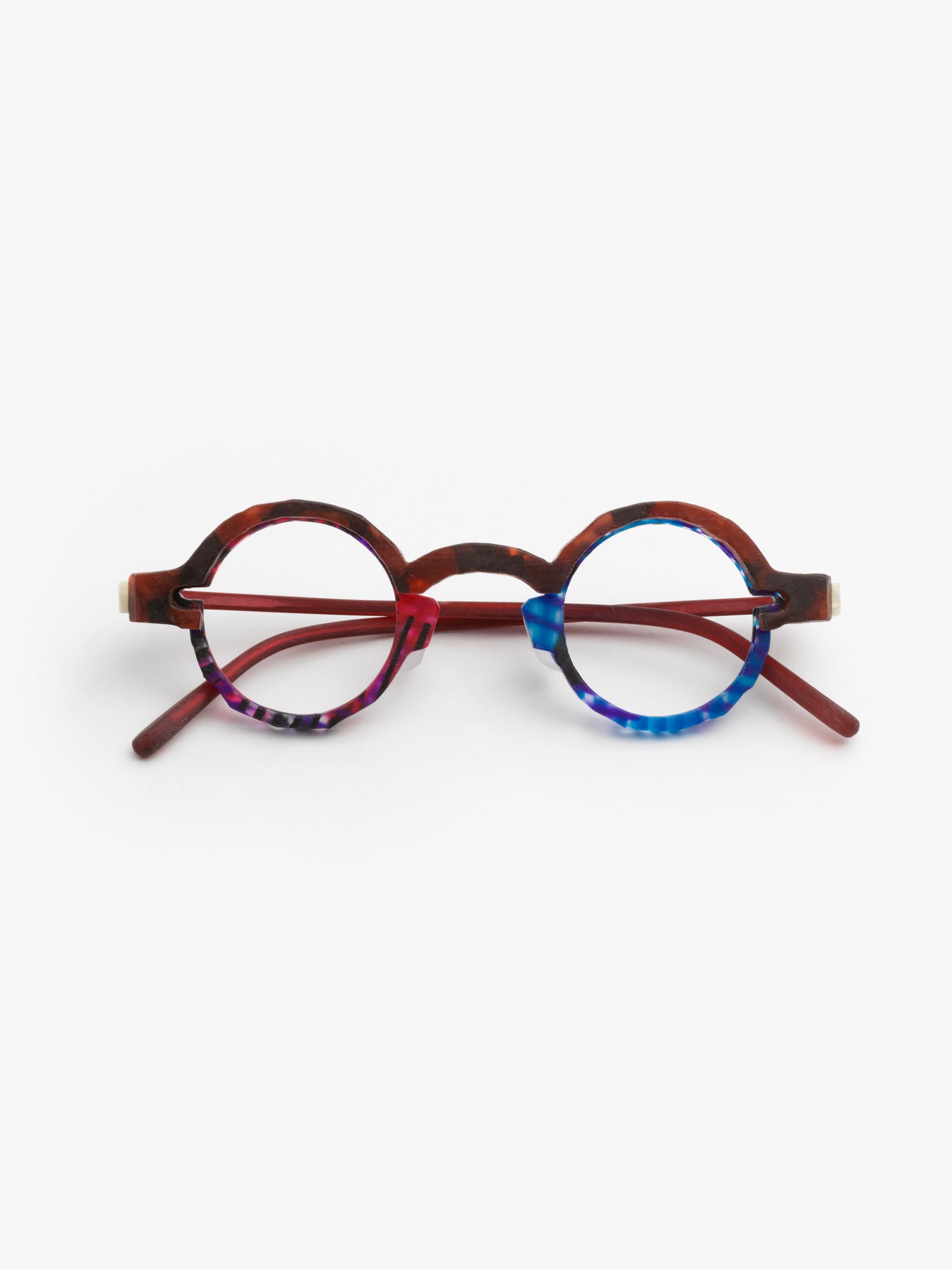 - dark red tortoise cellulose acetate frame, with chromatic additions in purple and bright blue
