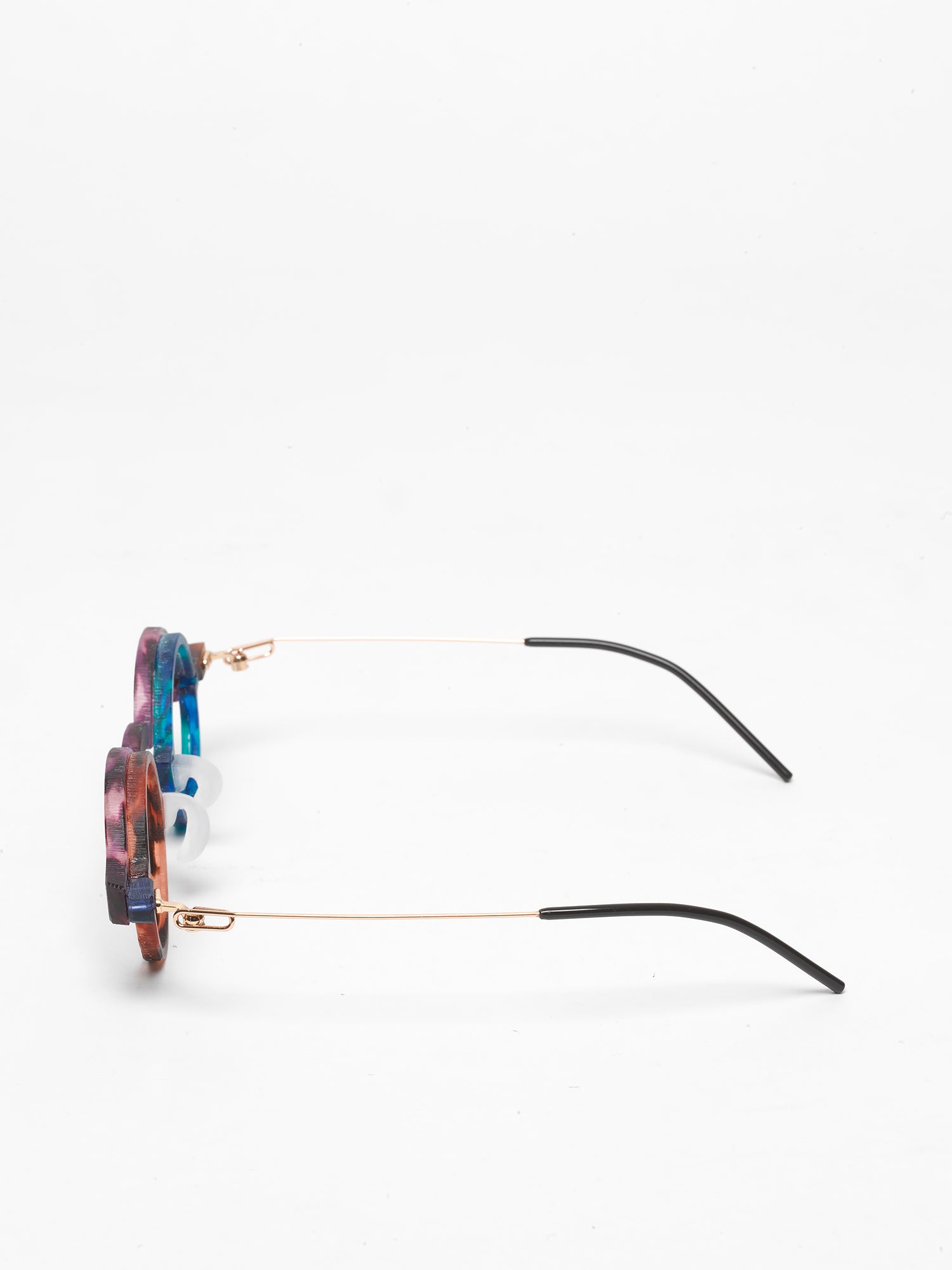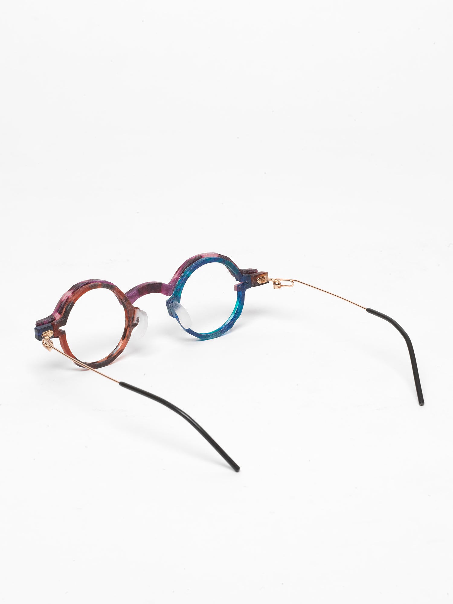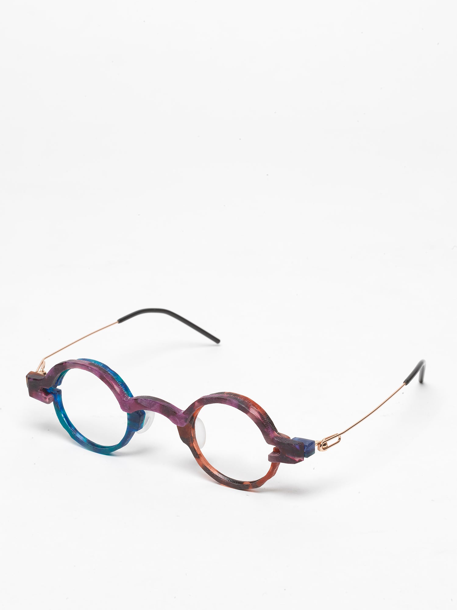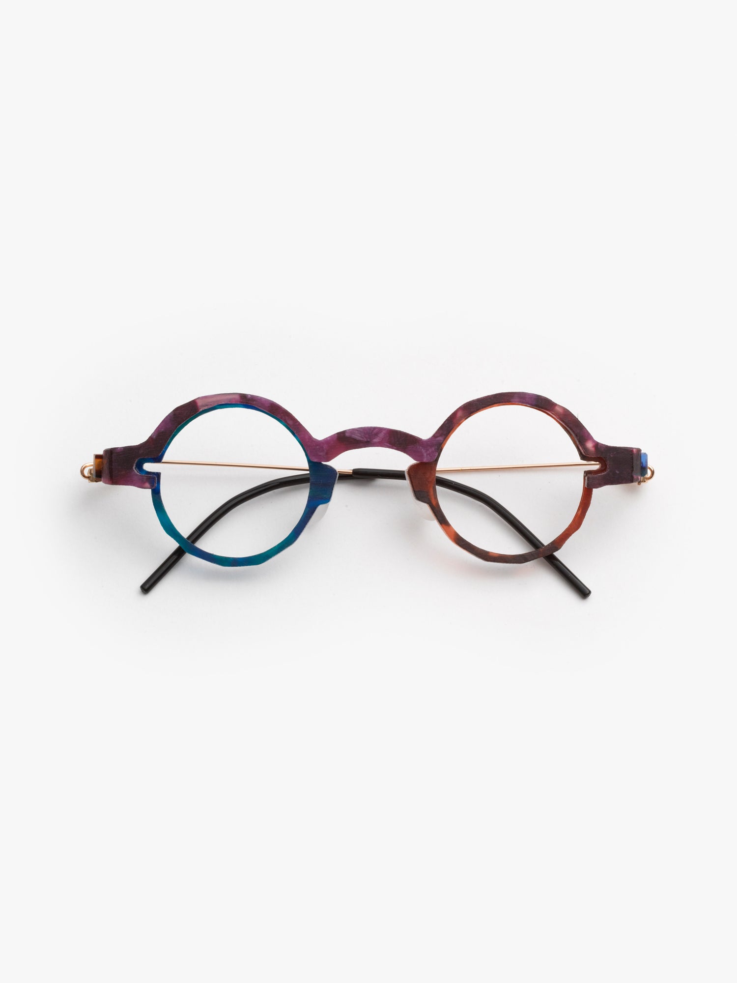 - purple tortoise cellulose acetate frame, with chromatic additions in marbled green and tortoise