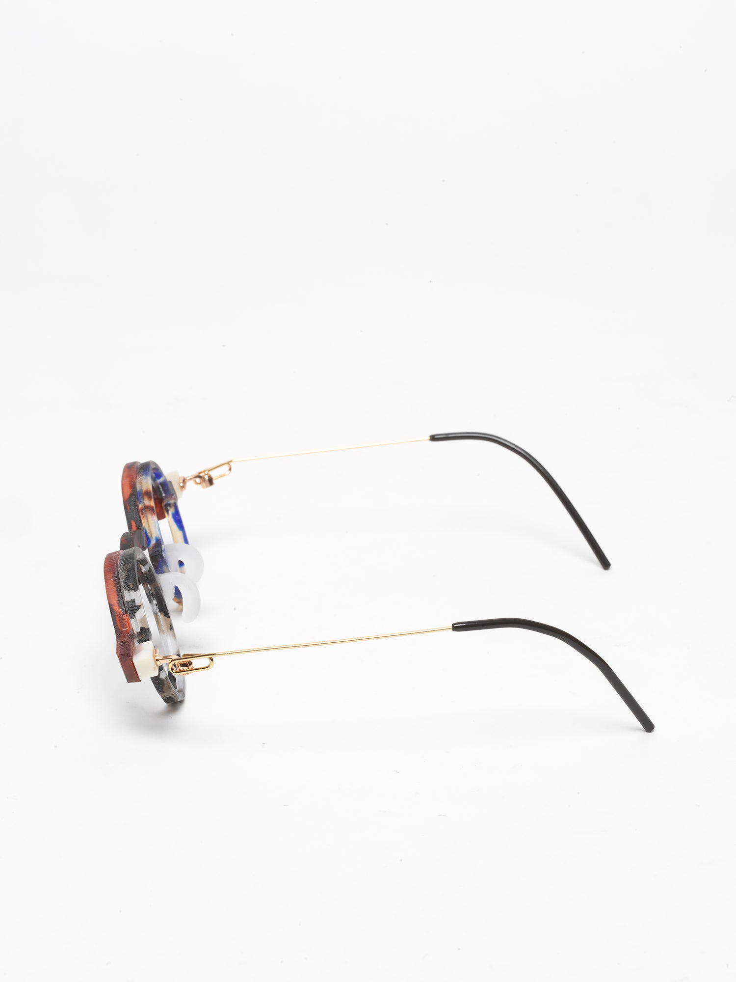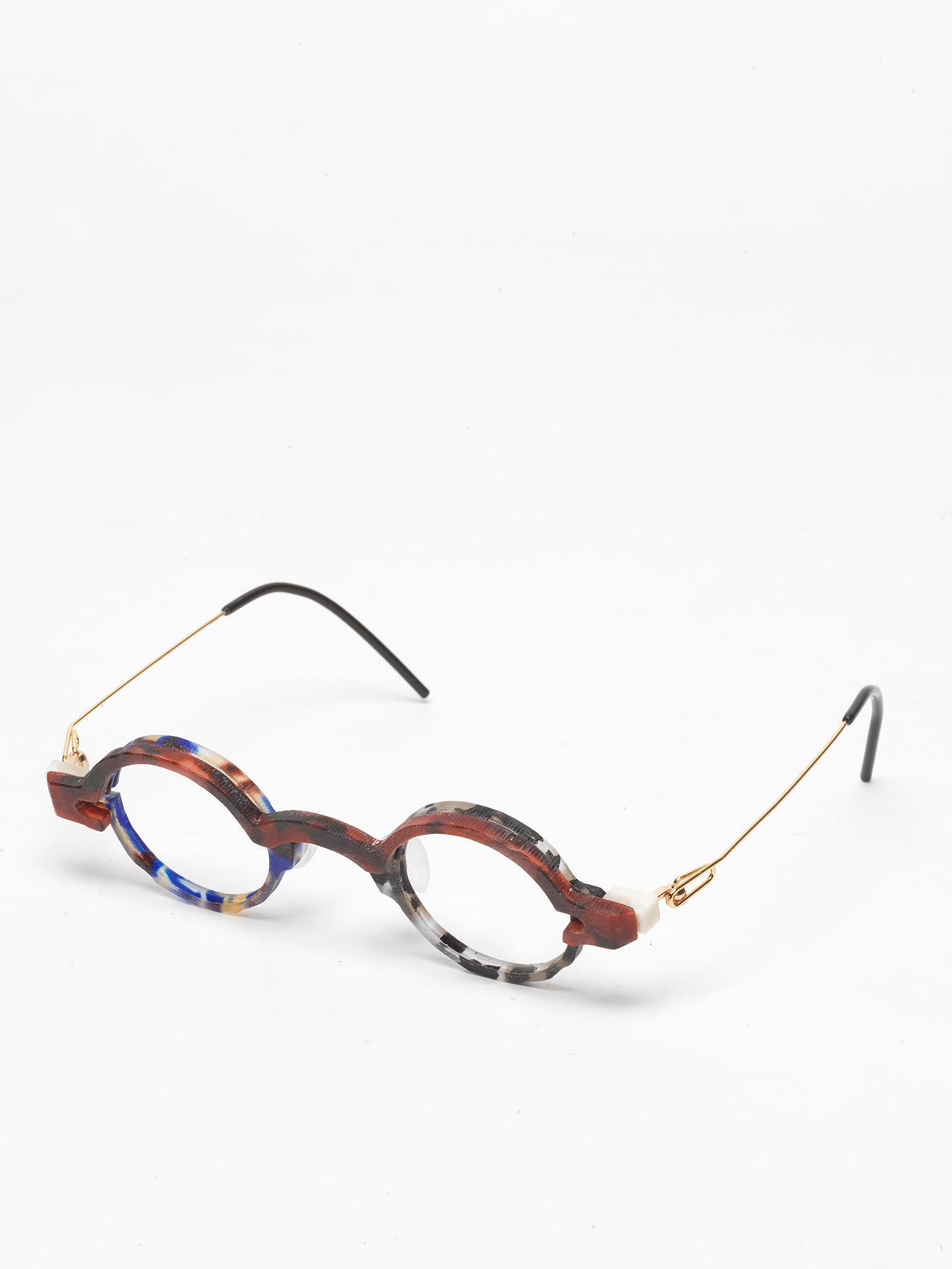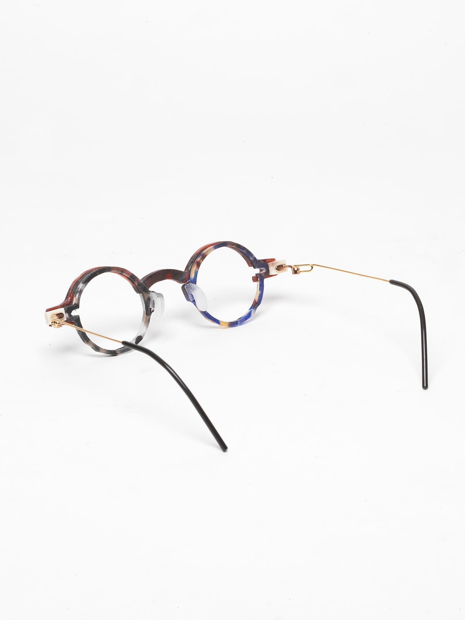 • dark red tortoise cellulose acetate frame, with chromatic additions in clear blue and grey tortoise