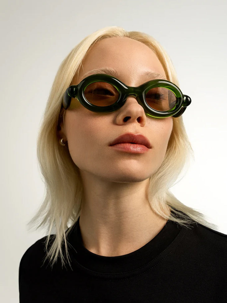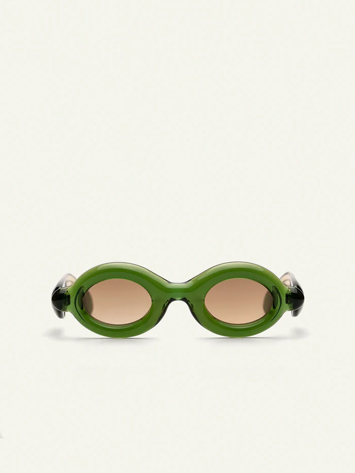 Exaggerated, inflated volumes with signature embellishment, including gold-plated wirecore, a 5-joint hinge system, and gold-tone engraving. A sculptural marvel for your face.