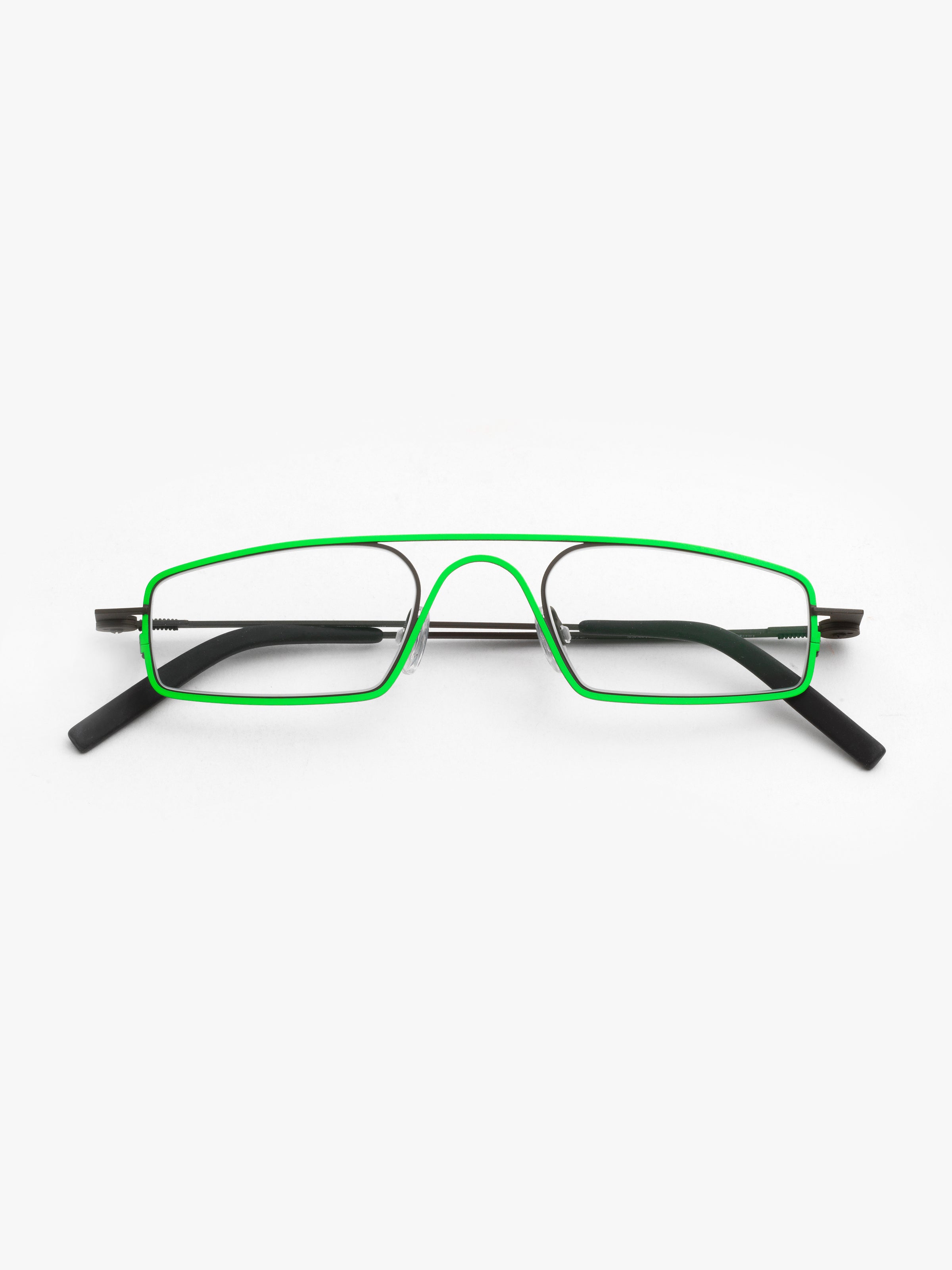 Theo reinvents the concept of reading glasses, known as half spectacles. The bridge is wide, allowing the wearer to position the glasses low on the nose for reading, but also to look over the top to see at a distance.