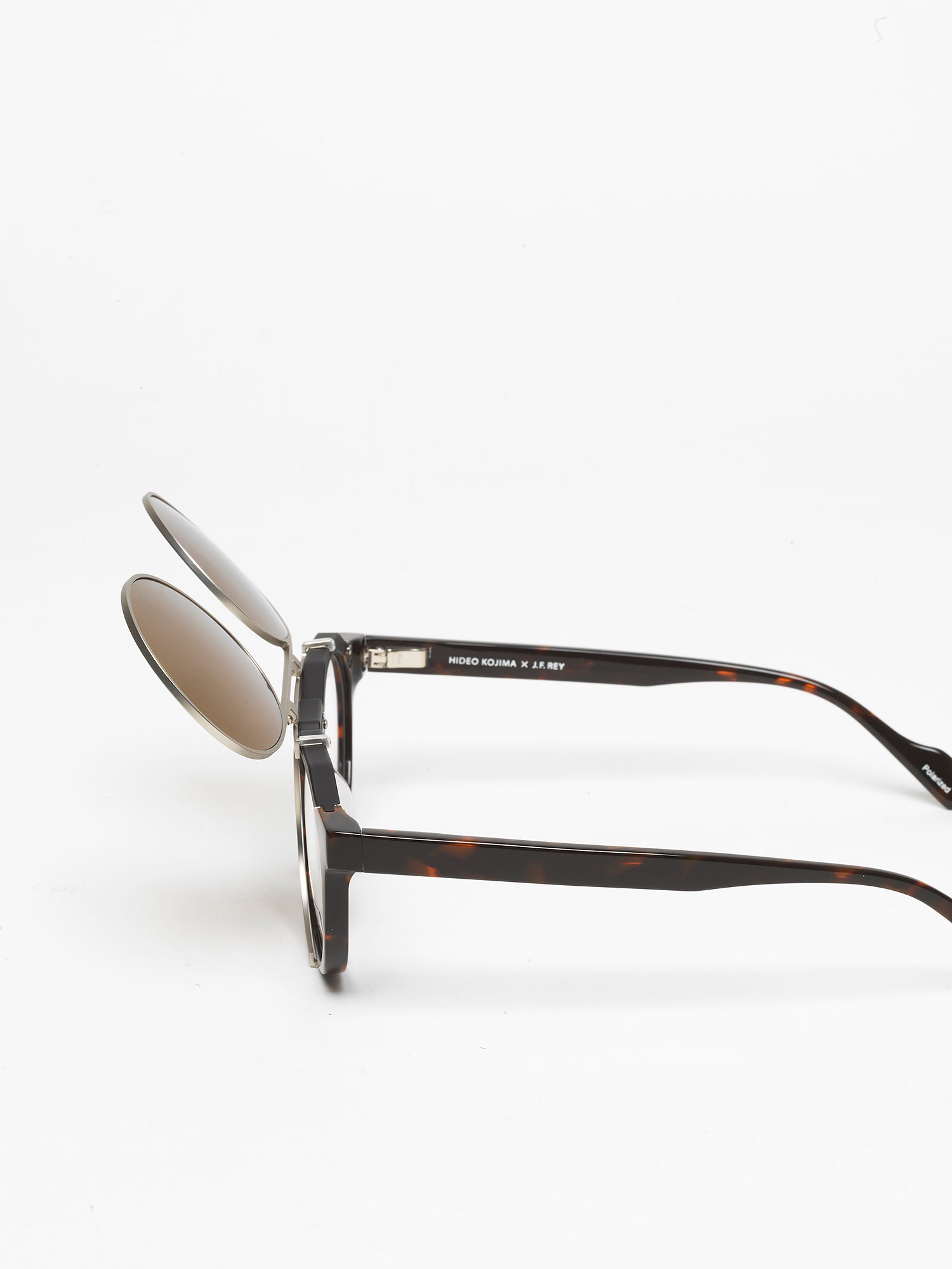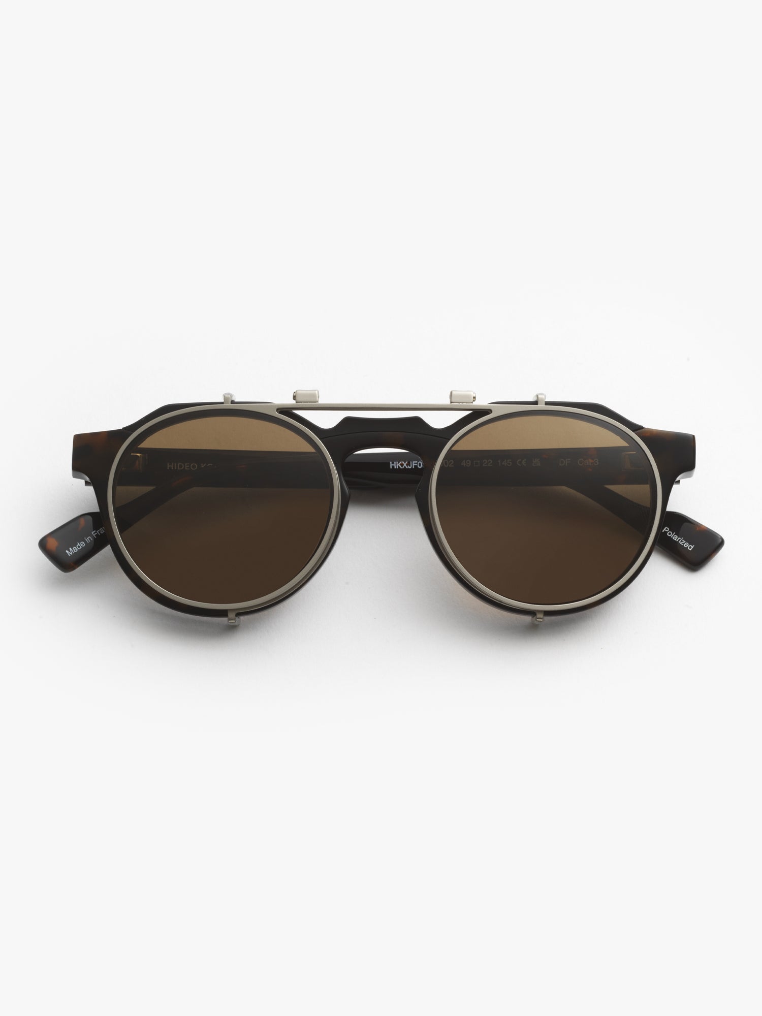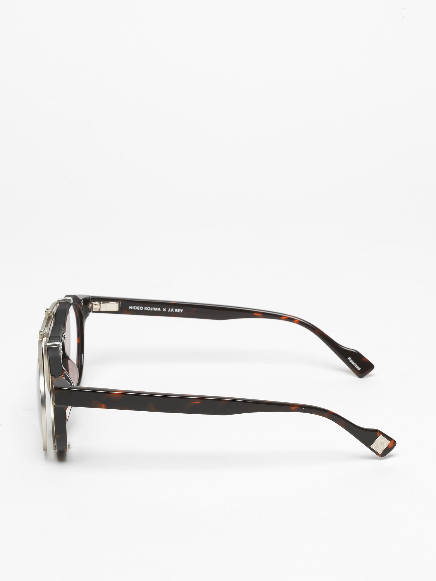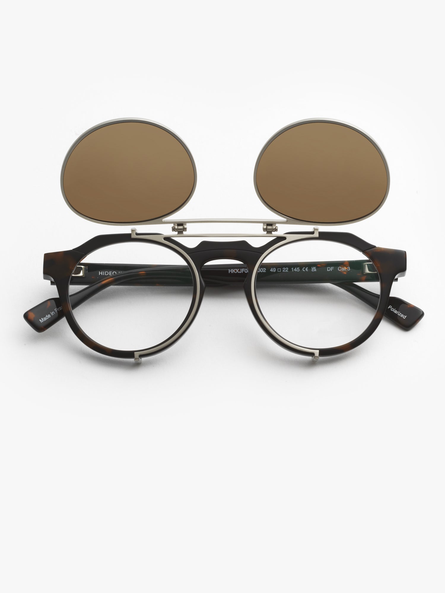 Handcrafted optical frames in jungle-effect acetate and black aluminium colors. The frames come with an exclusive flip-up clip-on with premium polarized solar lenses. Polarized lenses offer you superior quality and protection against glare and extreme outdoor light condition.