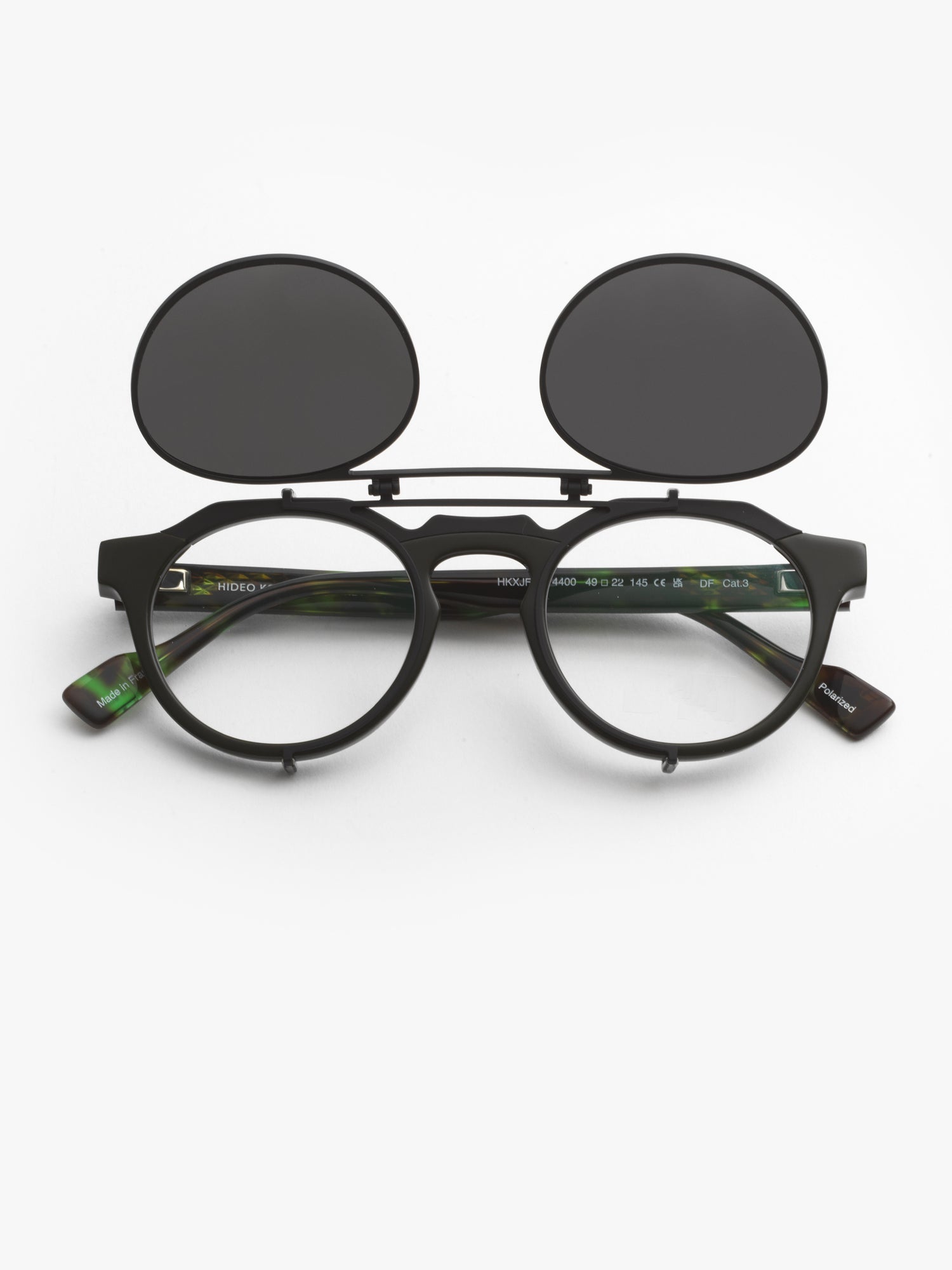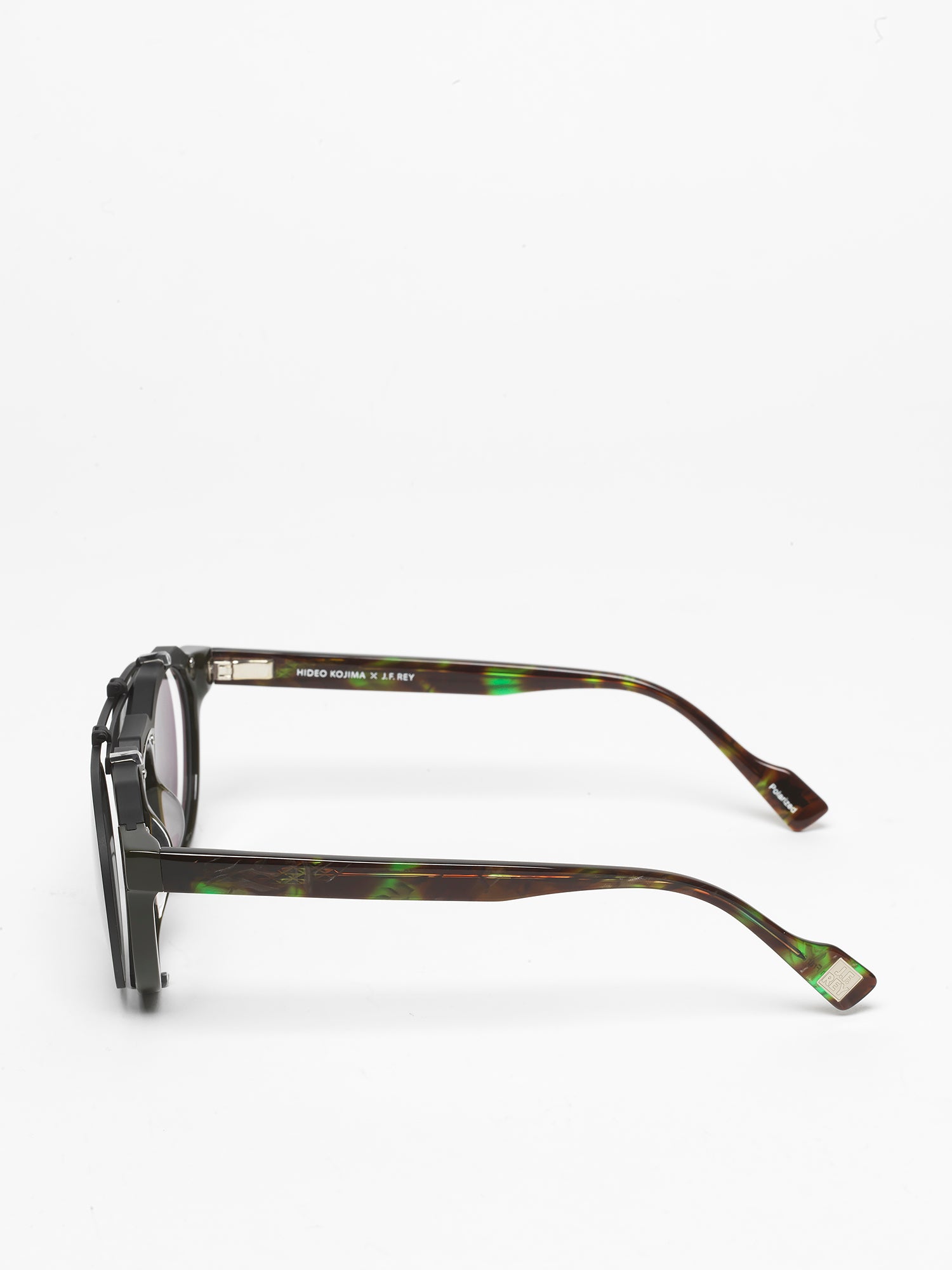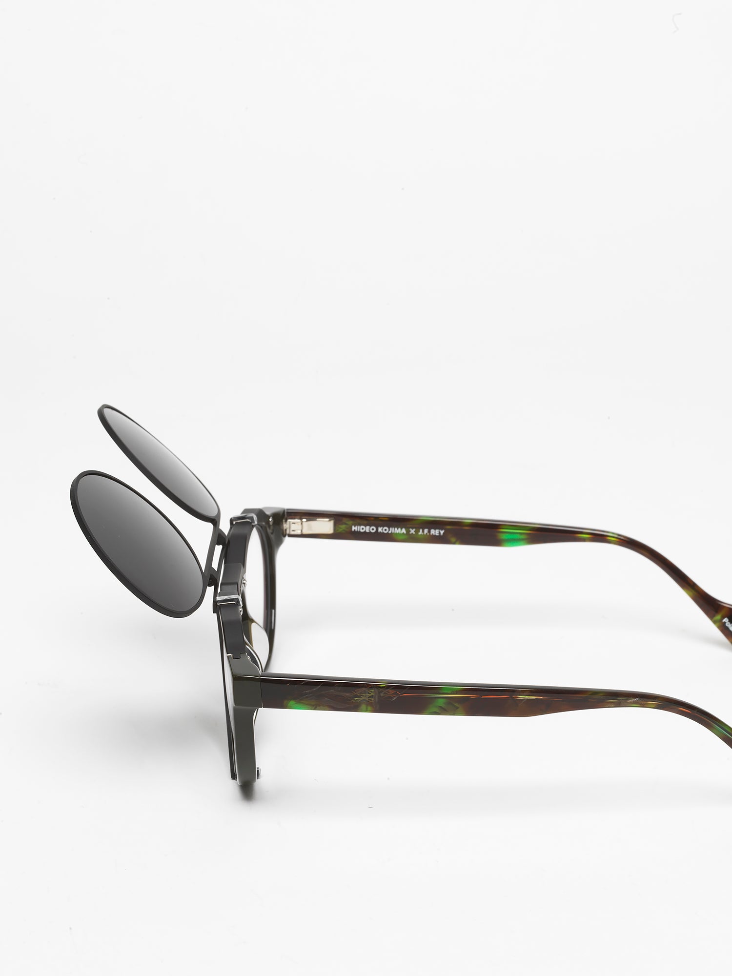 Handcrafted optical frames in jungle-effect acetate and black aluminium colors. The frames come with an exclusive flip-up clip-on with premium polarized solar lenses. Polarized lenses offer you superior quality and protection against glare and extreme outdoor light condition.