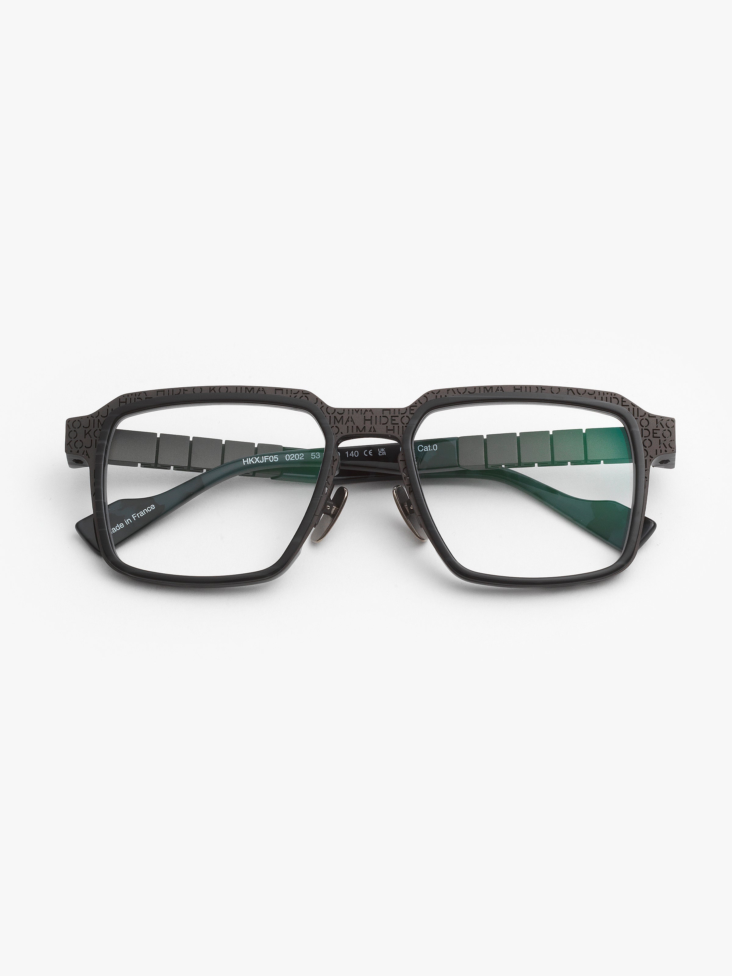 Iconic branded HIDEO KOJIMA handcrafted optical frame in a modern rectangular shape. Dark shades balance matte and glossy surfaces. The temples feature an exclusive full titanium flex that fits naturally to your head.