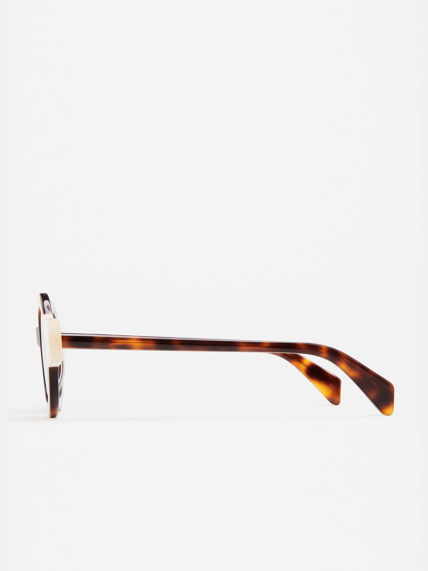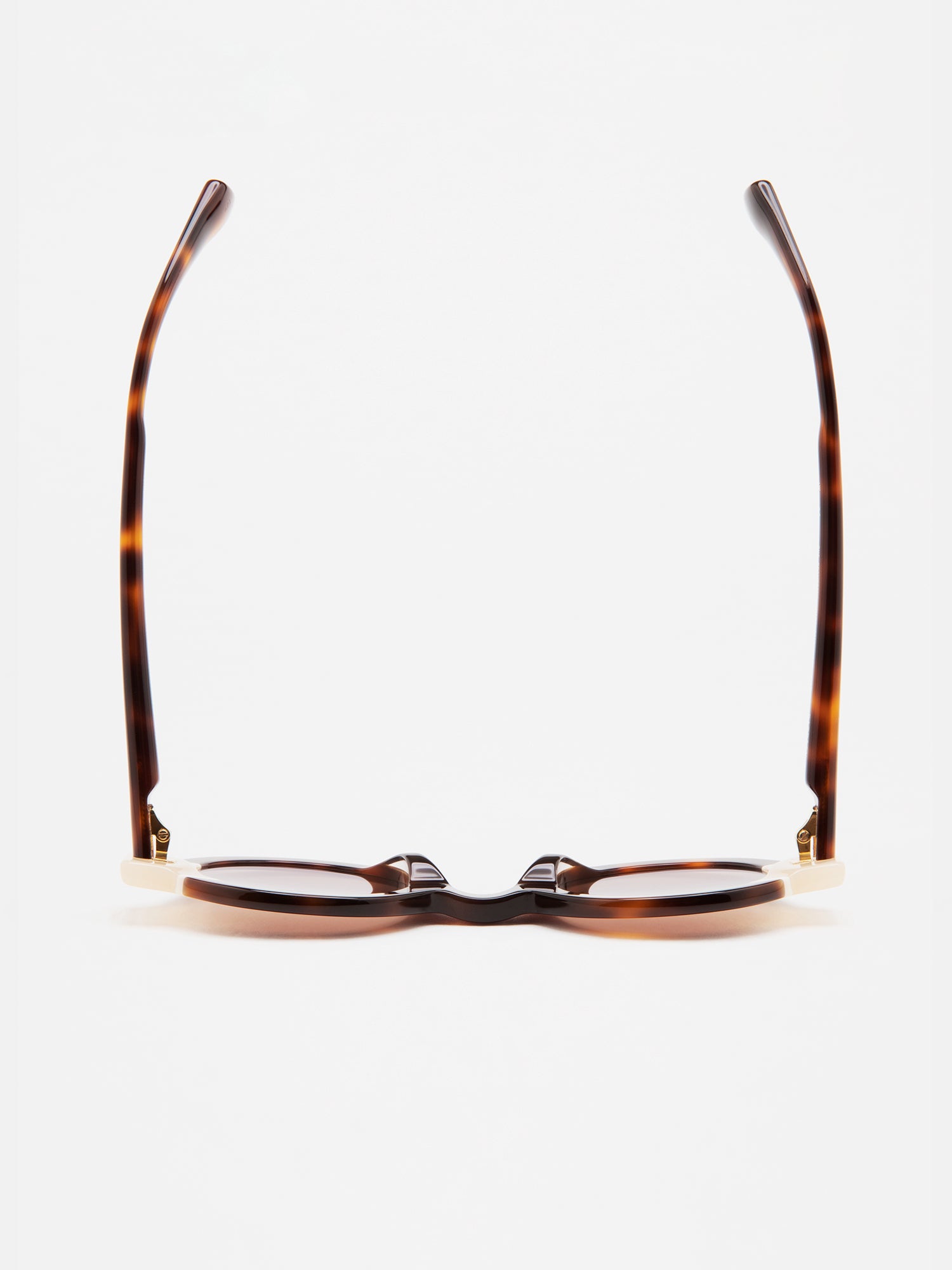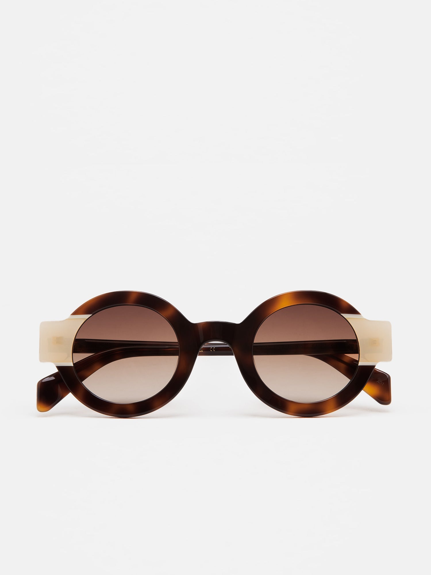 Round sunglasses in brown tortoiseshell acetate with double laminate in translucent beige and white.