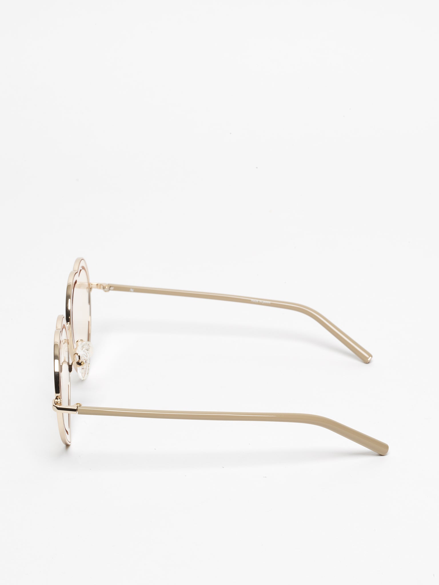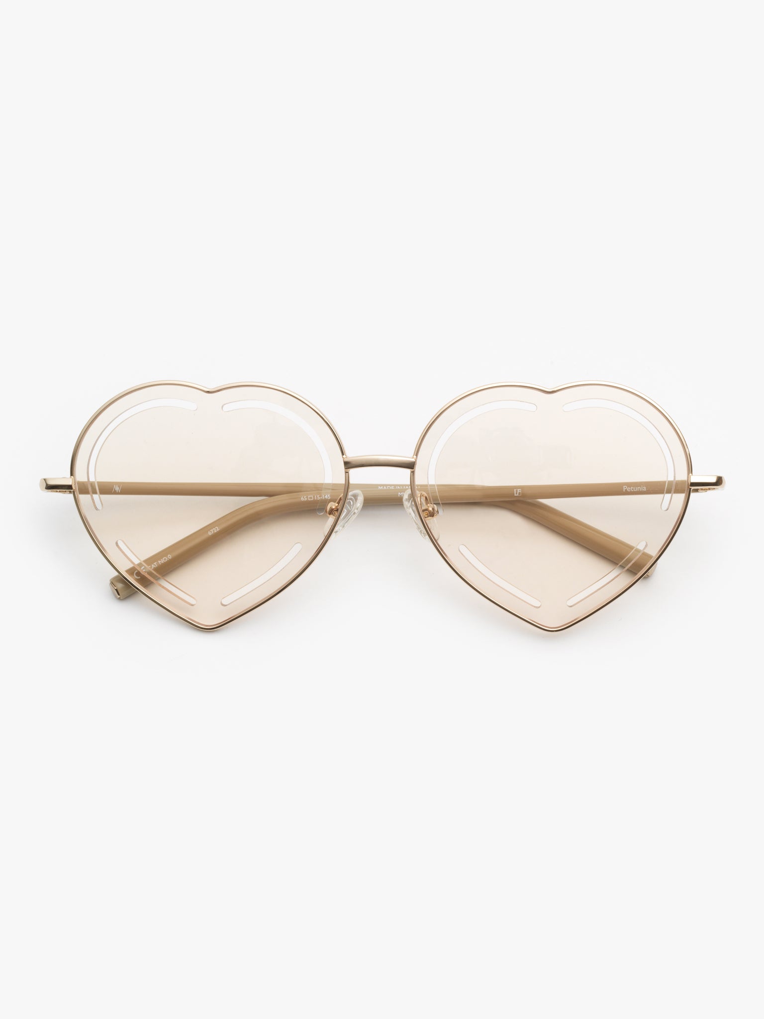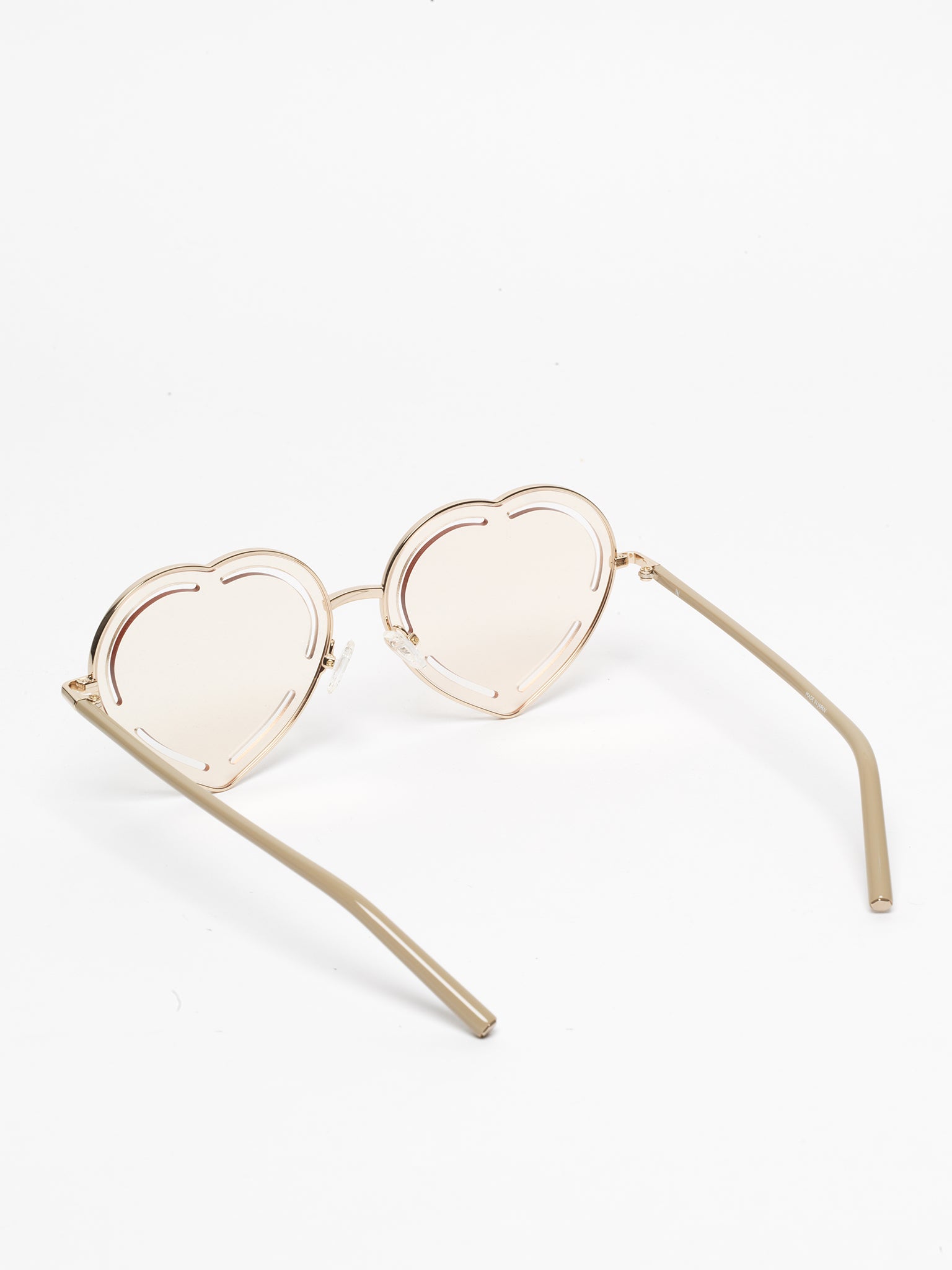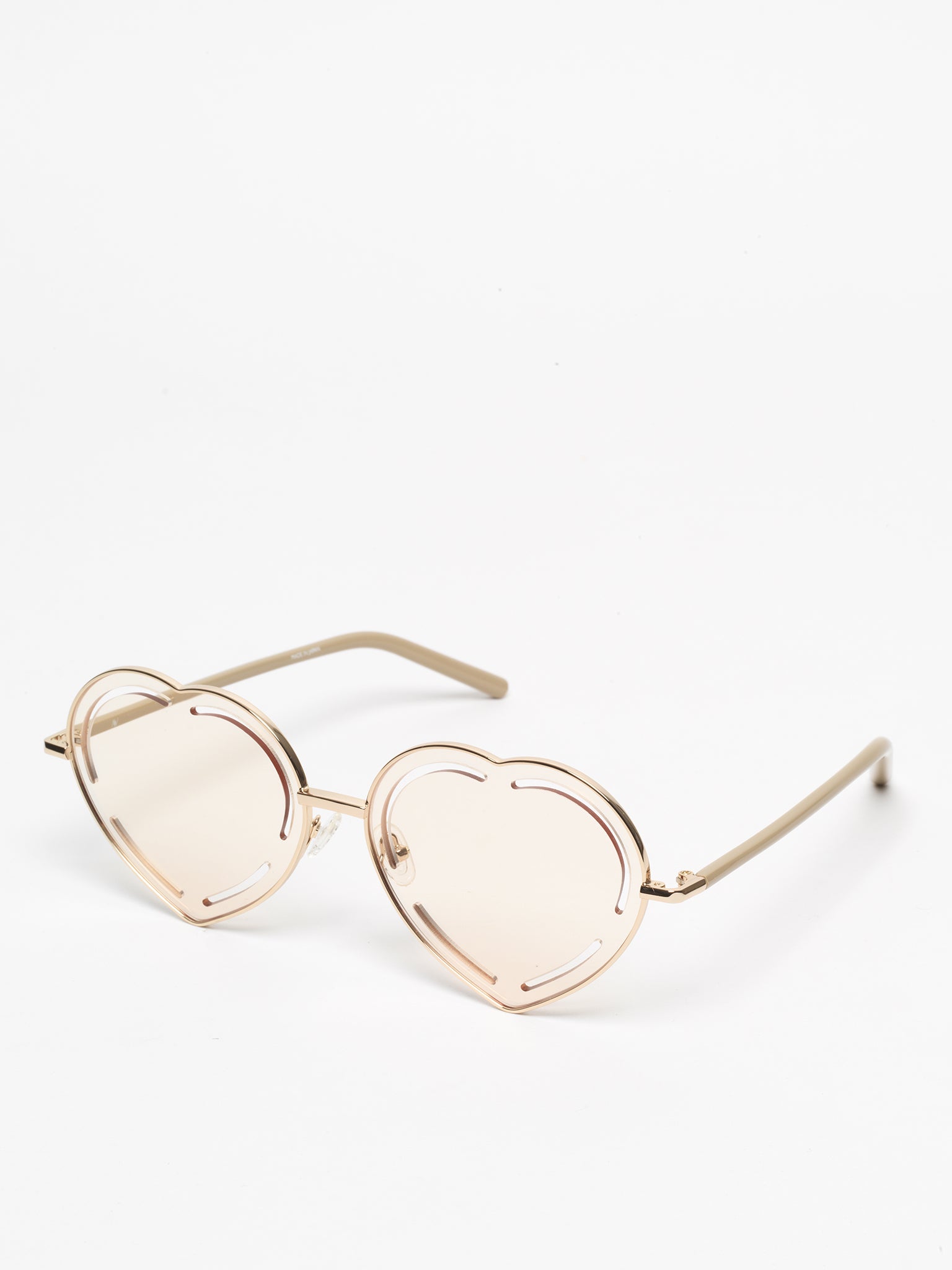 Inspired by MATTHEW WILLIAMSON's feminine aesthetic these heart-eye sunglasses bring a playful tone. The light gold stainless steel frame is fitted with cut work pink lenses. The style is finished with taupe rounded acetate temples and silicone nose pads for a comfortable fit.