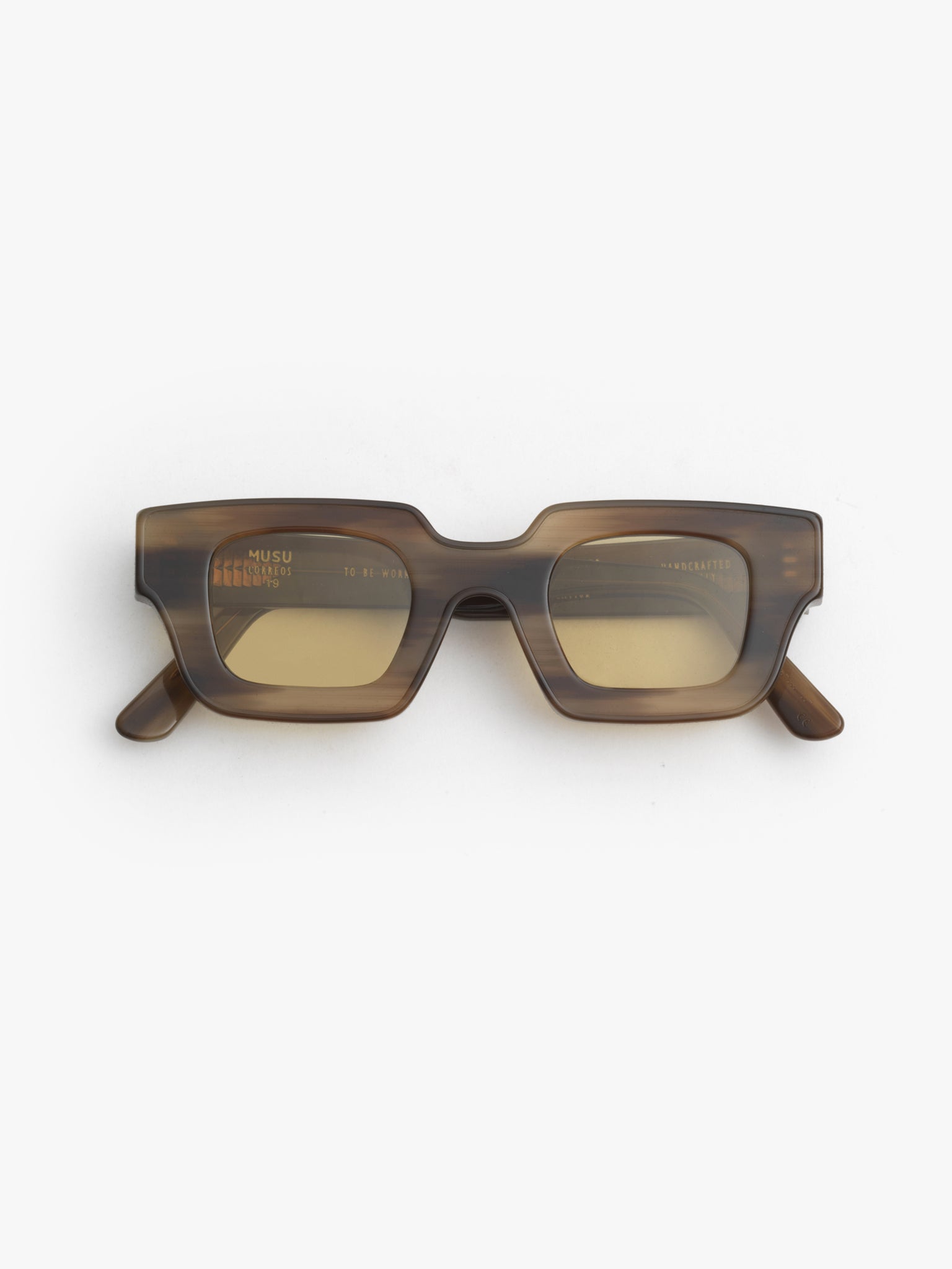 Rectangular silhouette with sculpted profiles in a unique shade of smoked havana.