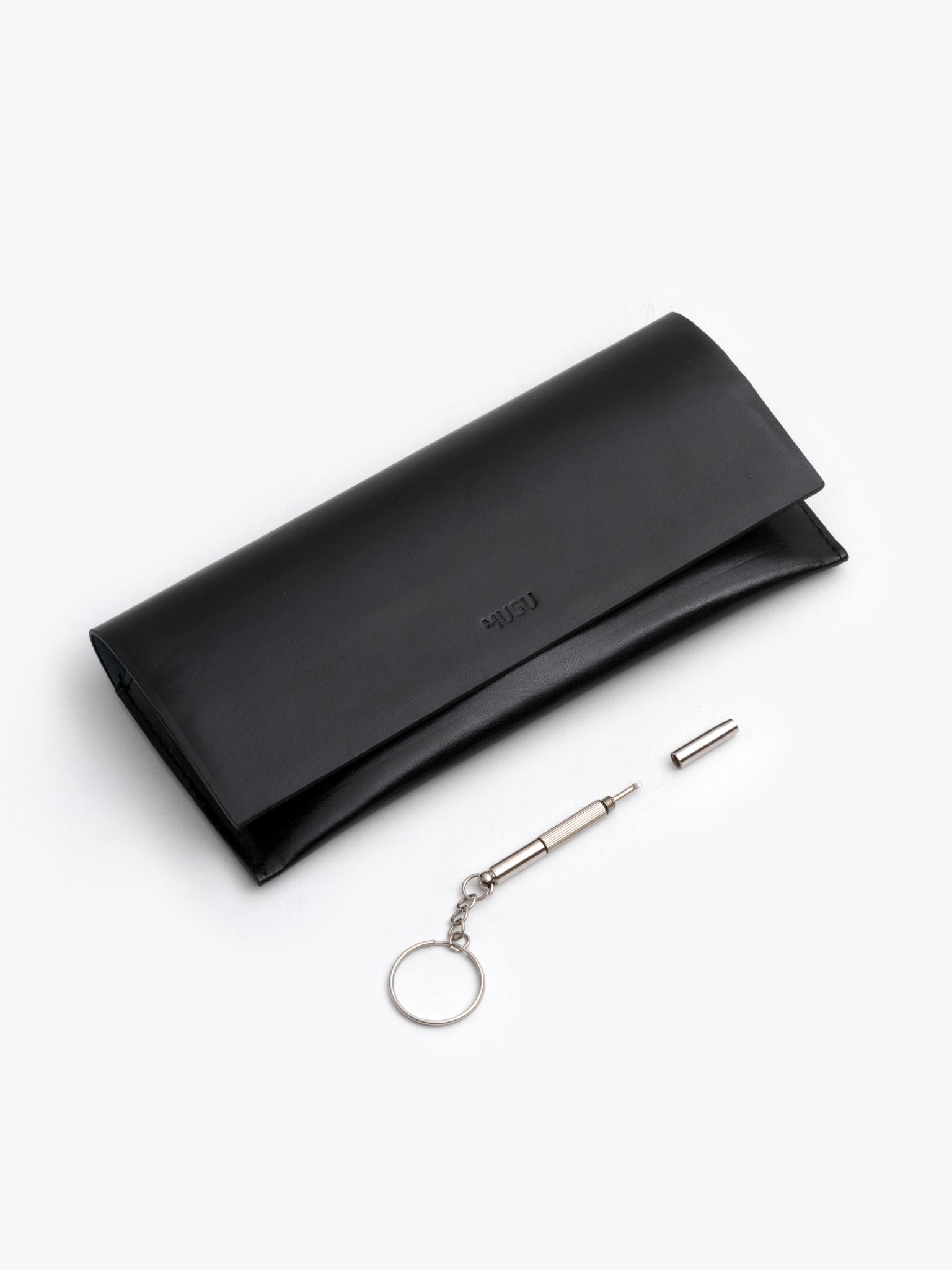 - includes the Musu eyewear packaging, made from 100% recycled cardboard, the storage case is made from recycled vegan leather (60% leather fibre - scrap and waste leather fibre mainly from the unwanted by-products of industrial glove manufacturers - 30% polymer - a natural binder from rubber trees -, and 10% coating - water-based polyurethane coating)