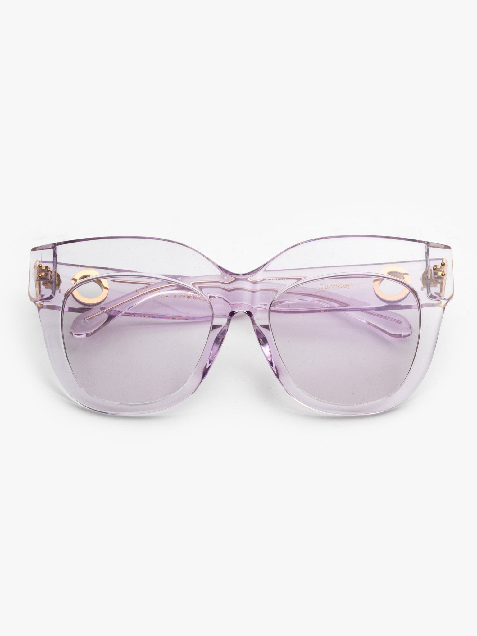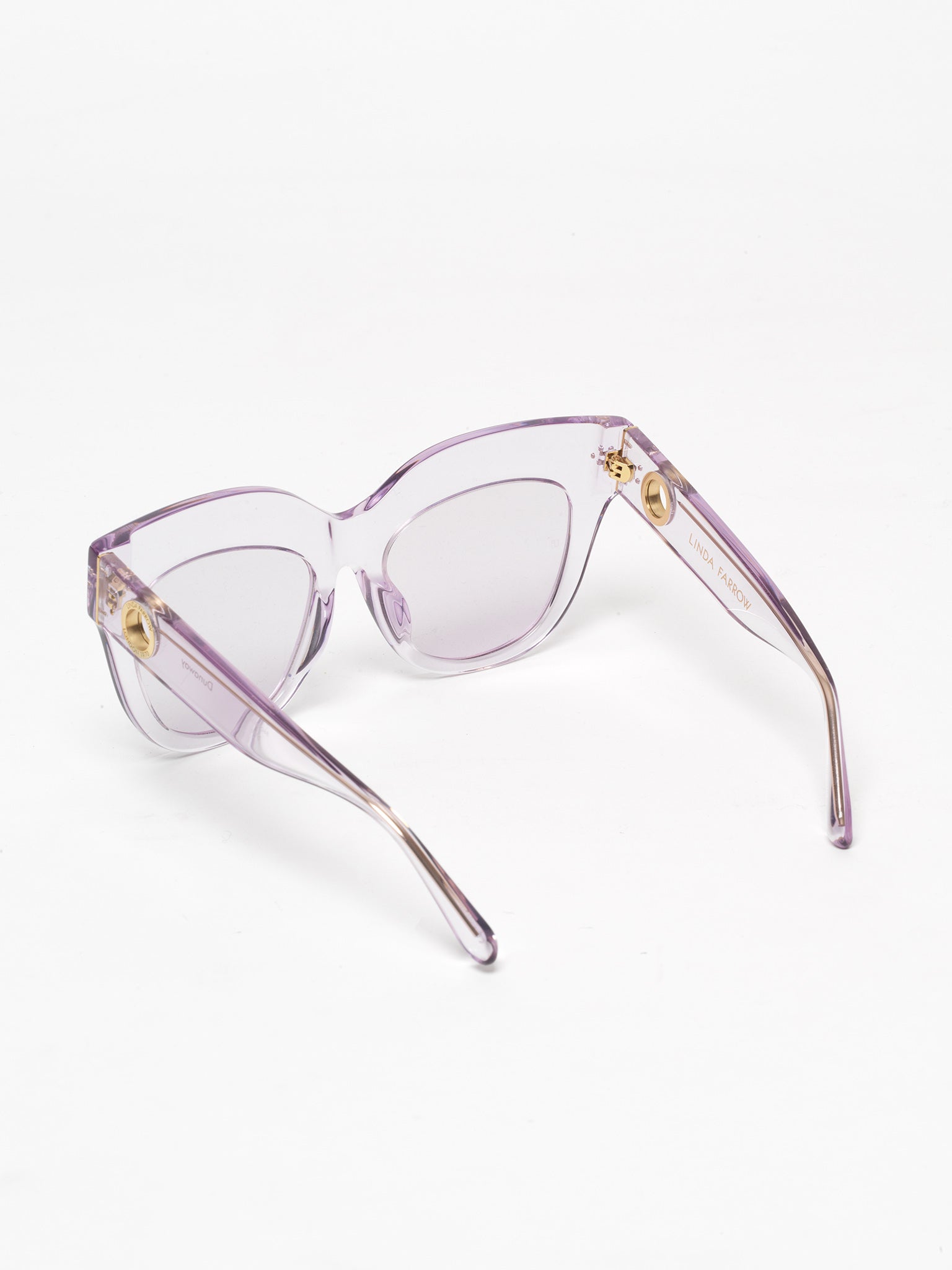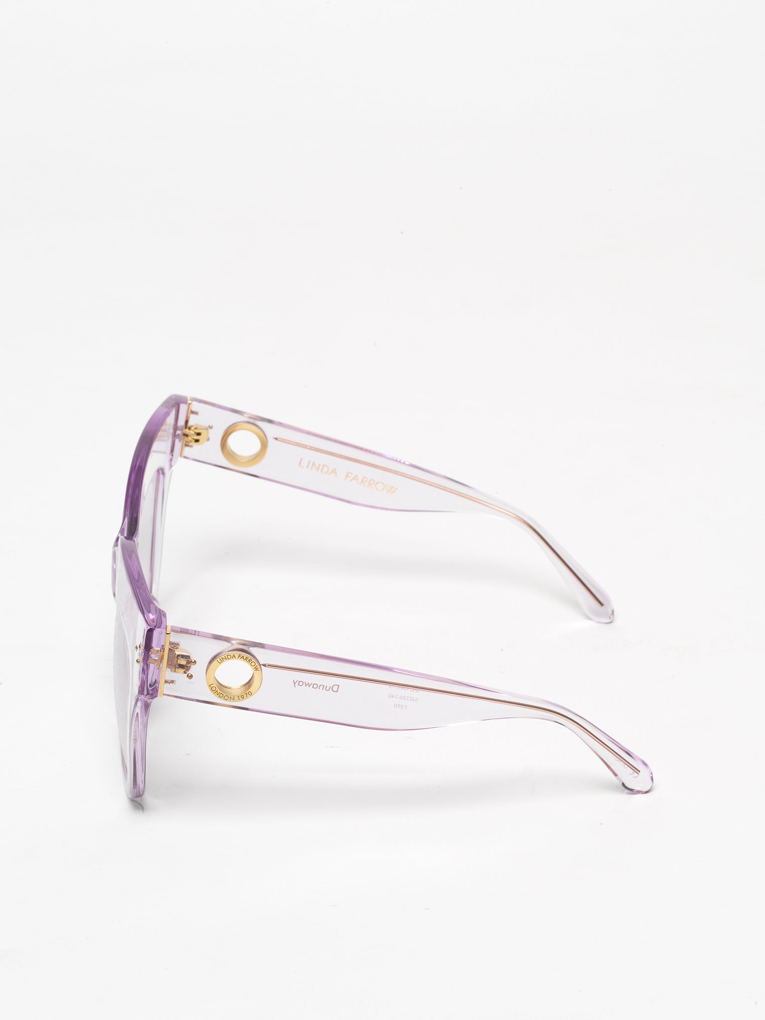 The LINDA FARROW iconic Dunaway frame is introduced in new colours for the season. Inspired by the tones of nature the silhouette is sculpted from a translucent lilac acetate which is highly polished into a statement exaggerated brow.