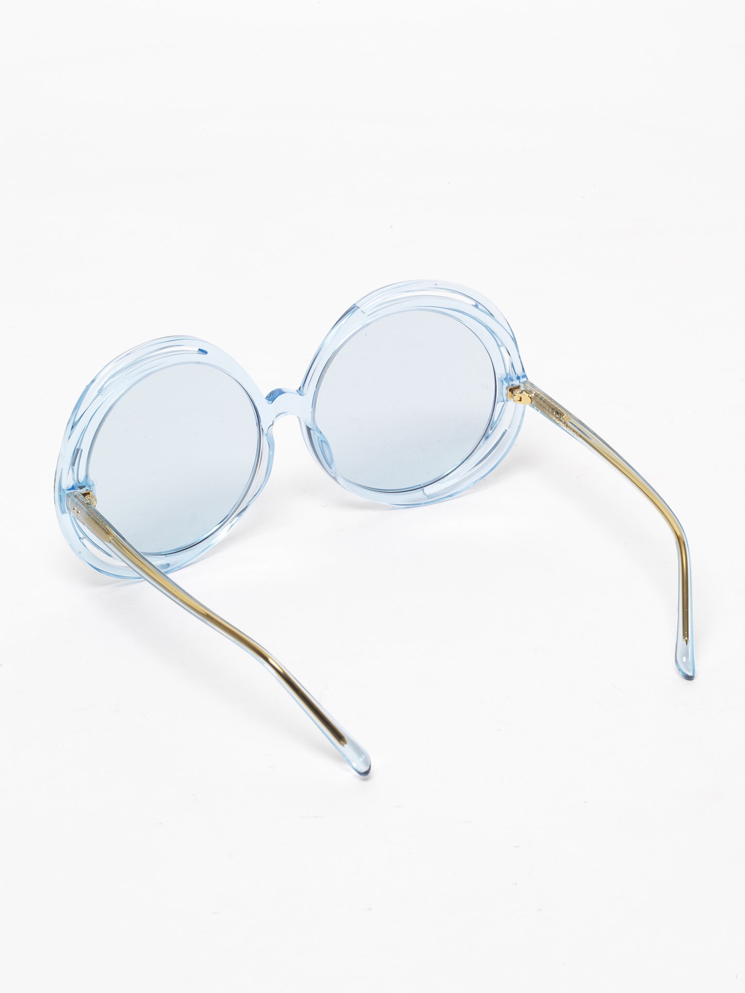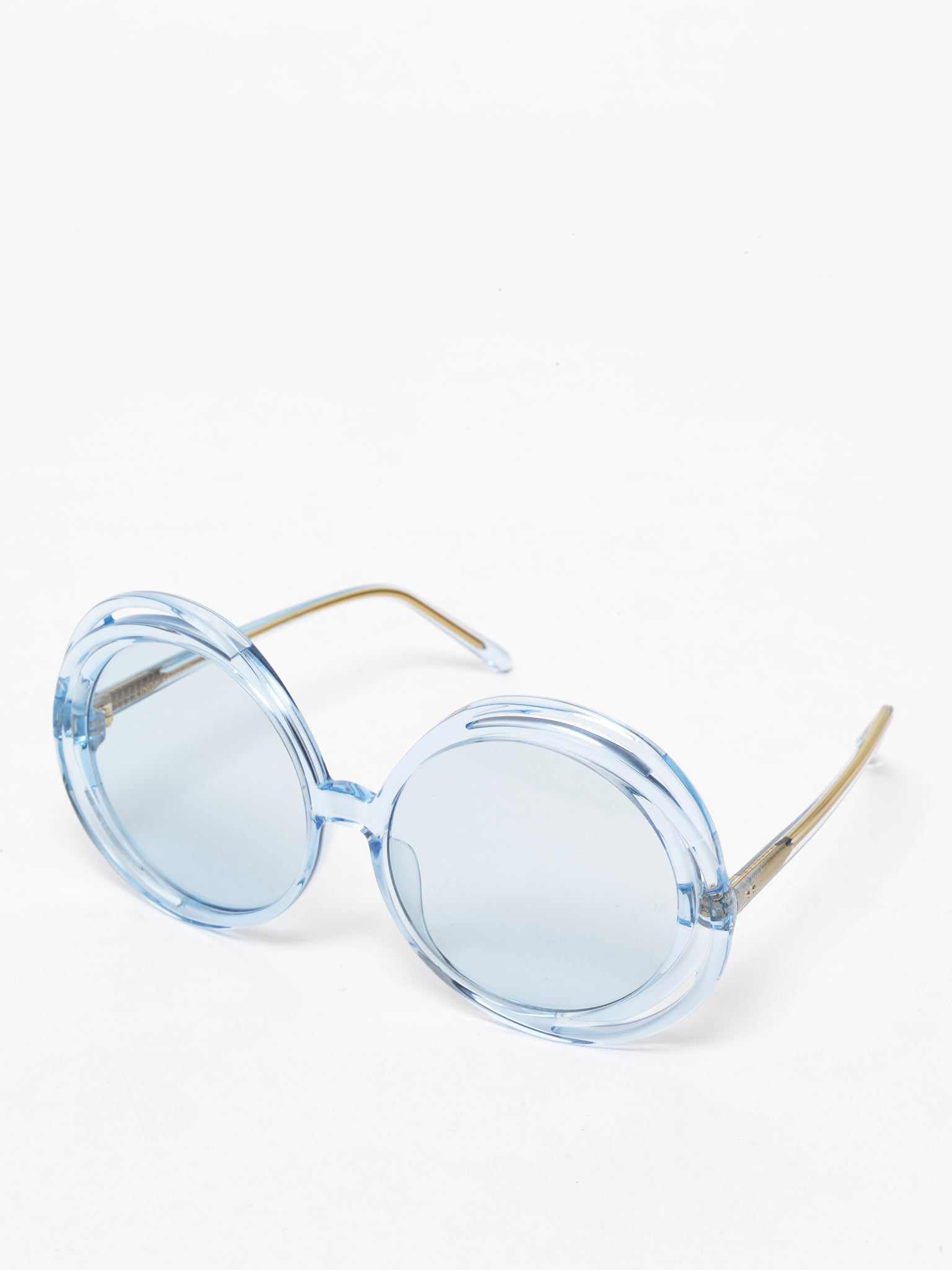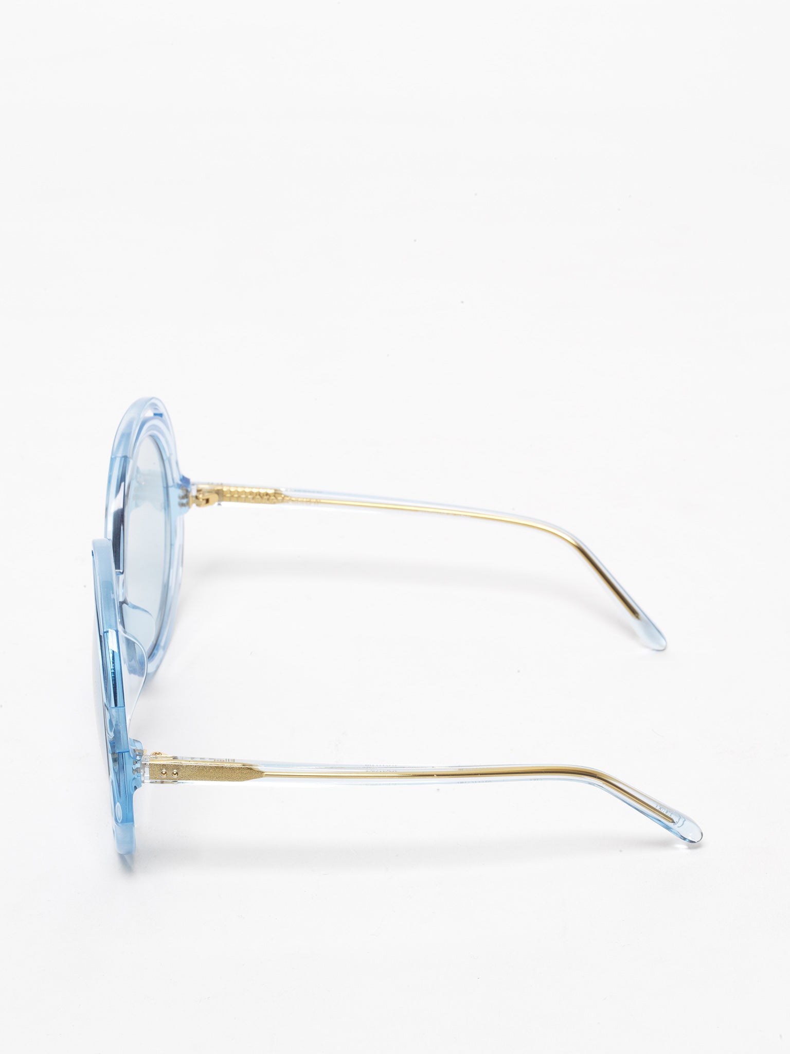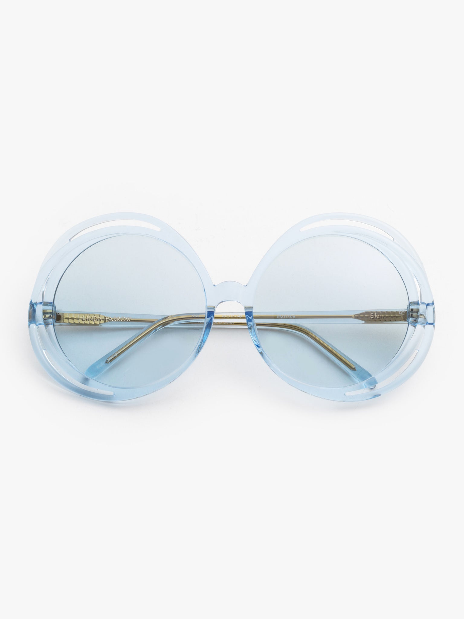 Layers create the form of these oversized round sunglasses from the LINDA FARROW collection. The Ellen is sculpted from stepped blue acetate which encircles the lens in a delicate cutwork pattern. Laminated nose pads and temple tips provide a comfortable fit. The style is fitted with solid blue ZEISS technology lenses which offer anti-glare and 100% UV protection. Finished with 22 carat yellow gold plated hardware.