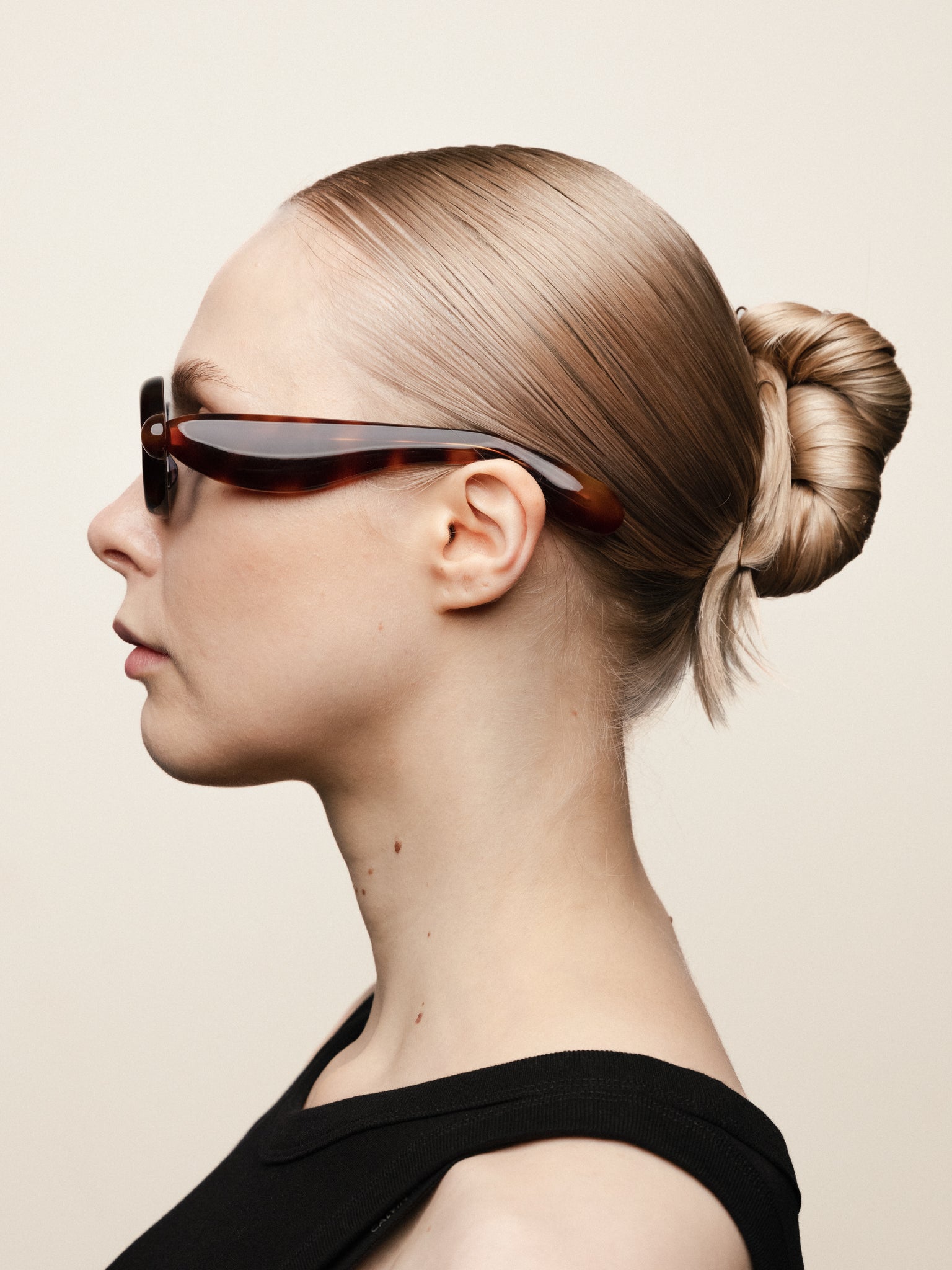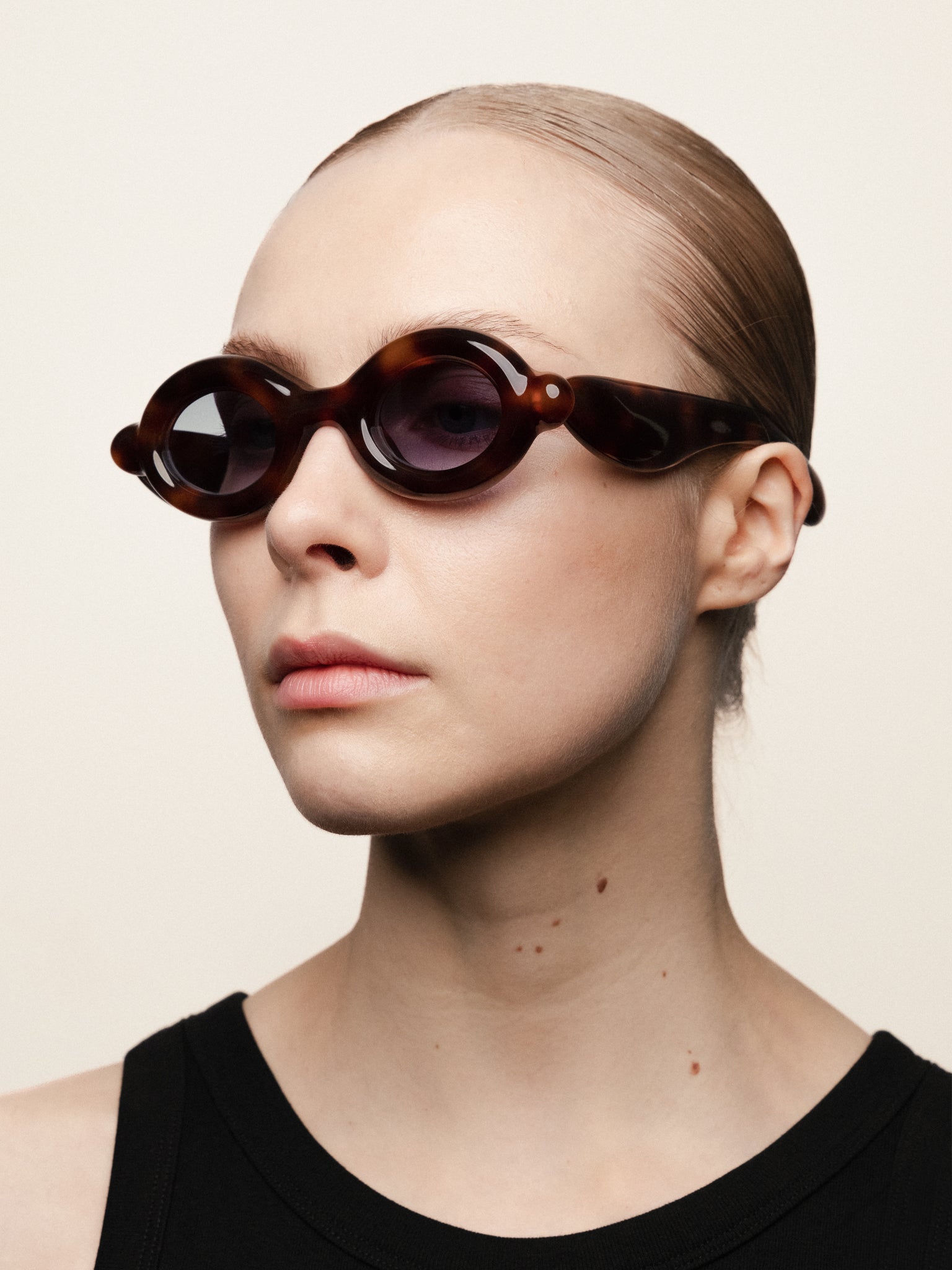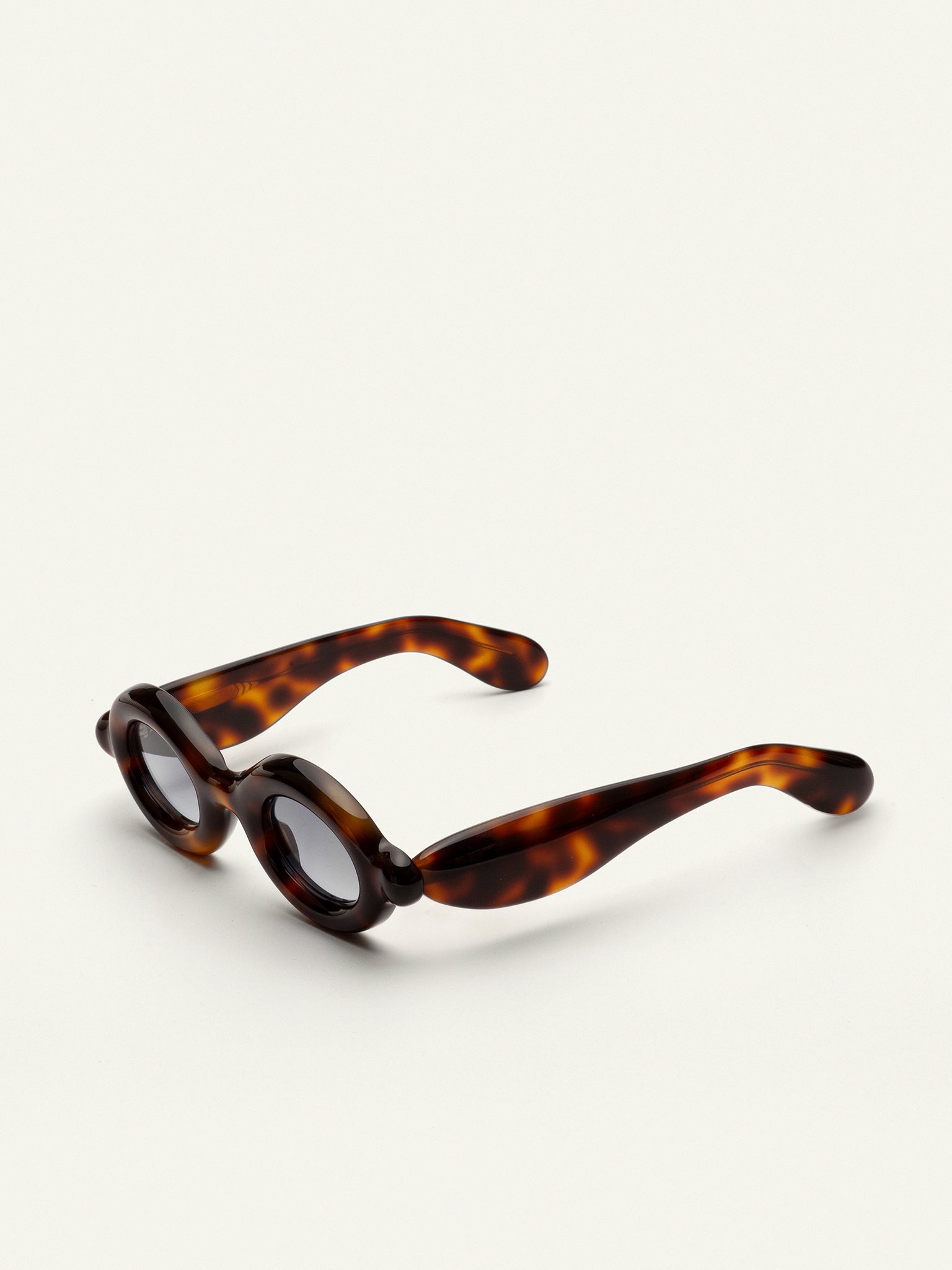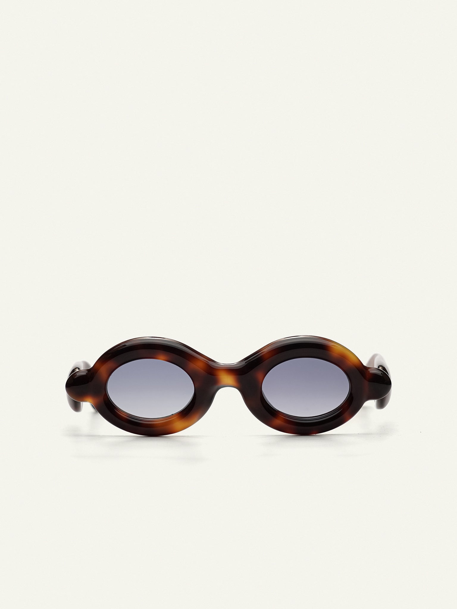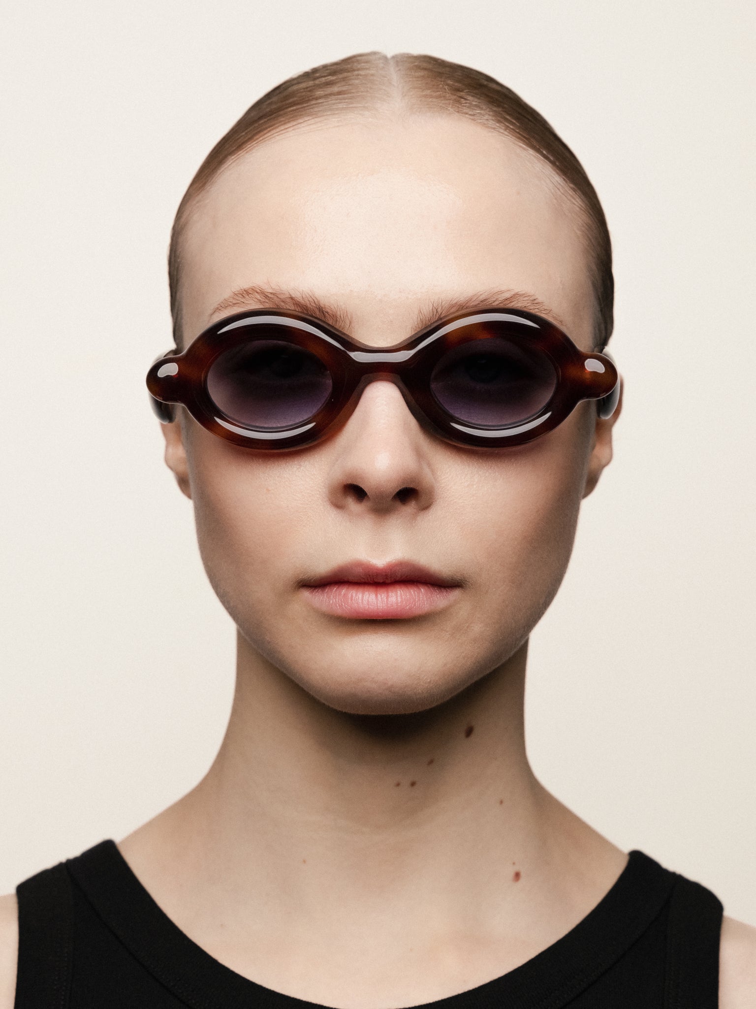 Exaggerated, inflated volumes with signature embellishment, including gold-plated wirecore, a 5-joint hinge system, and gold-tone engraving. A sculptural marvel for your face.
