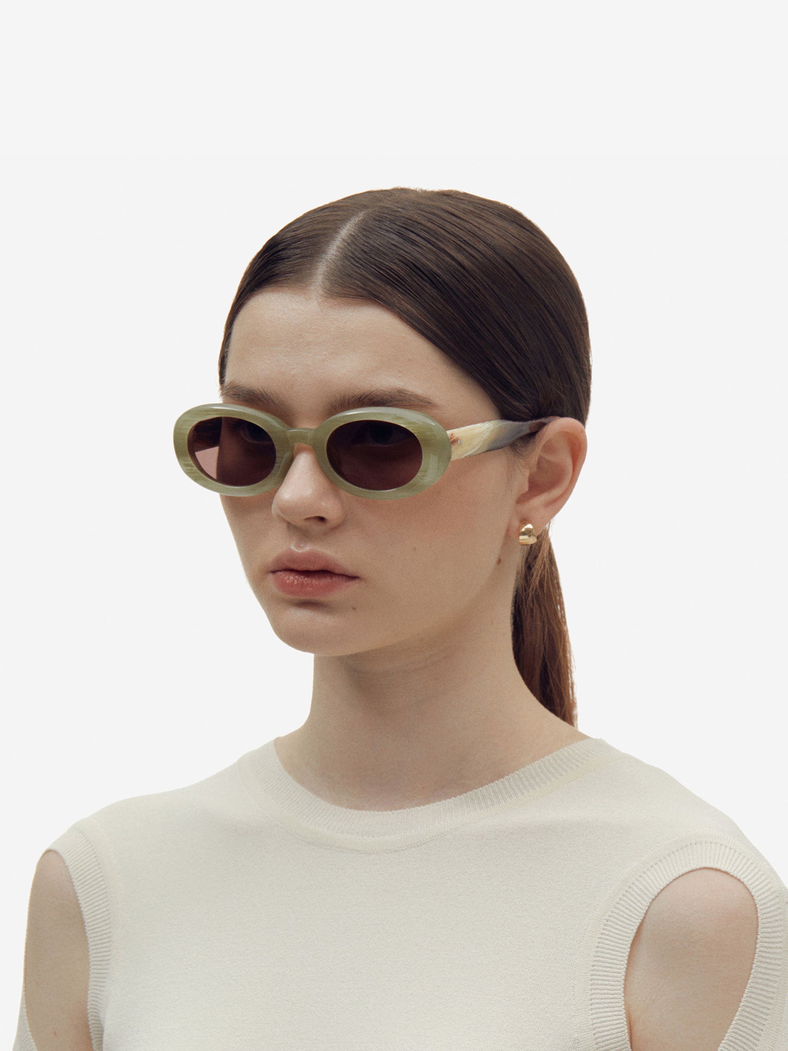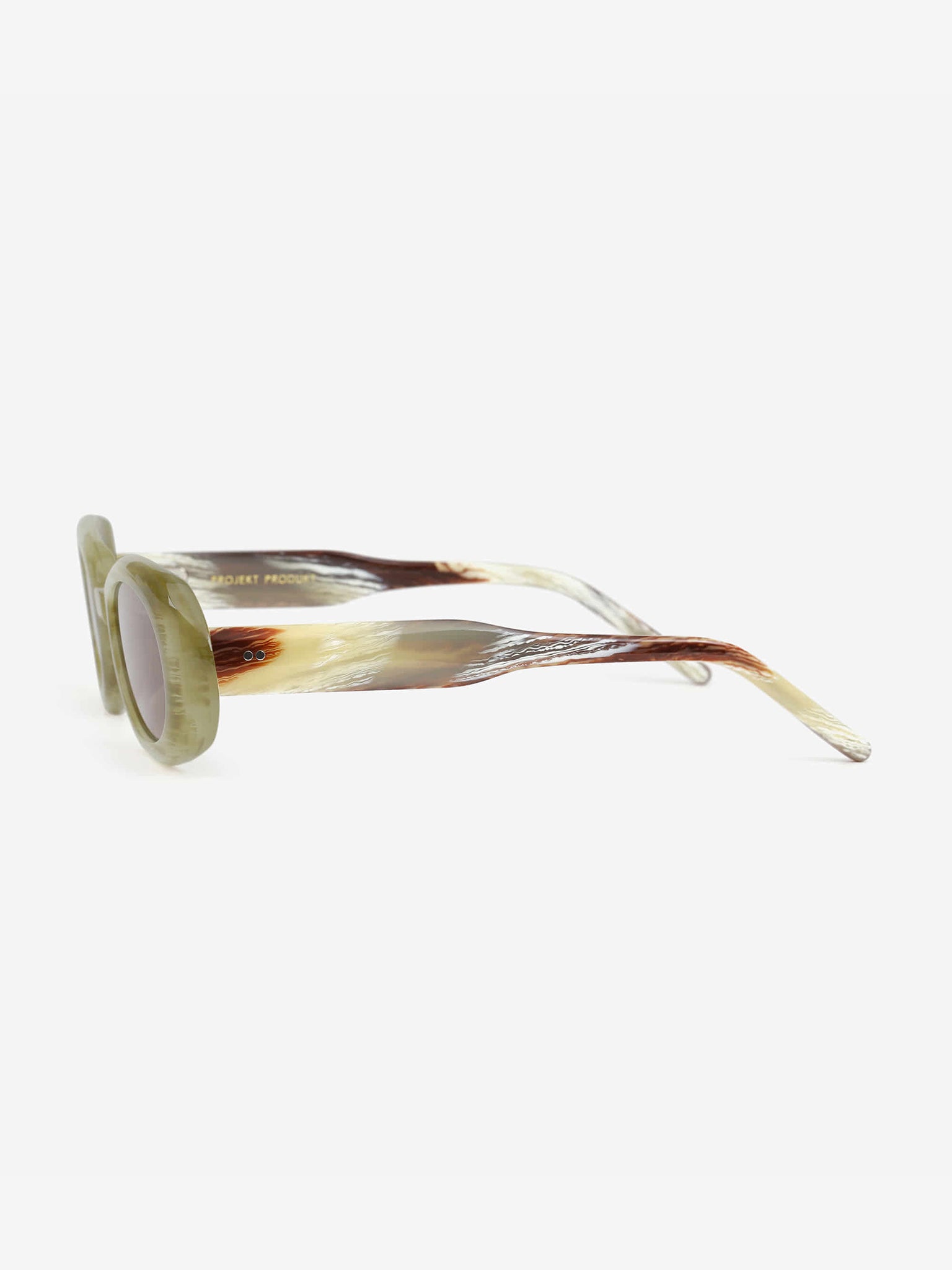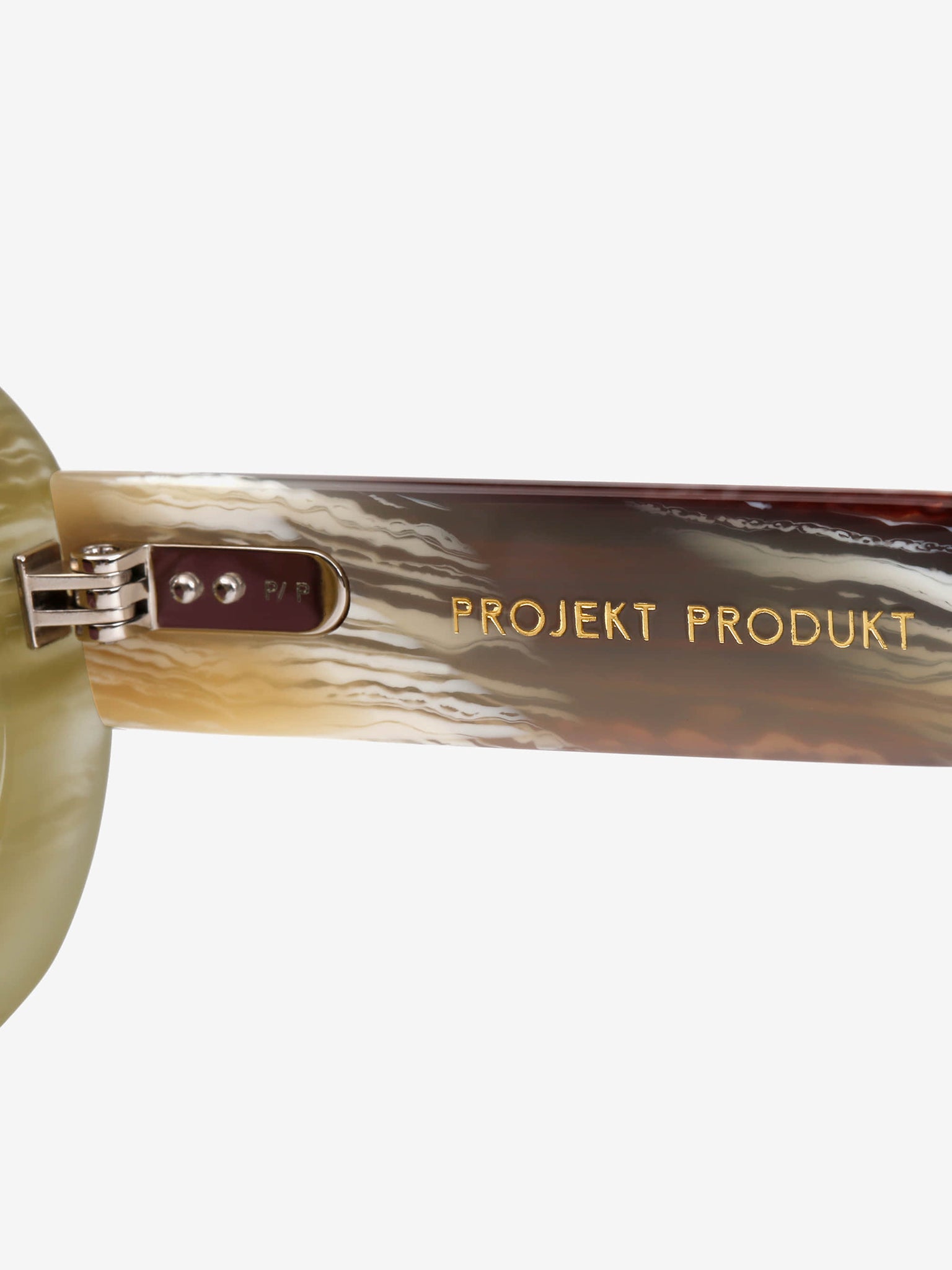 These F3 frames are made from glossy acetate with organic-patterned tone and color detailing with softer, rounded edges, well-representing the theme of the PROJECT10 collection. The pair of sunglasses is designed in a glamourous shape but has the refined finishing touches on the curves of the bridge interlocking the lenses.