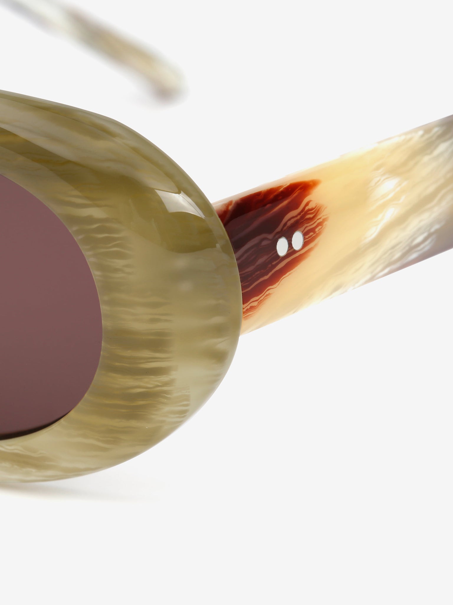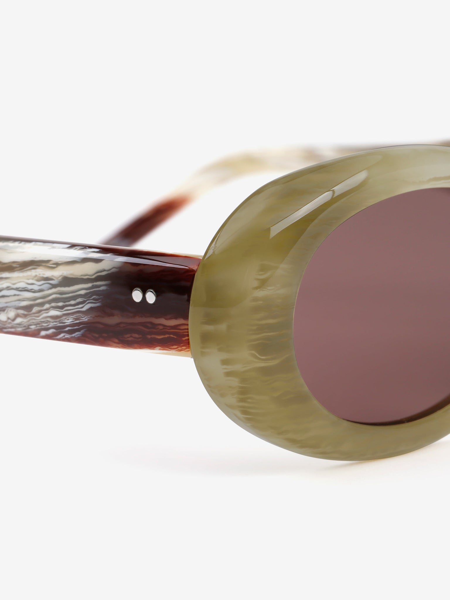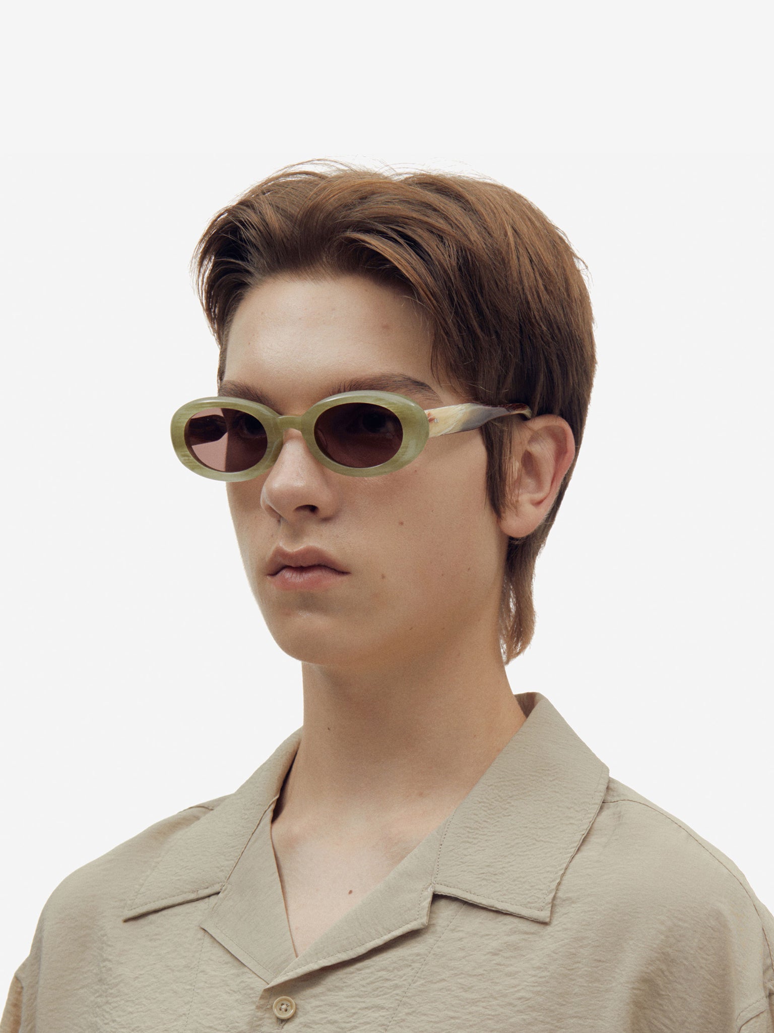 These F3 frames are made from glossy acetate with organic-patterned tone and color detailing with softer, rounded edges, well-representing the theme of the PROJECT10 collection. The pair of sunglasses is designed in a glamourous shape but has the refined finishing touches on the curves of the bridge interlocking the lenses.