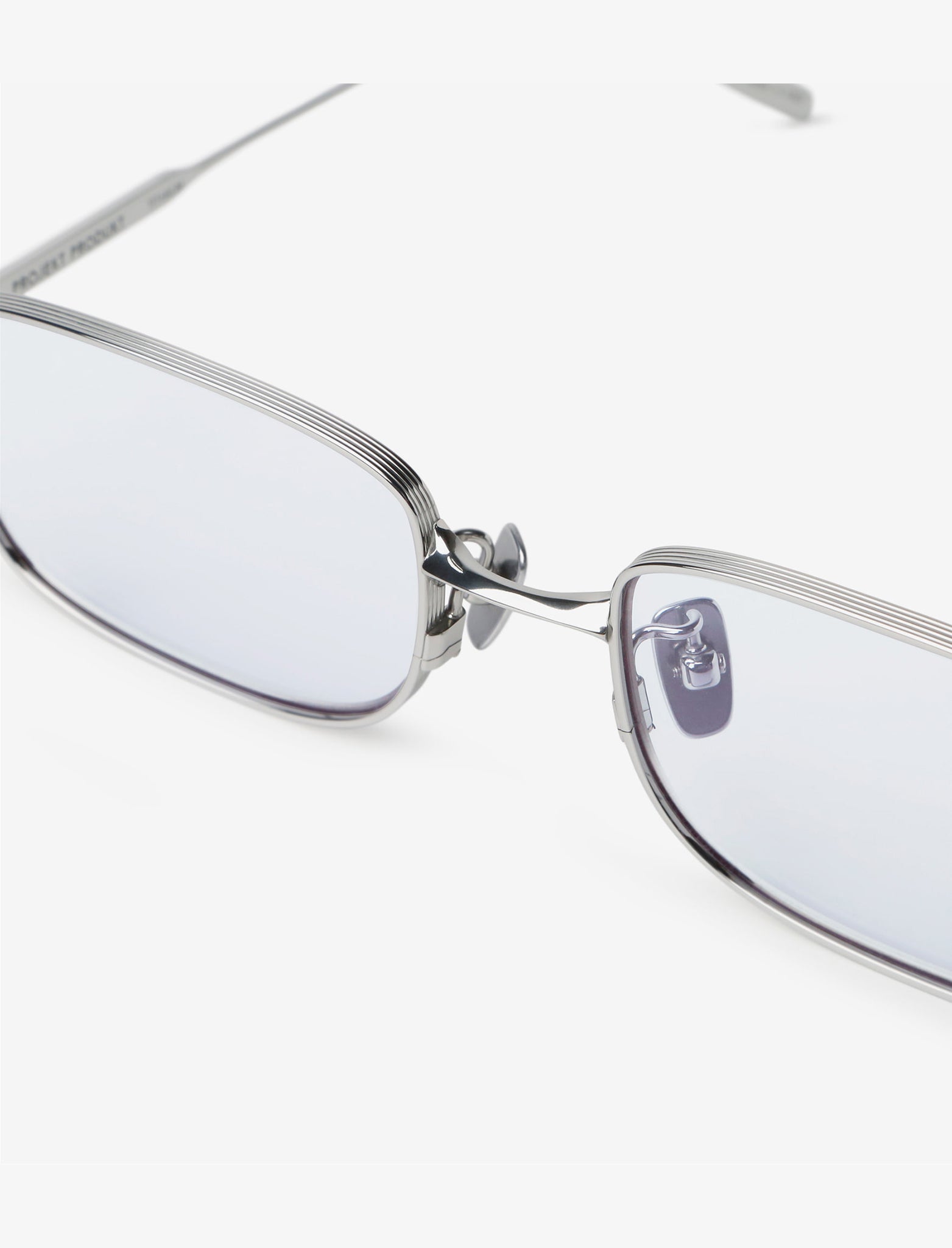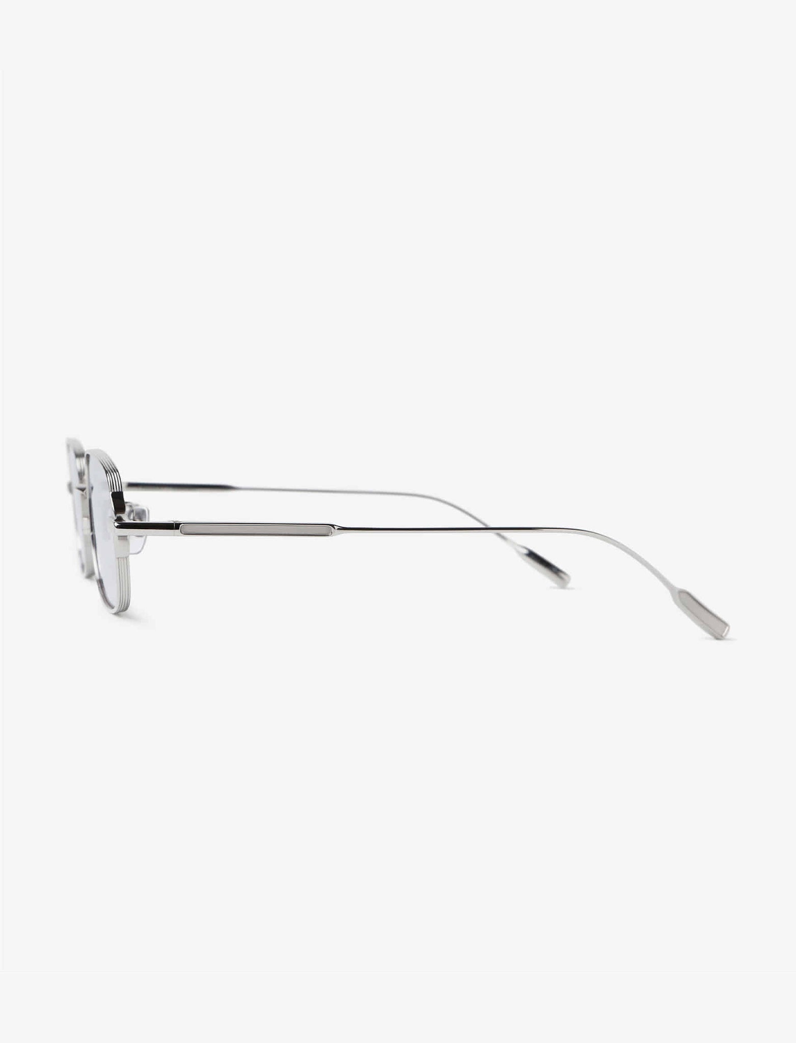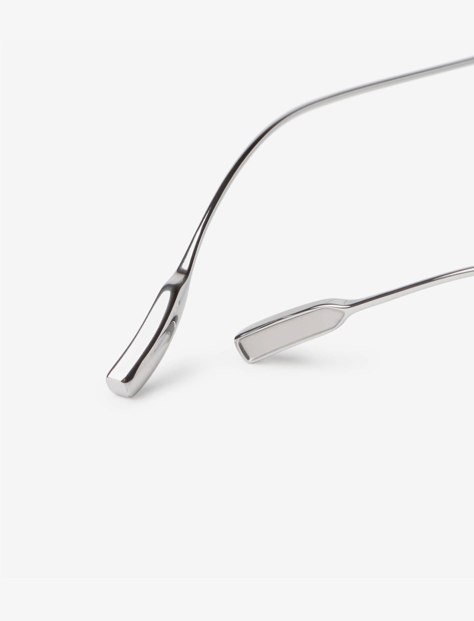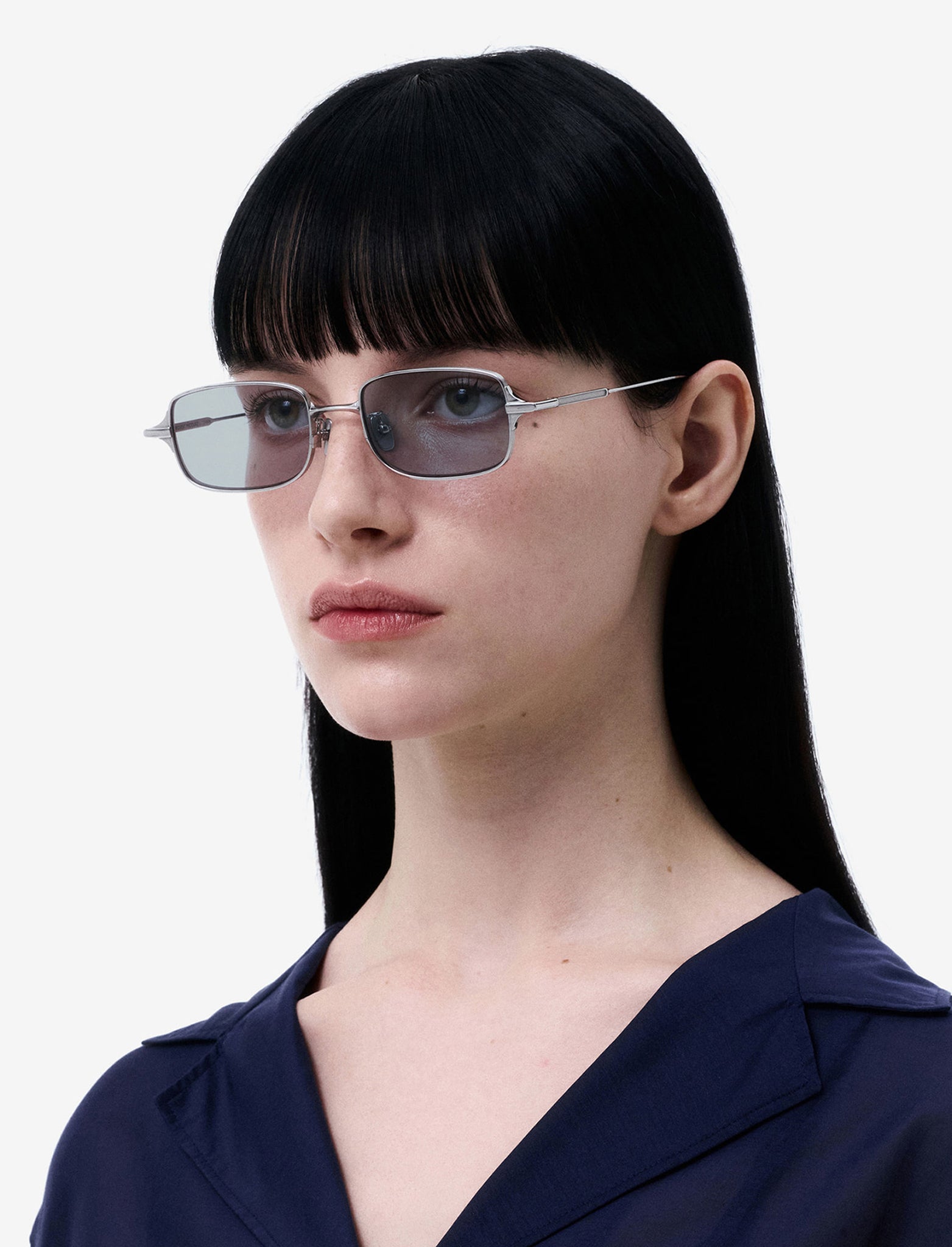 These ND9 thin square titanium sunglasses express an asymmetrical metal volume. The bold bridge and end-piece-to-temple details create a sense of layering metal, adding a distinctive touch of individuality.