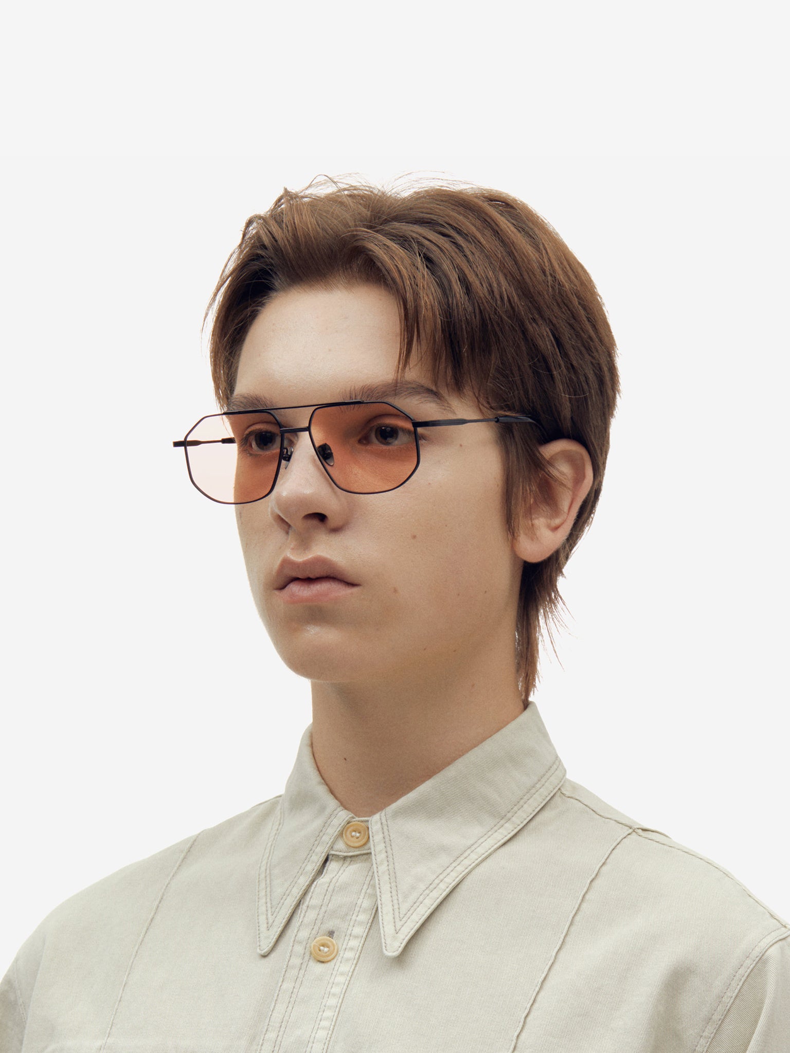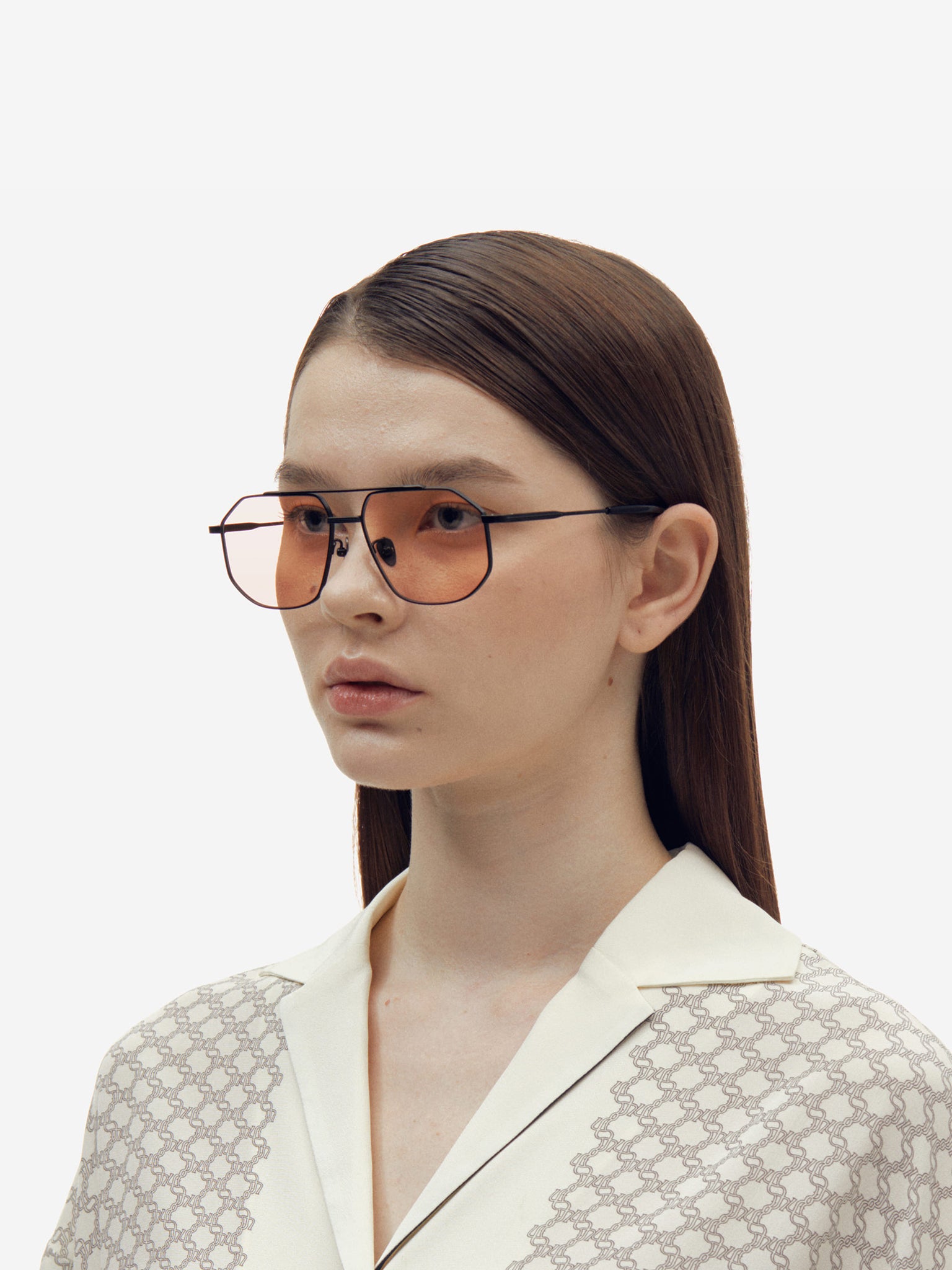 Representing a retrospection between the past and present, a distinctive two-bar at the front accentuates FS14’s own retro style. Contrast between matte and glossy finishes at the front and temples exude retro glamour. Made from titanium, they are finished with straight-line engraving nose bridge and embossed carving at the temples that offer modern atmosphere.