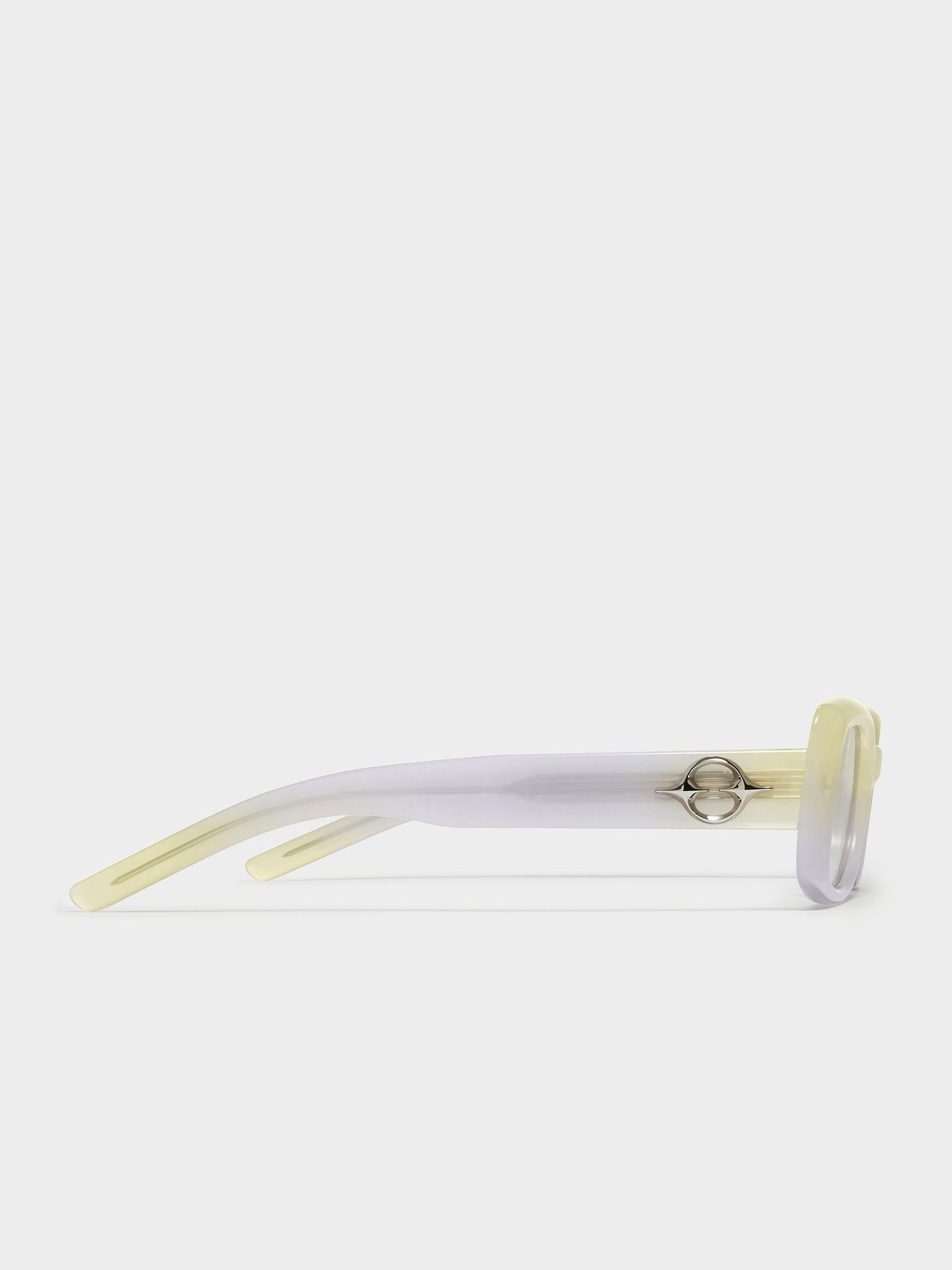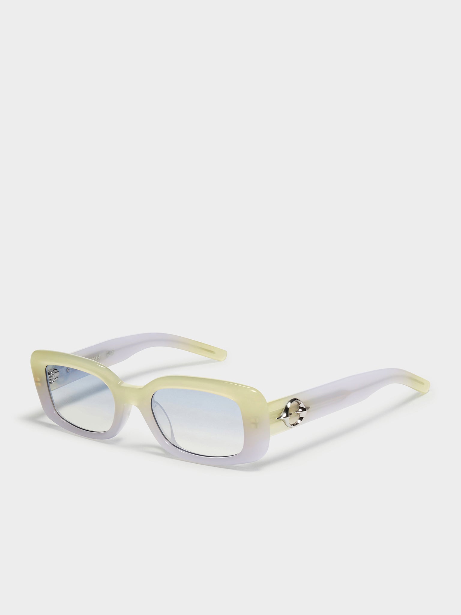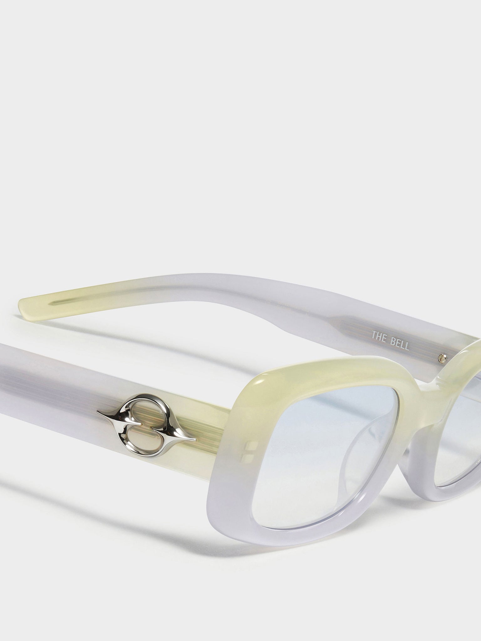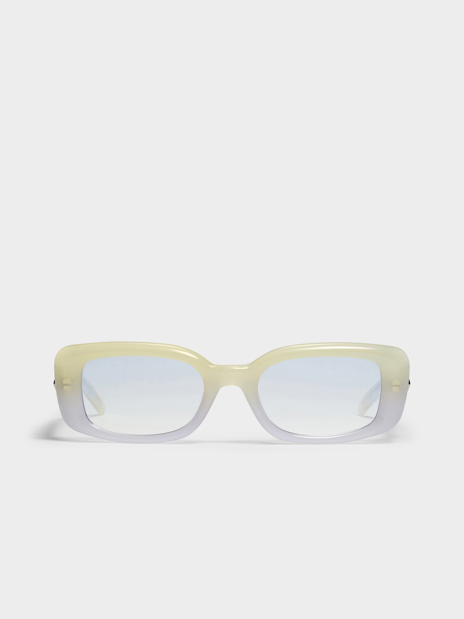 Discover The Bell YVG1 sunglasses from Gentle Monster`s BOLD collection, a collection inspired by the stars in the galaxy. Featuring a structured rectangular silhouette and a contrasting graduated light yellow and violet frame with colorful, graduated blue mirror lenses, this model adds a unique touch to any look. The signature BOLD symbol on the temples is a delicate, eye-catching detail that showcases Gentle Monster’s unique aesthetic. The softly-curved temples and flat tips complete the bold design of this collection.