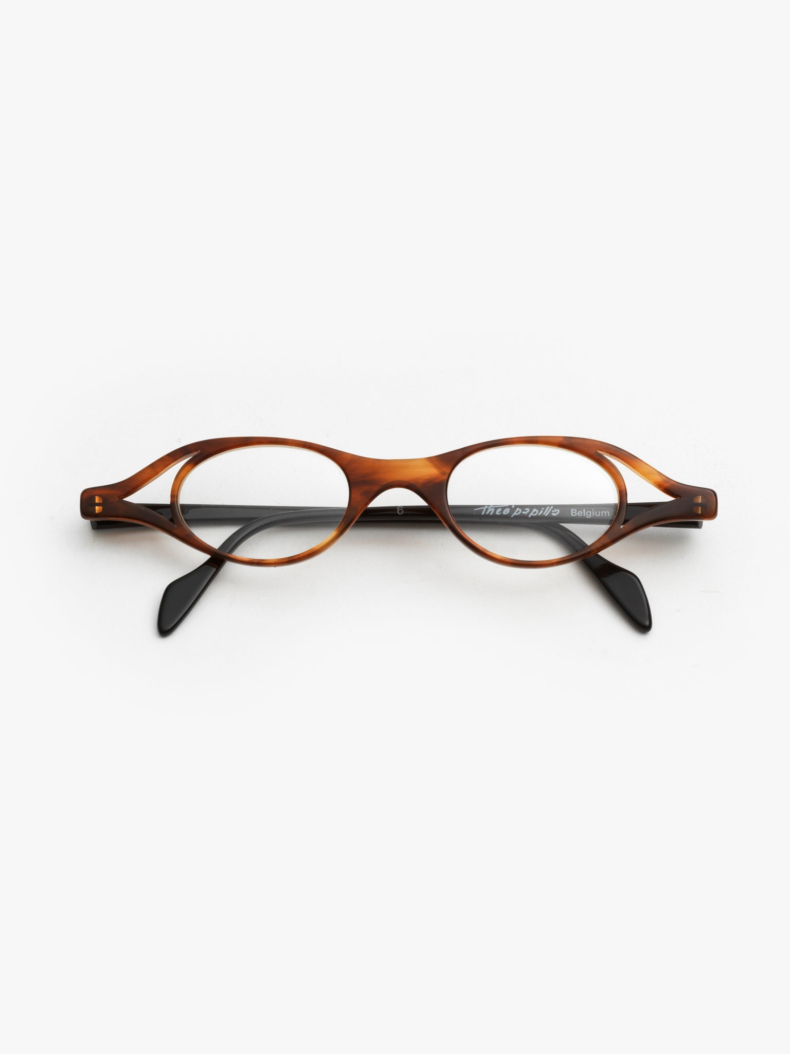 "Papilla" is Theo's bold reinterpretation of the classic and small oval shape, brought to life through a highly creative and distinctive design approach. The name itself, Papilla, draws from anatomical terminology directly related to the eye, hinting at its deep connection to vision and perception. With its unique contours and artistic flair, this frame beautifully encircles the eye, offering both precision and personality in its fit and style.