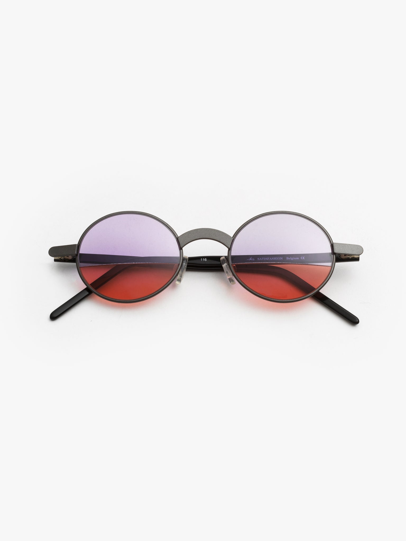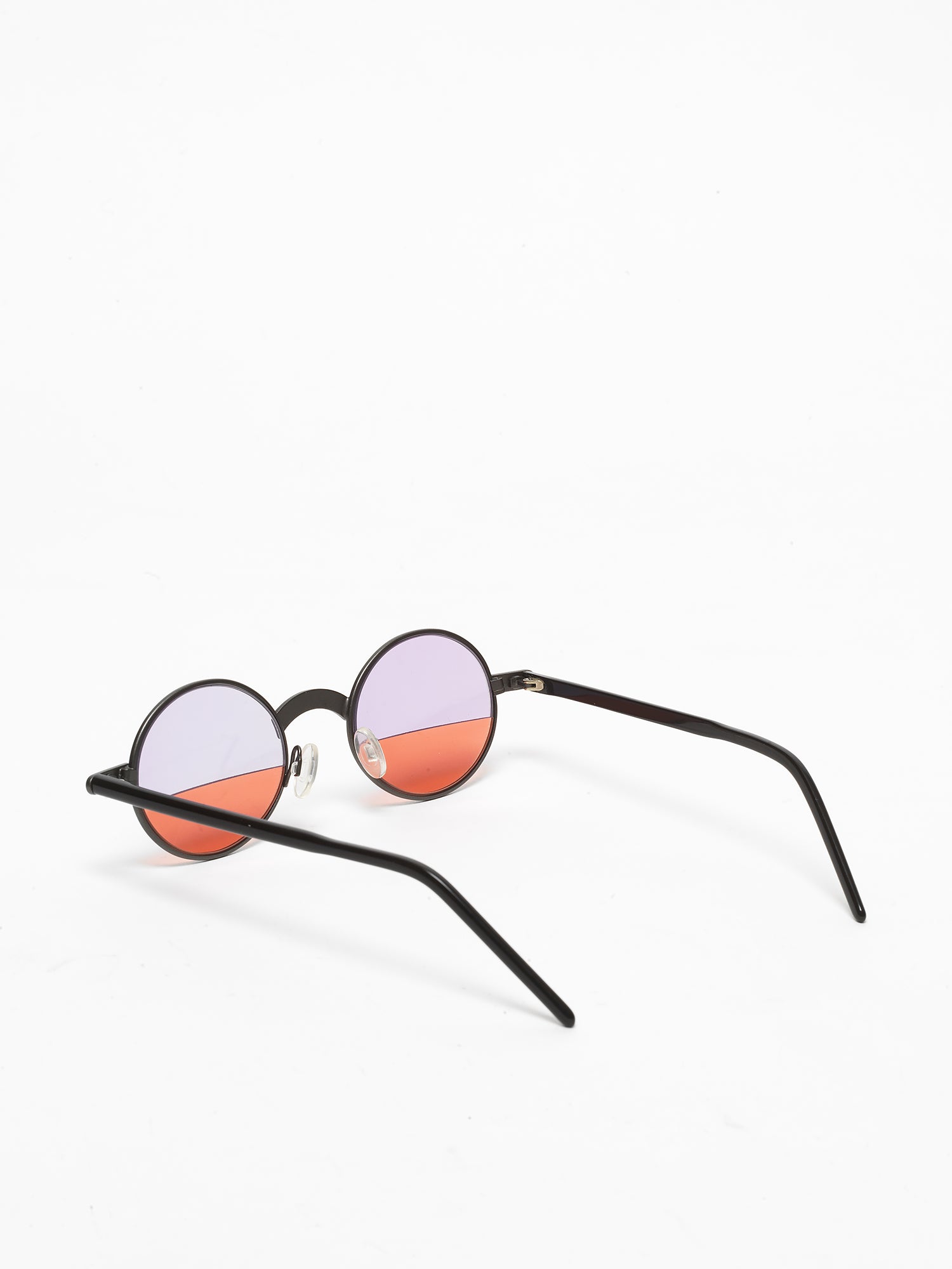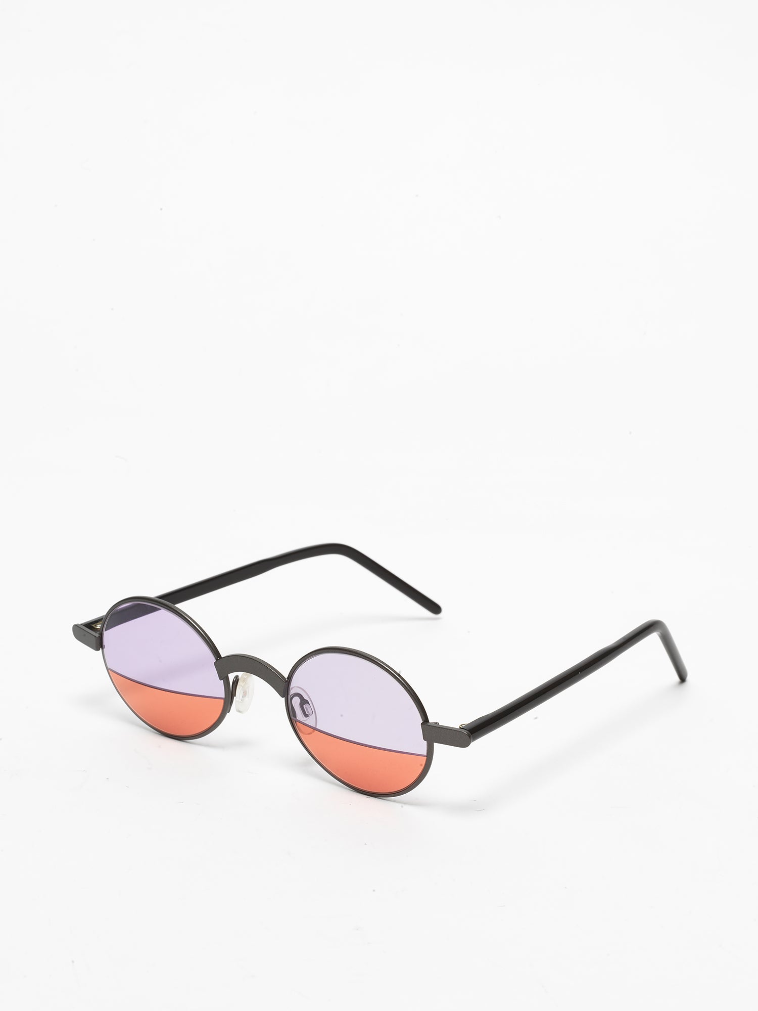 Round design; unisex style. What sets this model apart is the lens, featuring a clean cut that distinctly separates two different colors.
