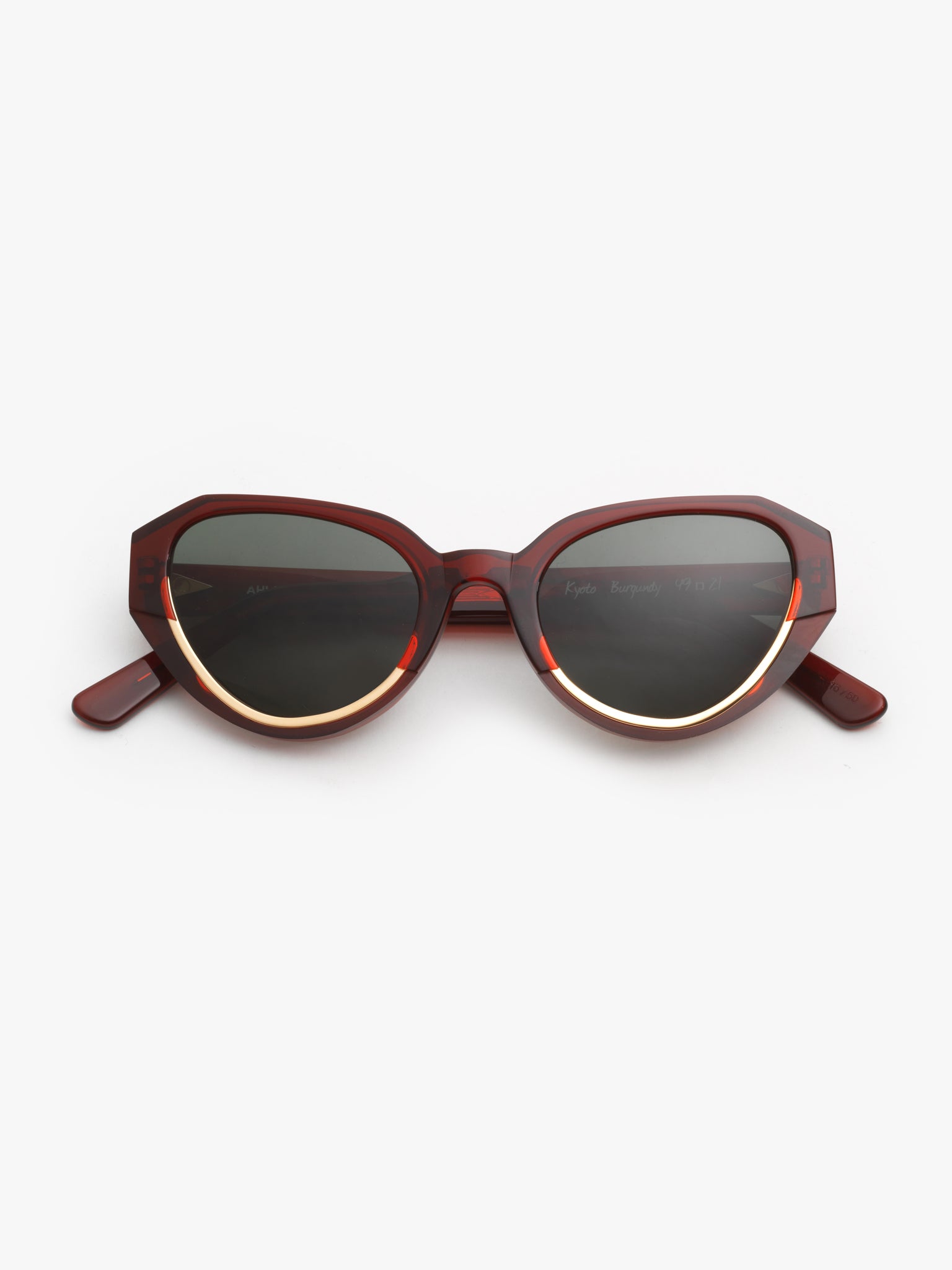 Kyoto’s intricate technical process transforms the visual identity of the frame front: the raw acetate requires an additional machining process as well as a hand-polishing step to achieve its enhanced raw effect. The lower rims are highlighted by a seamless metal arc, hand-tooled into place and electrodipped in 22k gold.