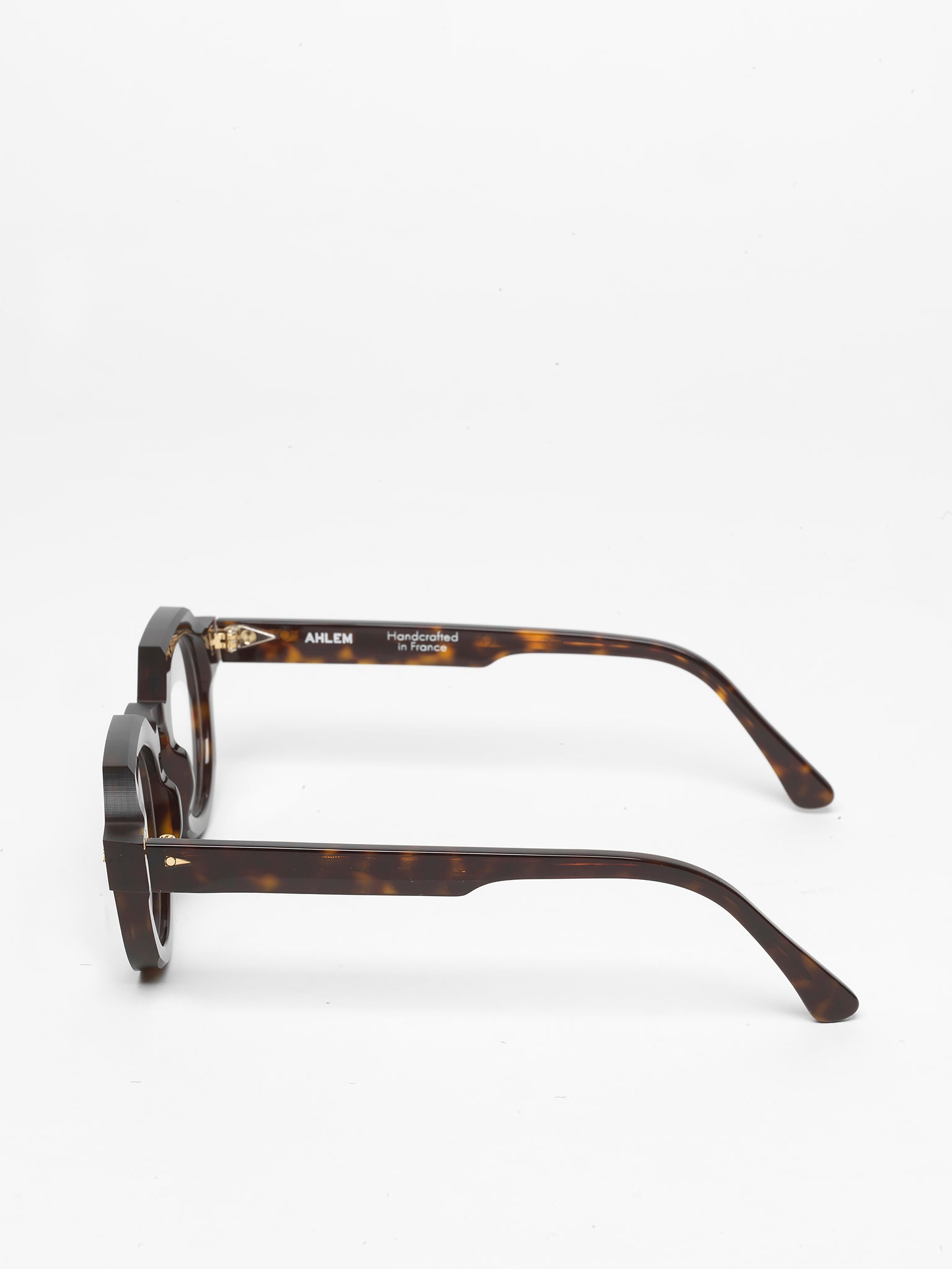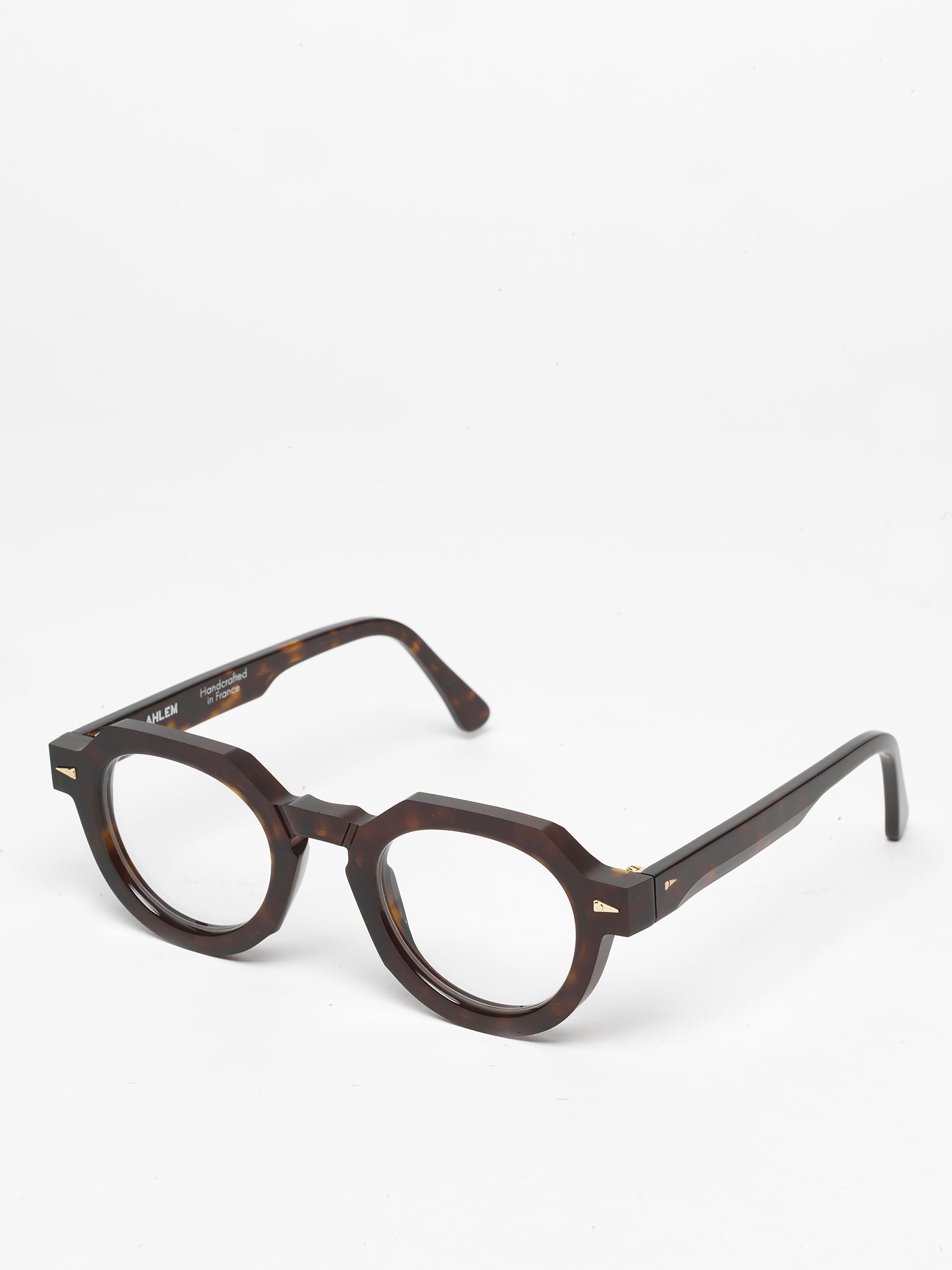 A direct and charming bookish frame with real presence and originality. Thick acetate, unconventional lines and a refined keyhole bridge team up in a style that marries intelligence and sophistication.