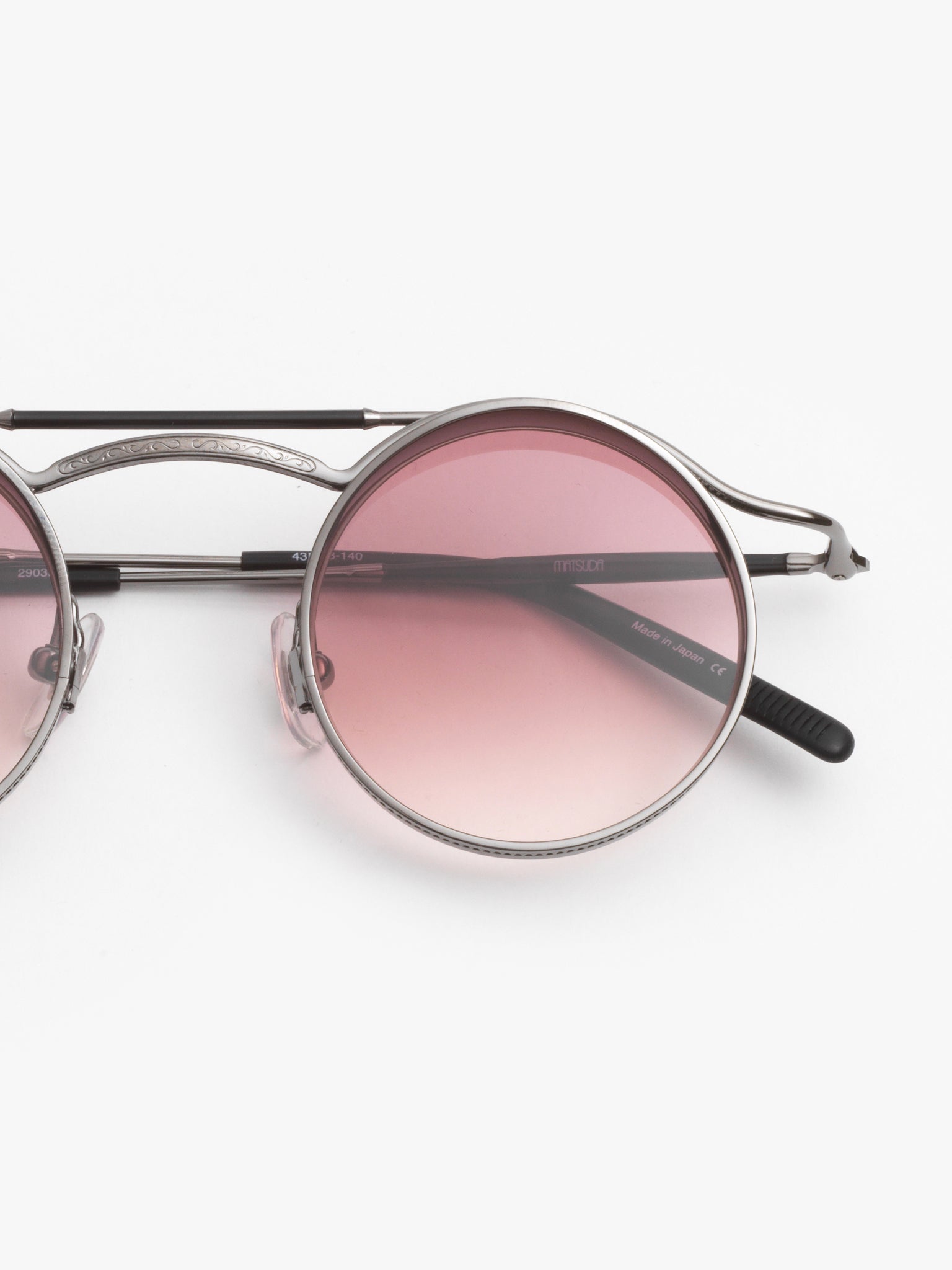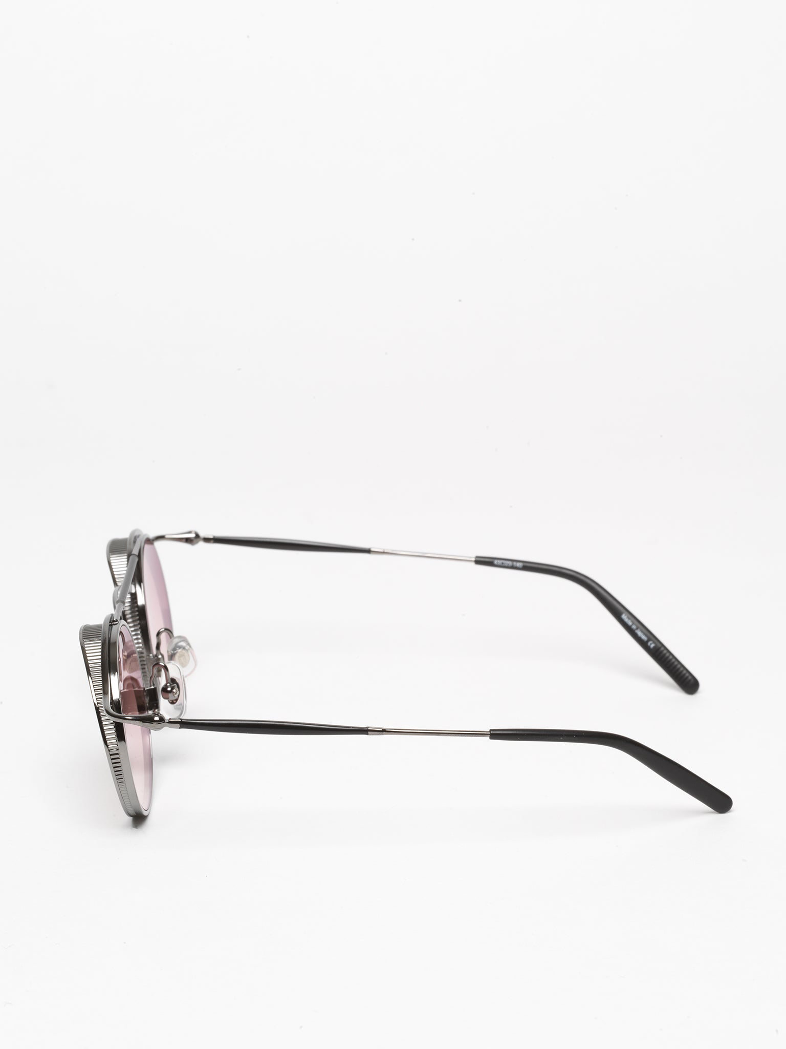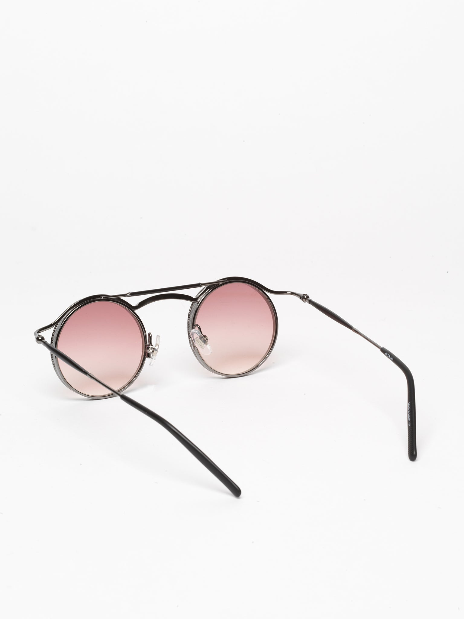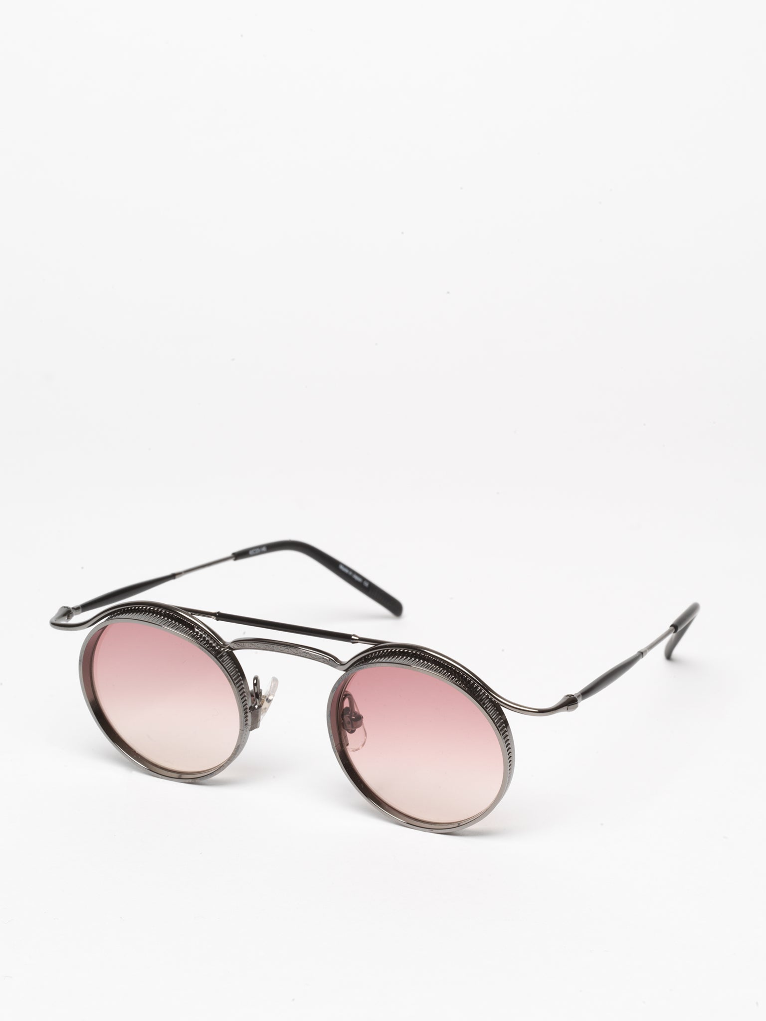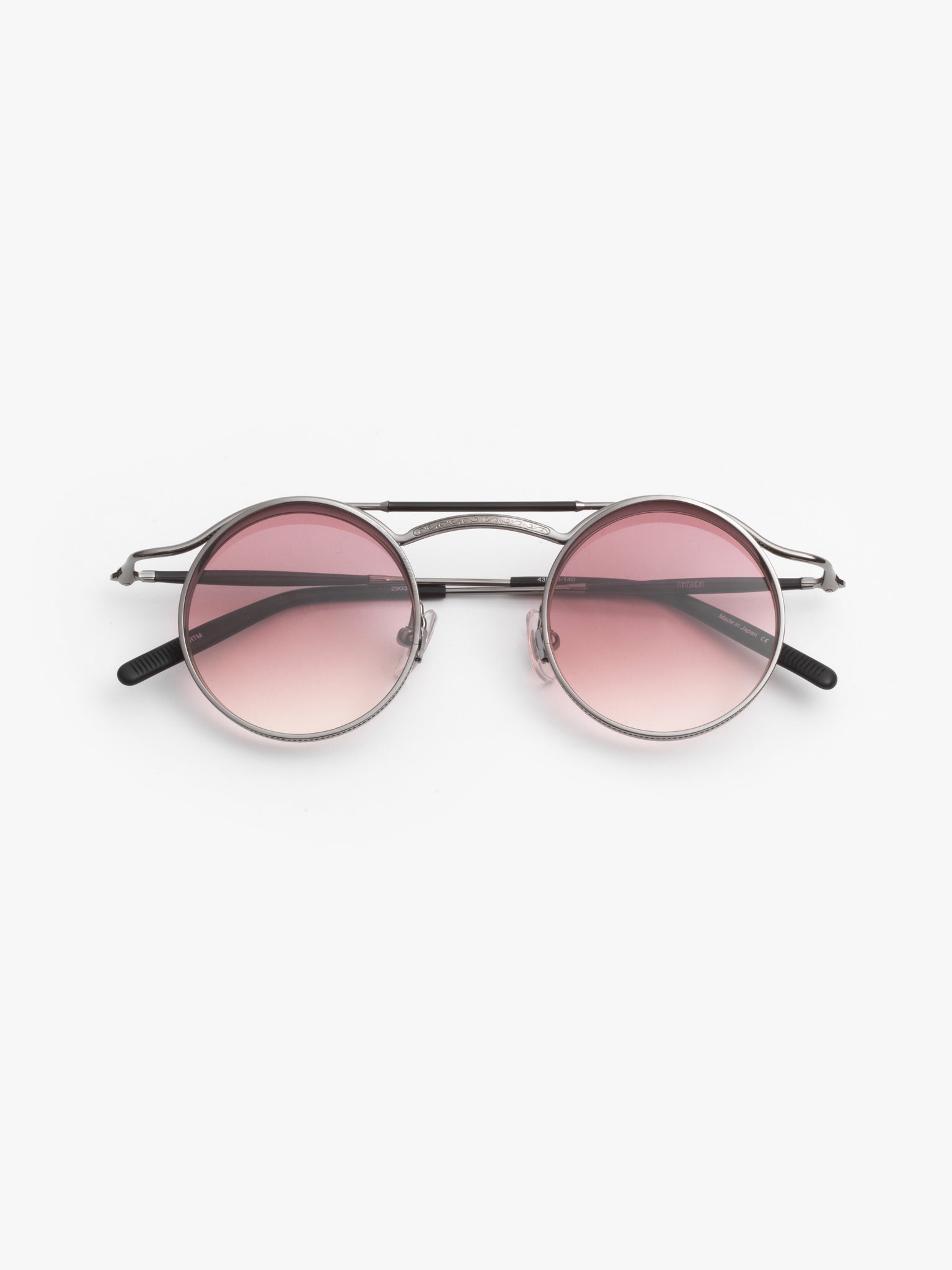 A striking round creation with strong architectural lines, exuding an industrial feel. Ribbed detailing, visors, and an elegant lacquered top bar all lend a nod to the Machine Era of the early 20th century.