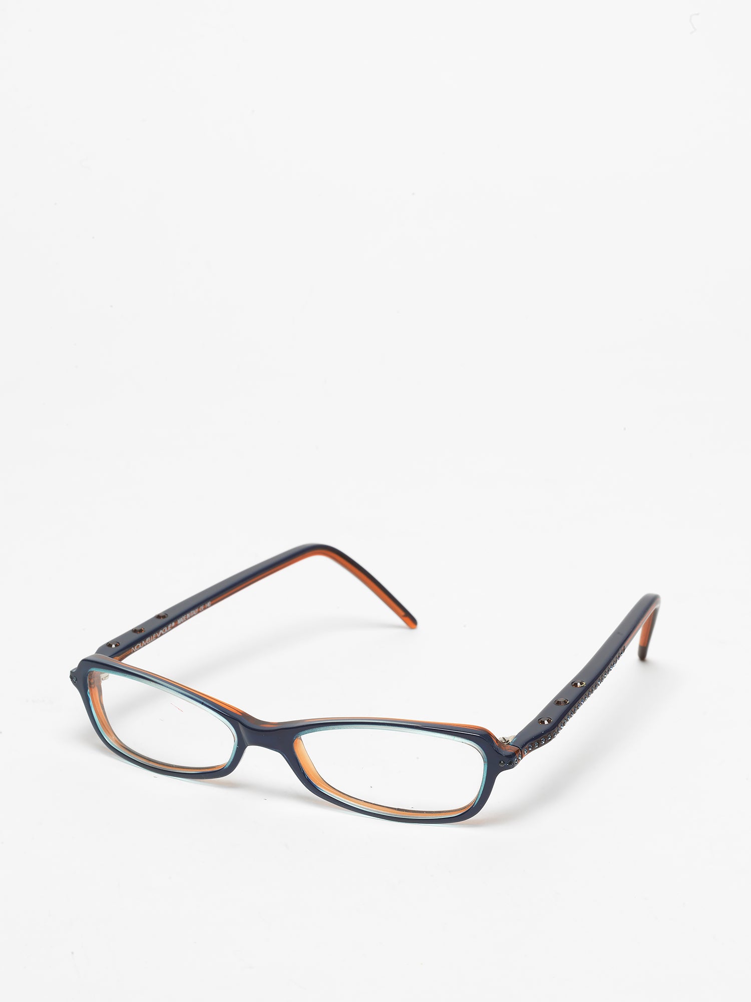 Very small frame made of acetate with a combination of two colors, featuring flat temples adorned with Swarovski decorations of various sizes; a little gem created in the late 90s.