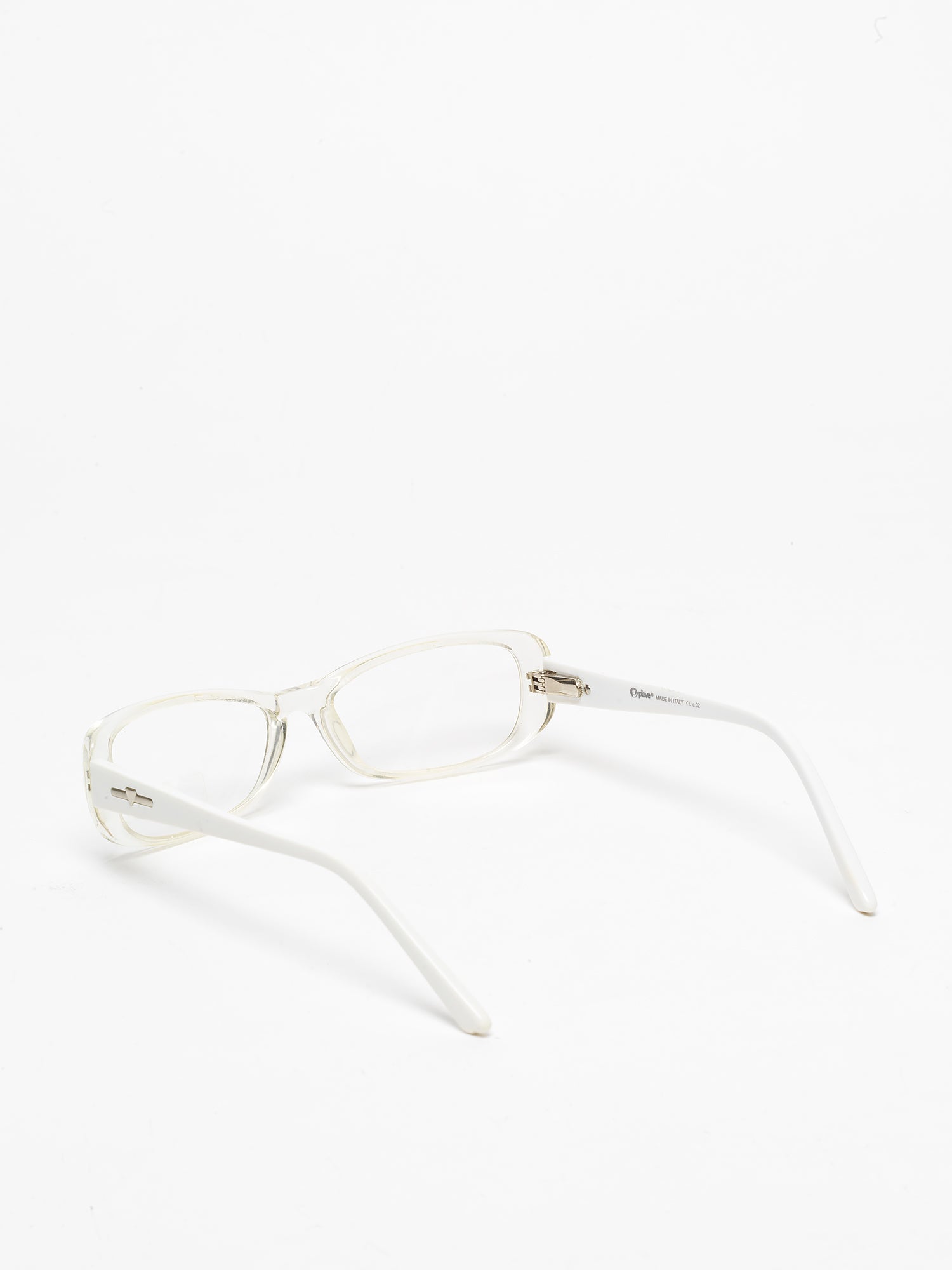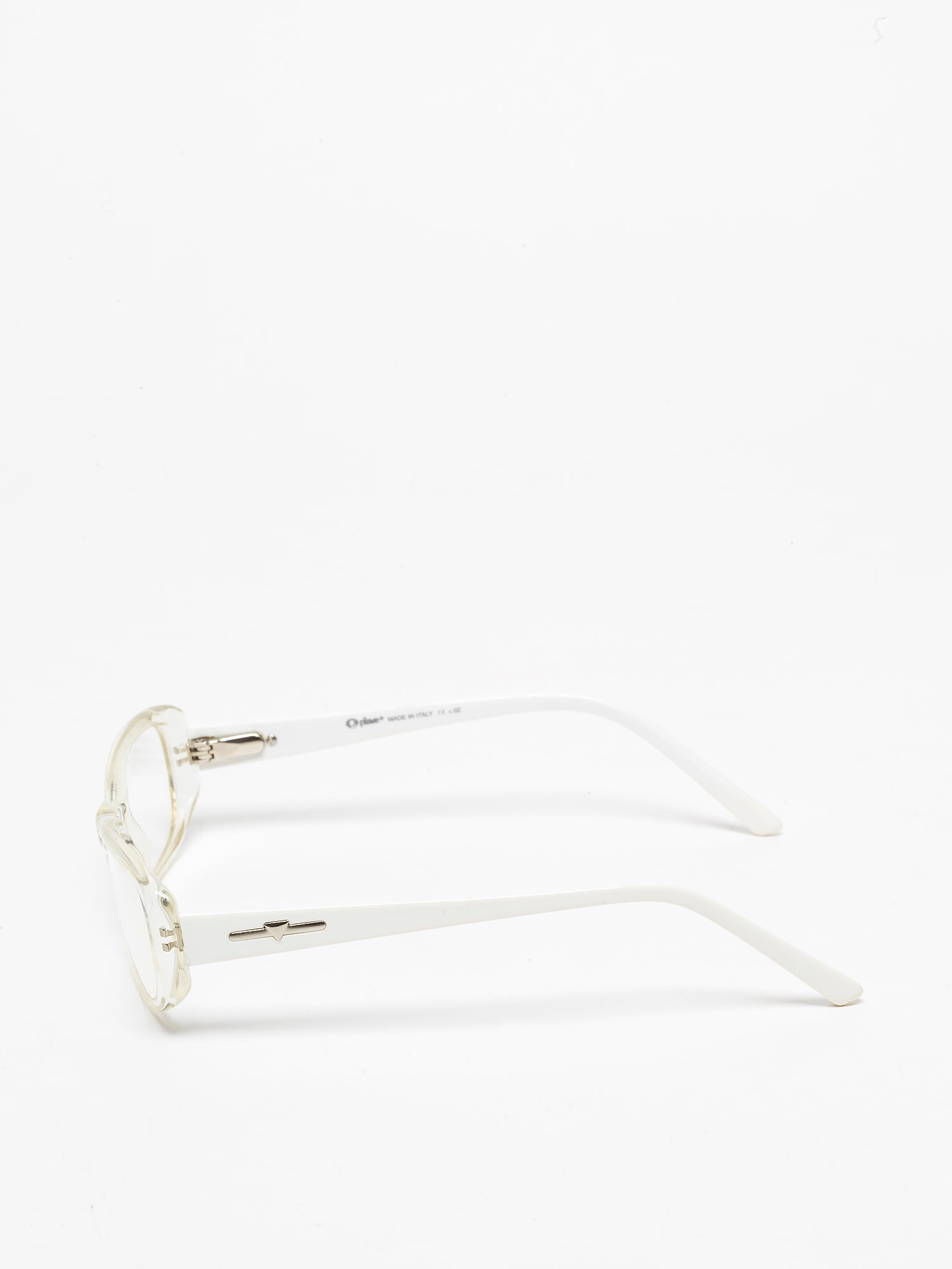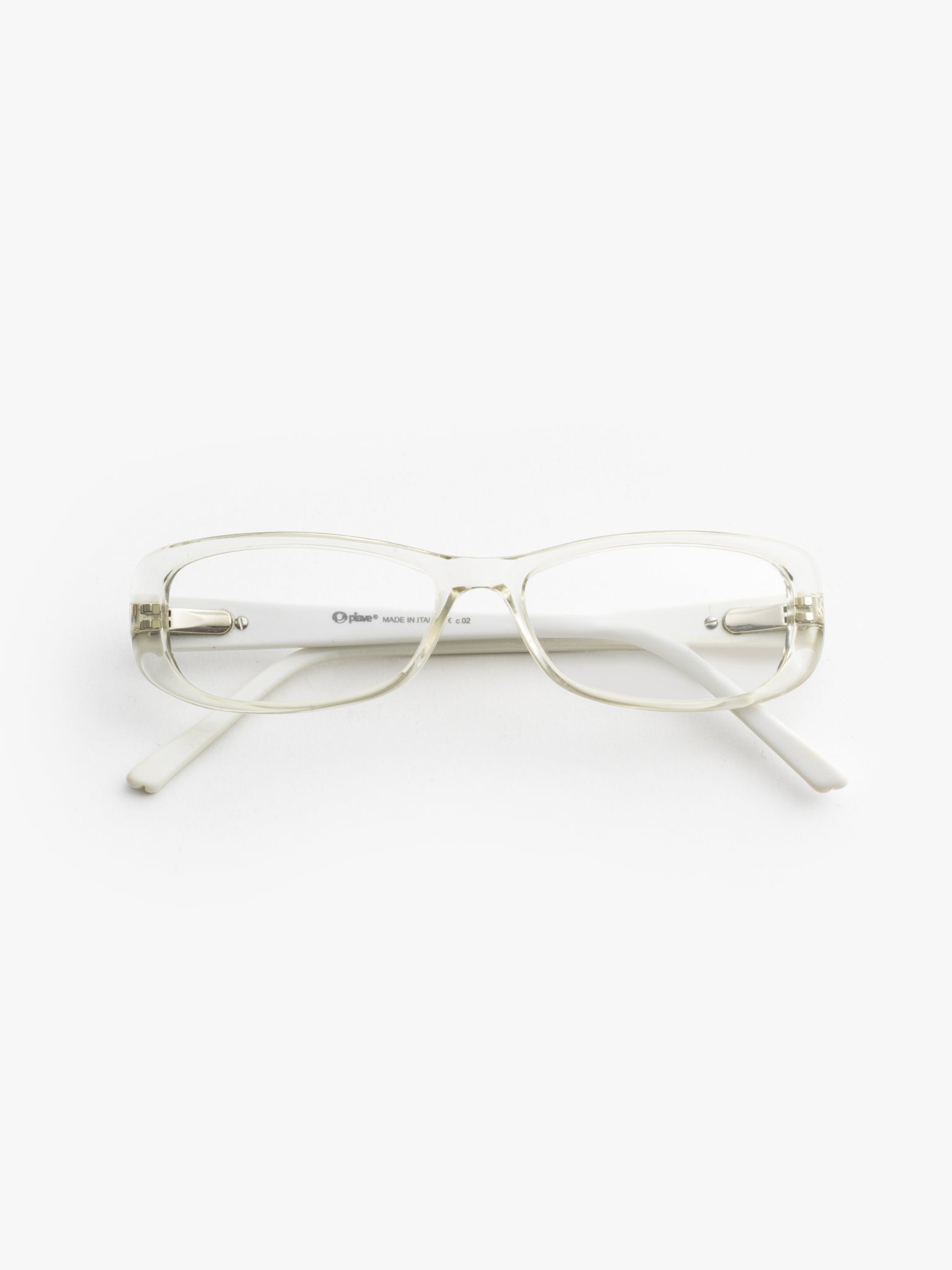 Rectangular narrow shape, inspired by a typical eyewear design from the 90s and early 2000s, which in this version features a colour contrast between the front and the temples, along with a stylized decoration on the temples.