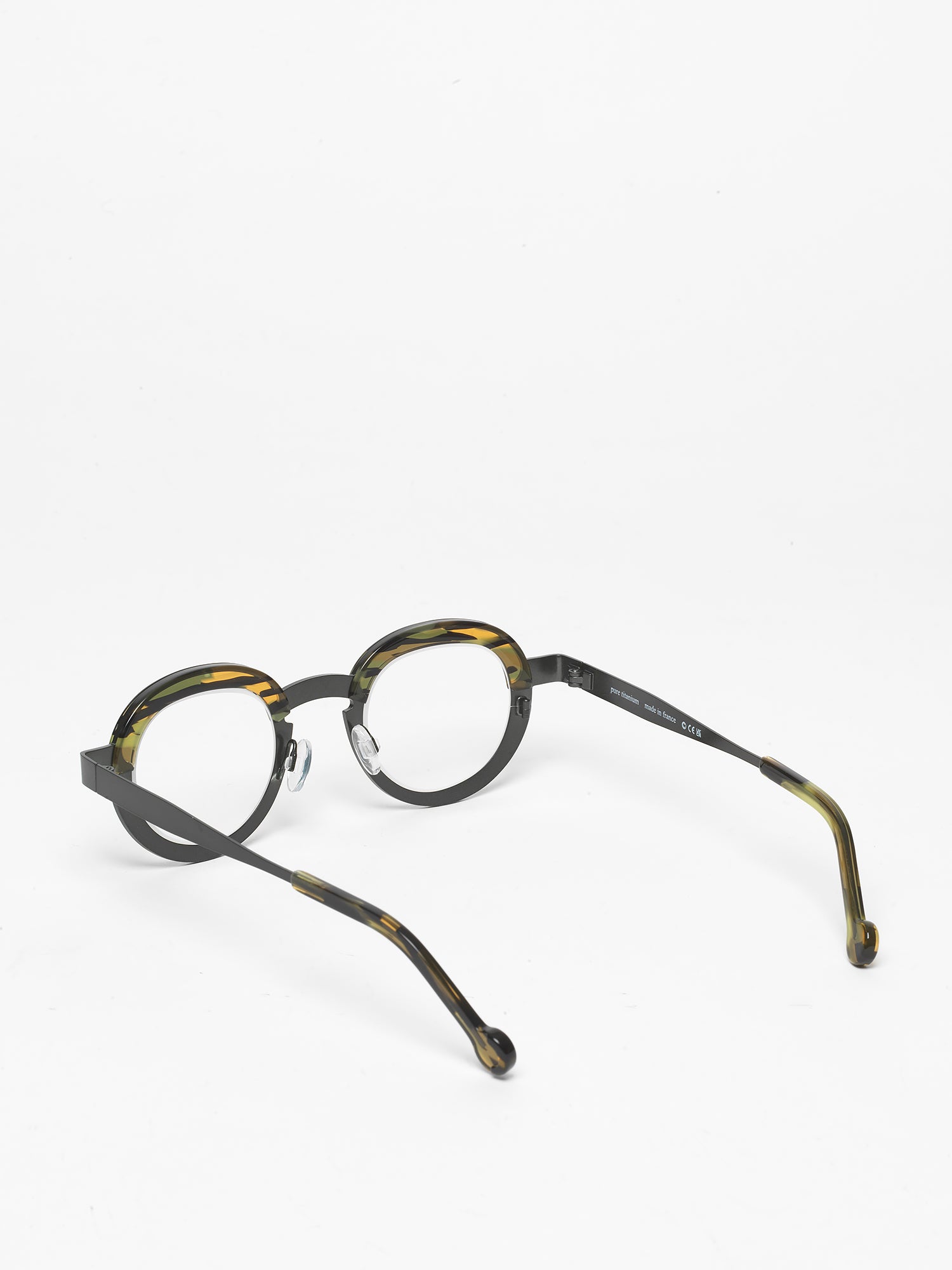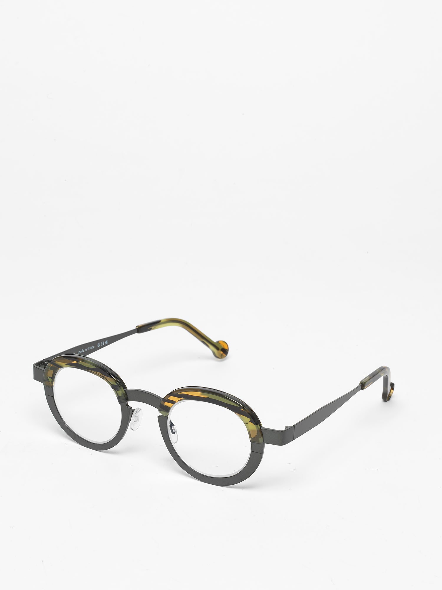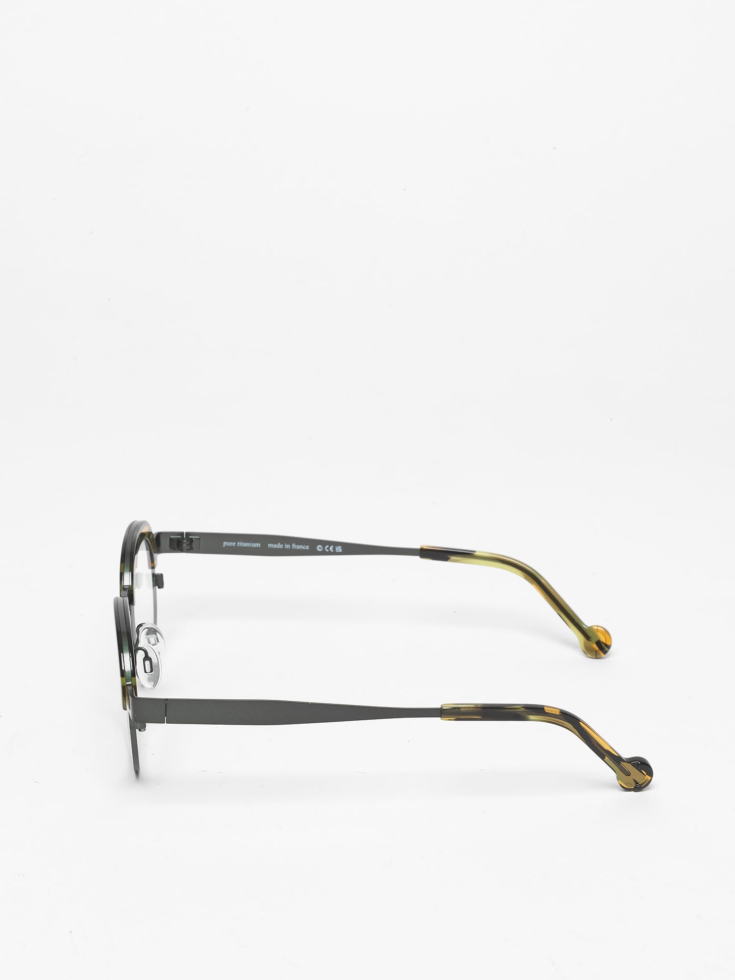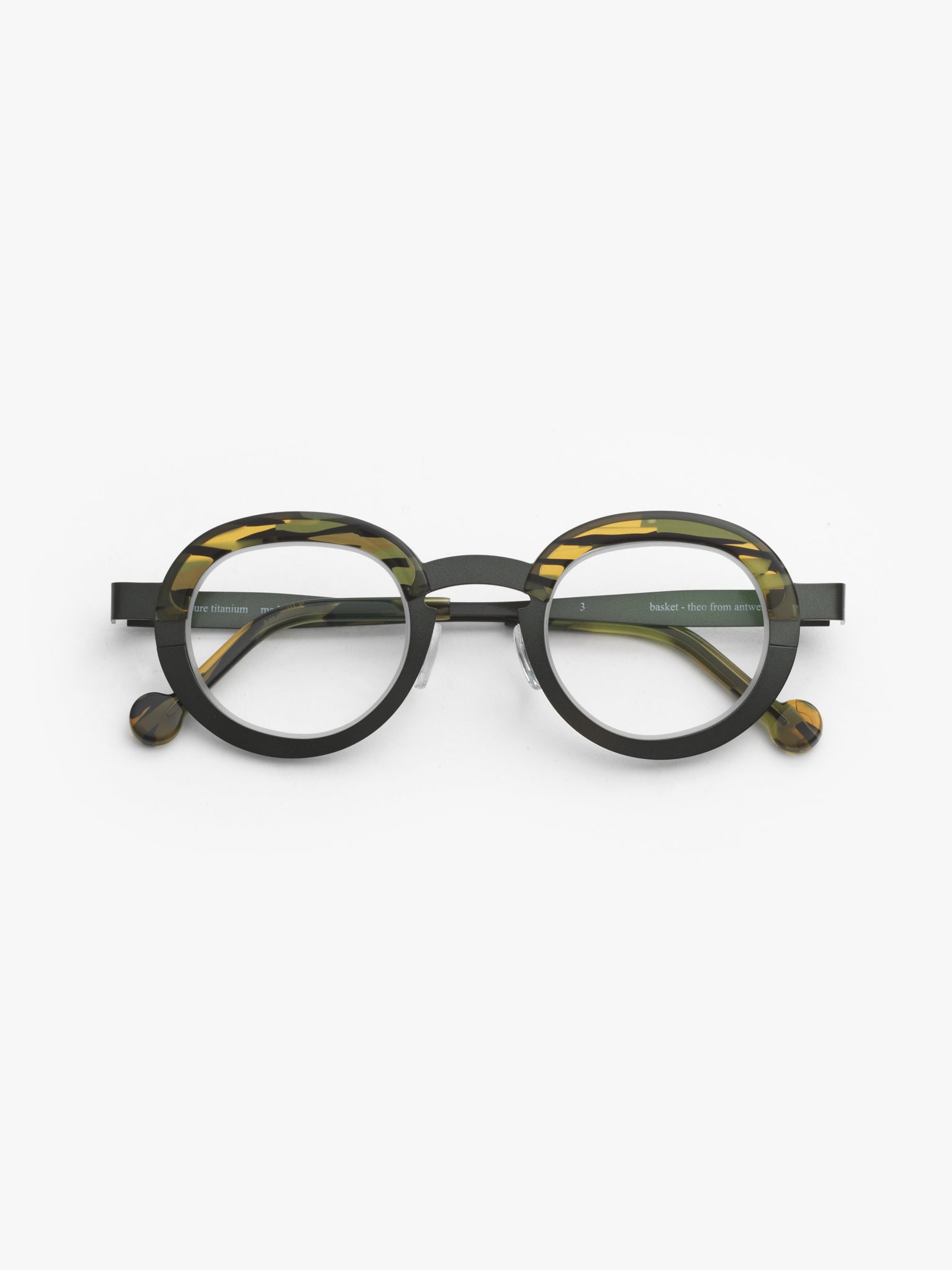 The Basket model showcases a panto design with straight front frame, made from titanium with acetate finishes