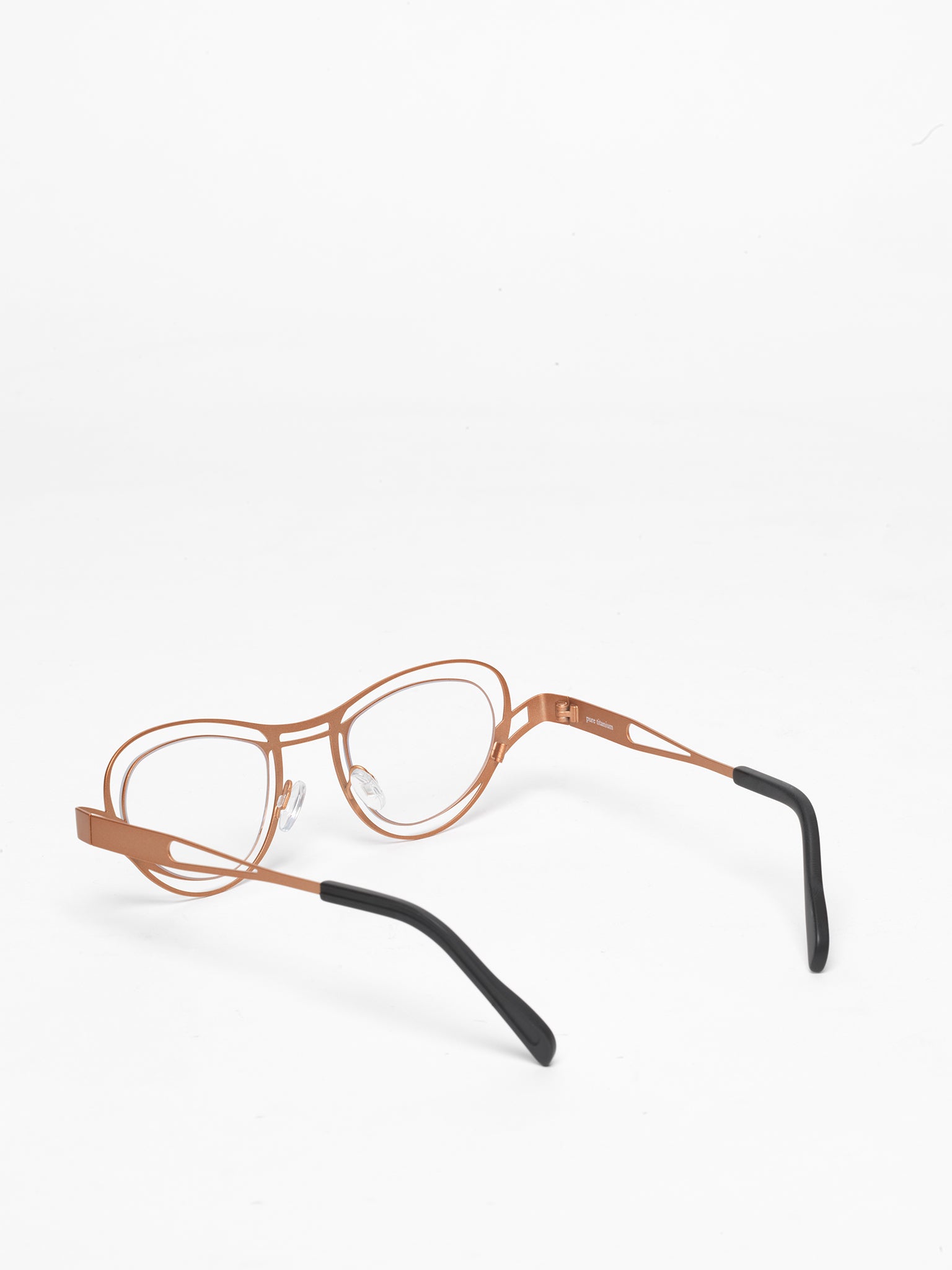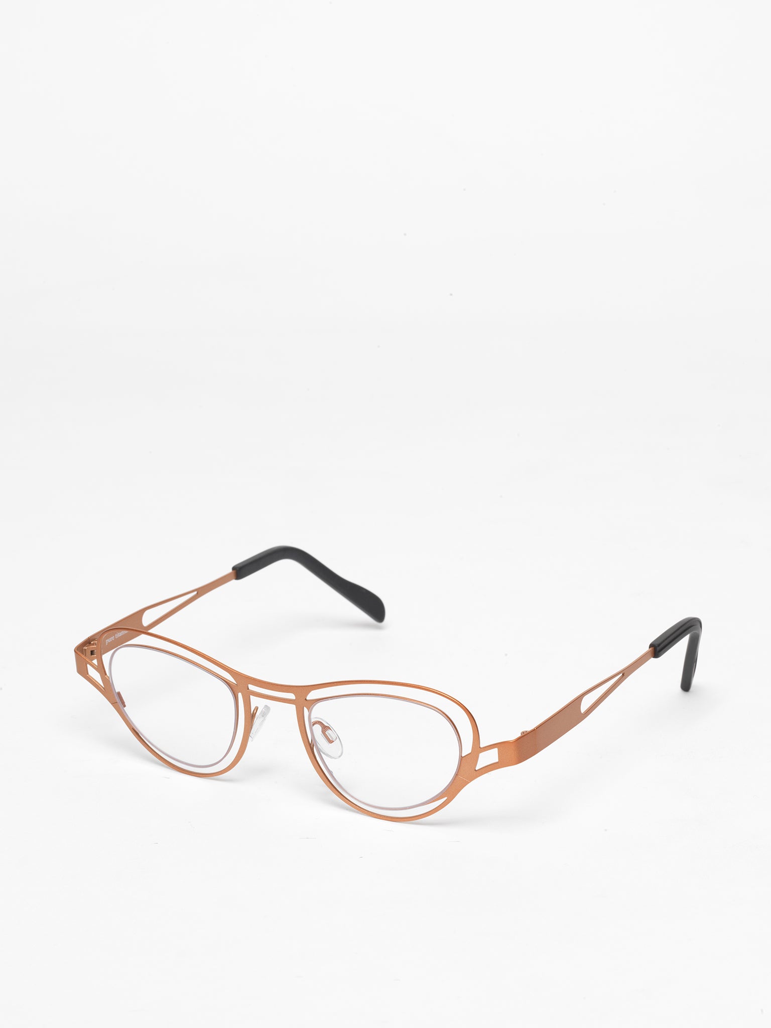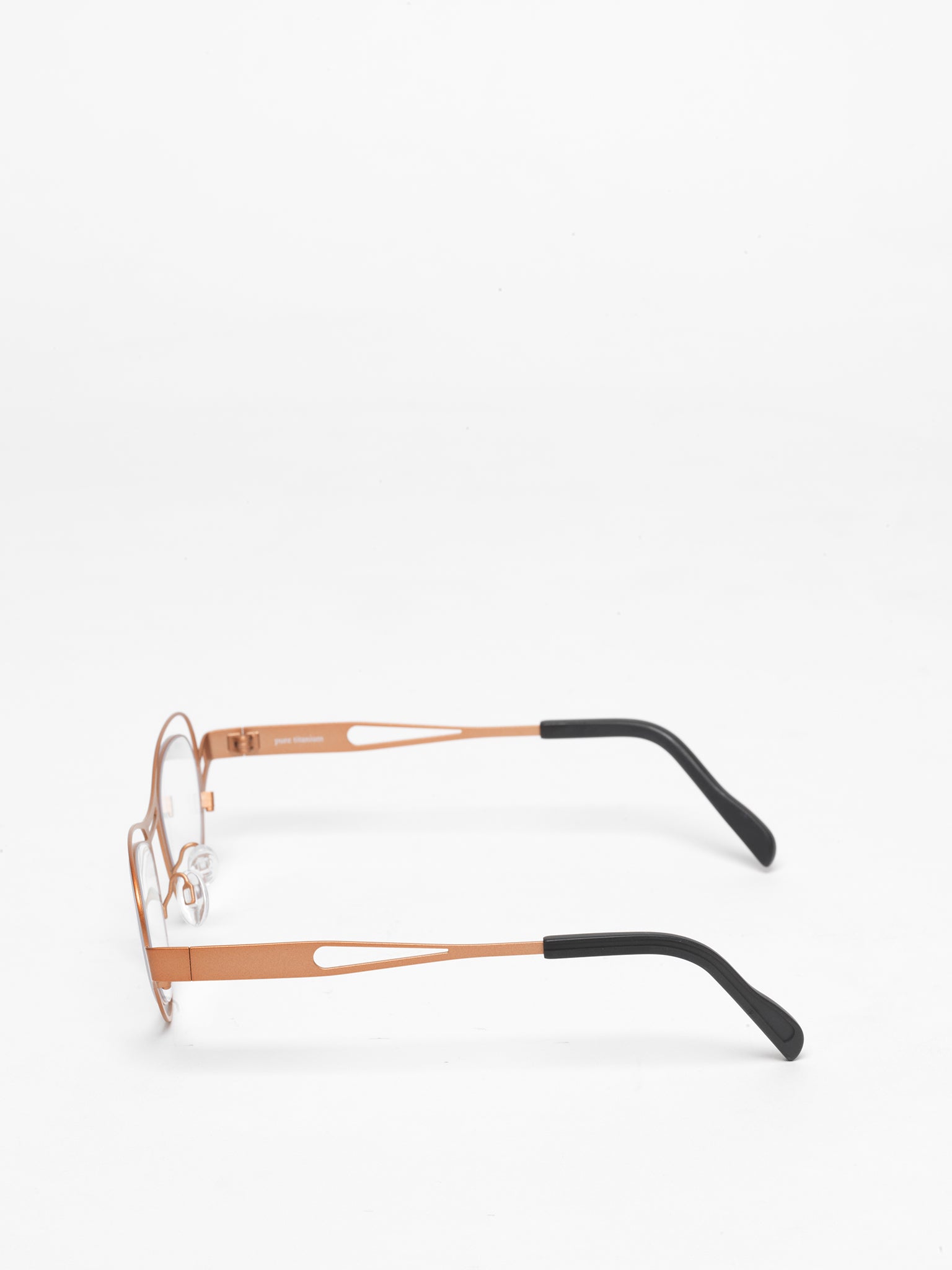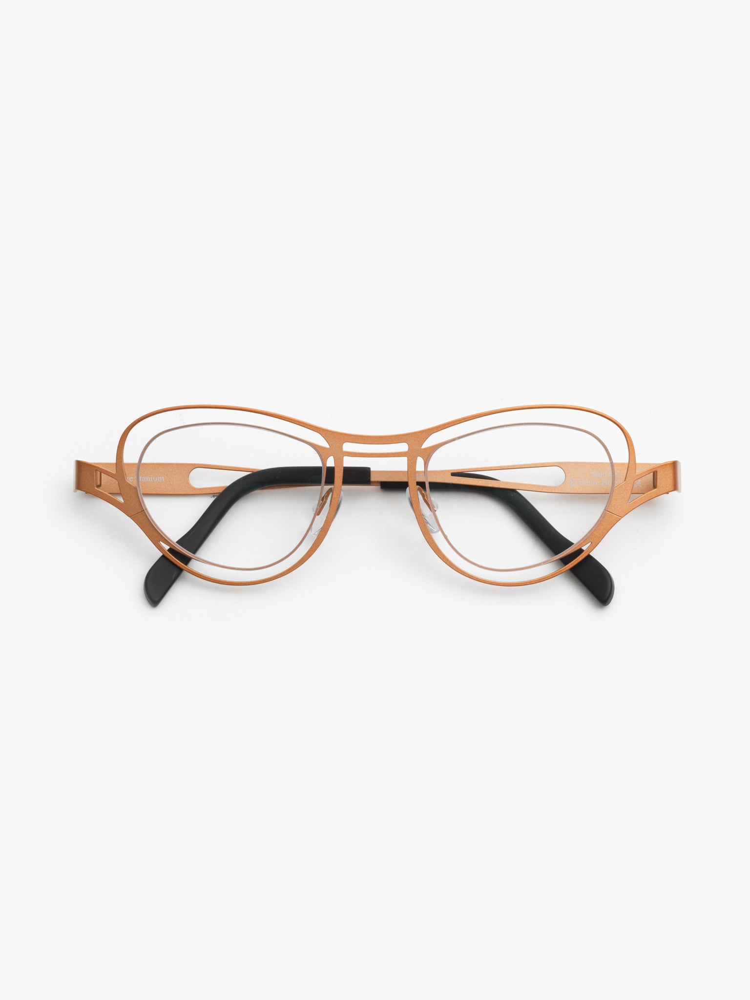 This style features a very distinctive cat-eye shape, is extra light to wear, and is made of titanium.