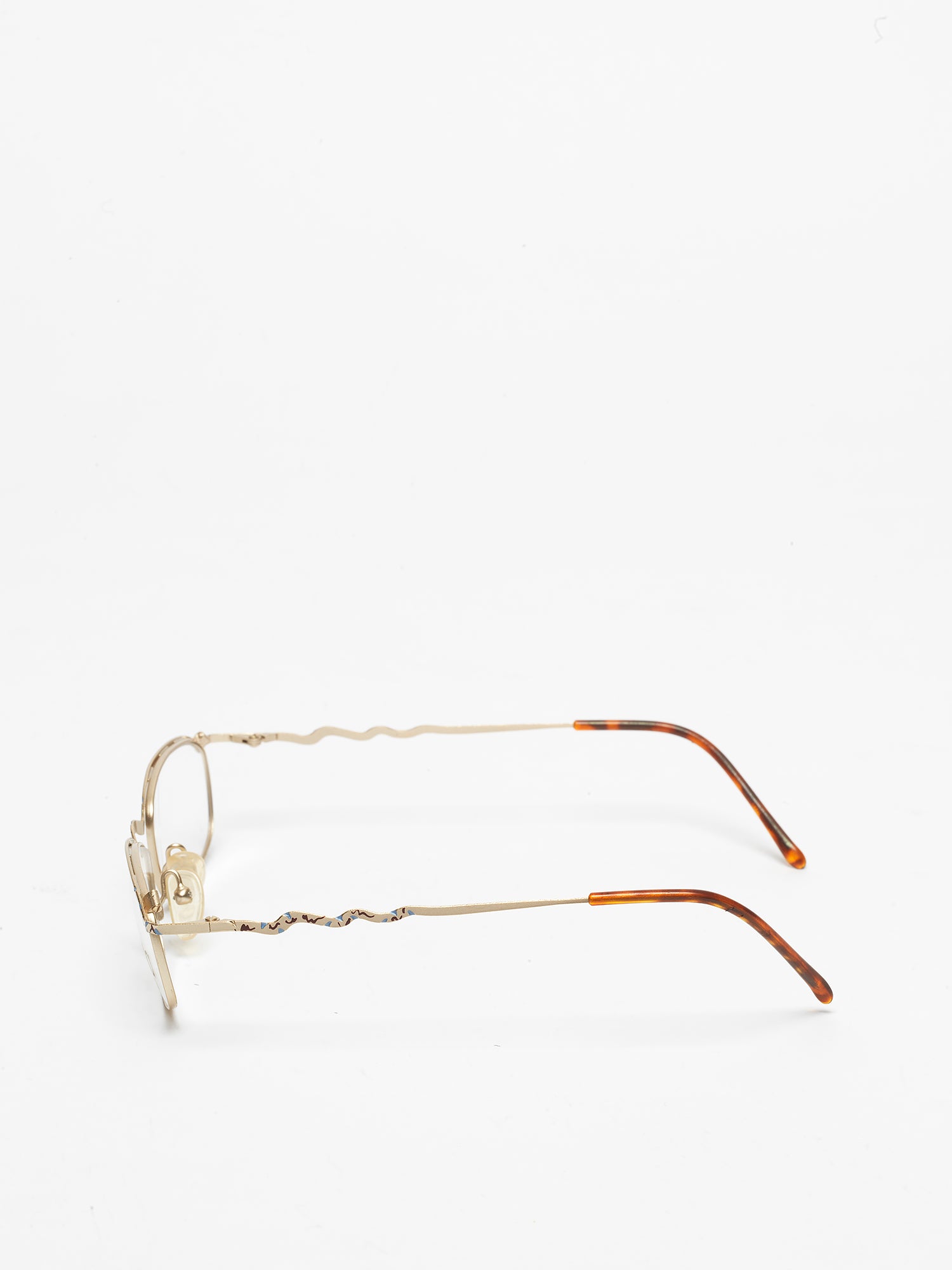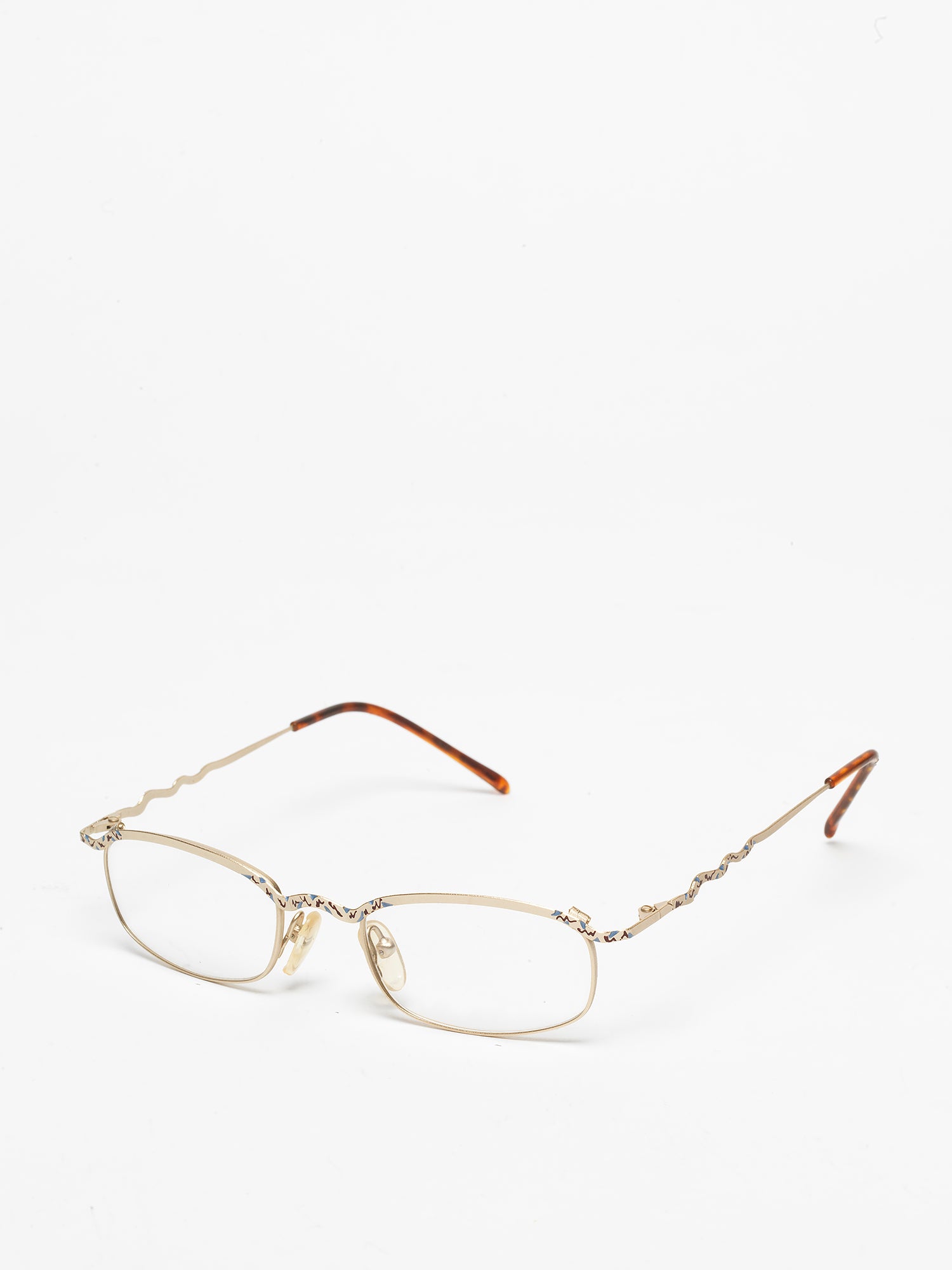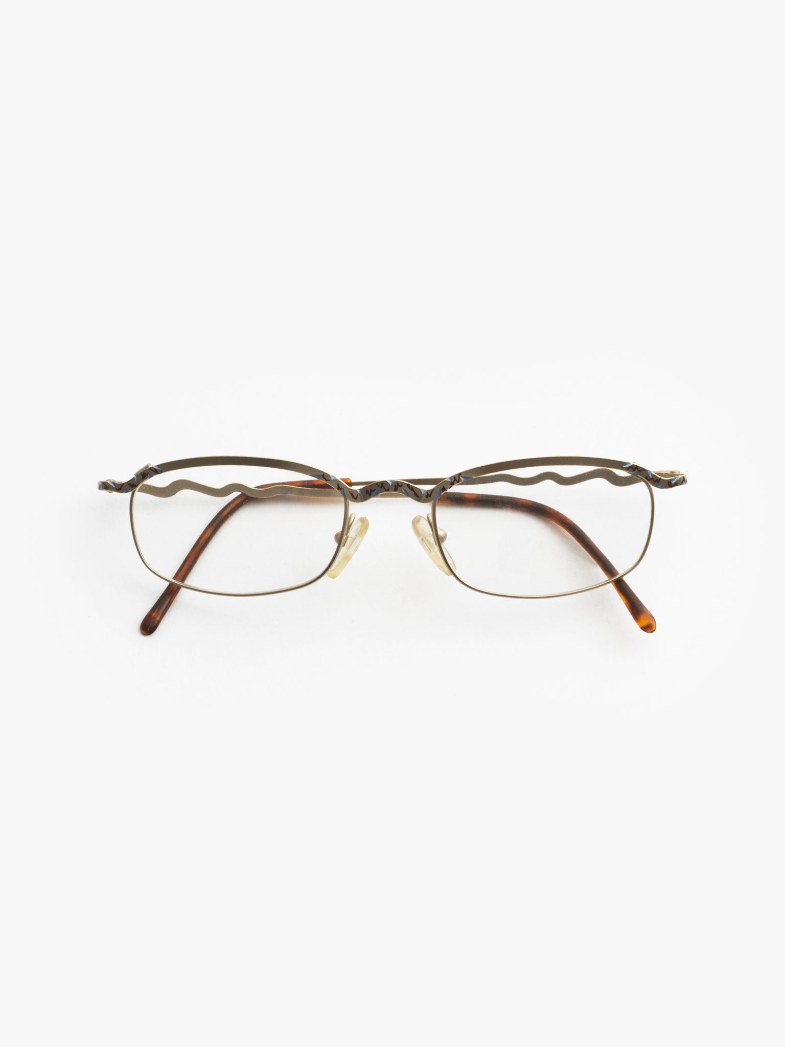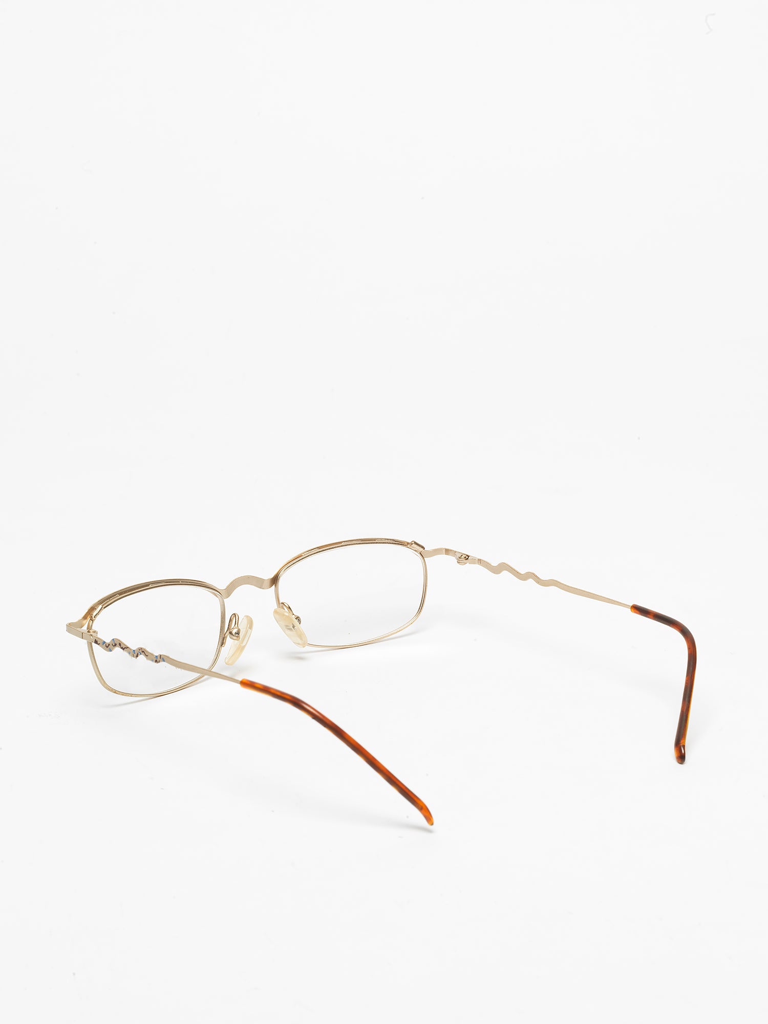 Small metal glasses, ultra-thin, with embellishments and wave-shaped temples.