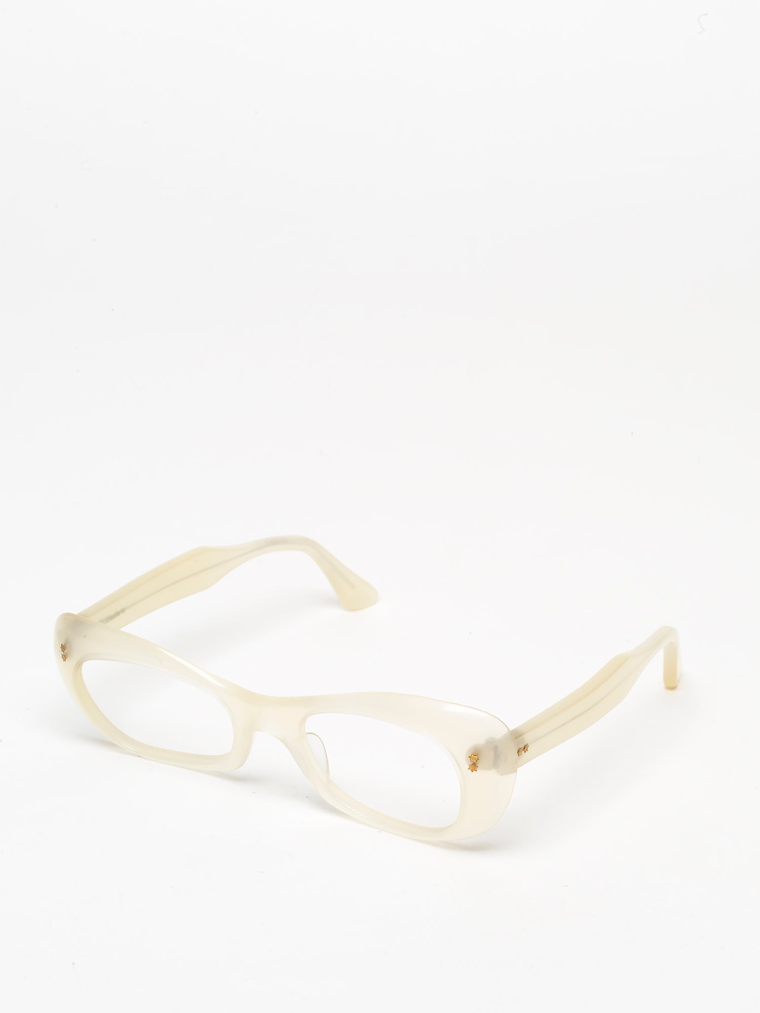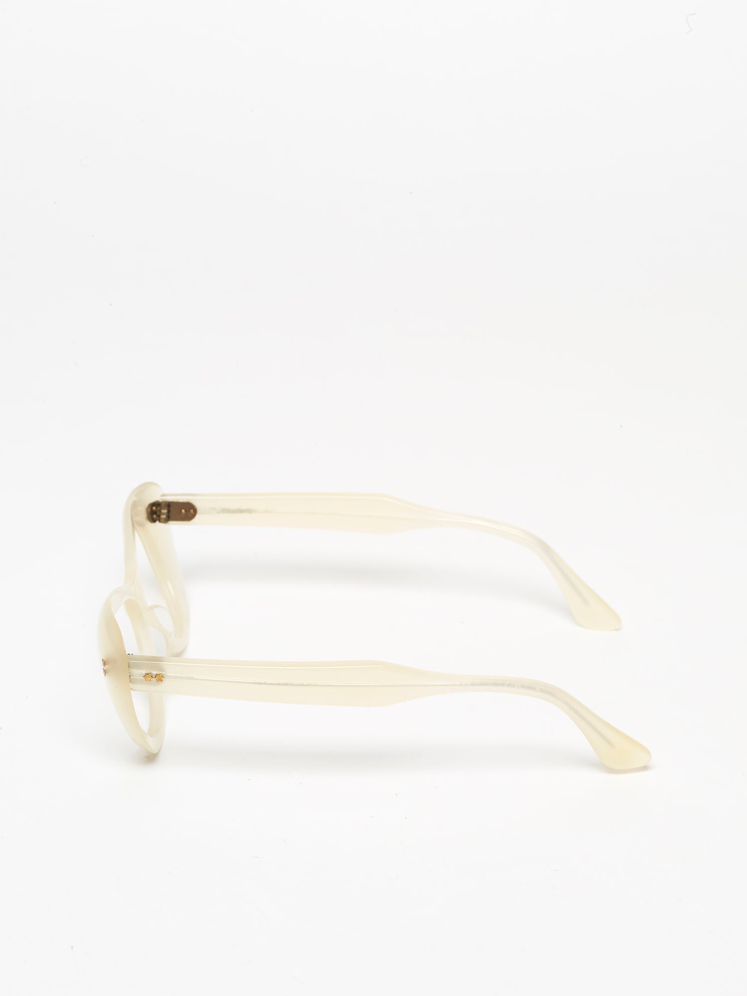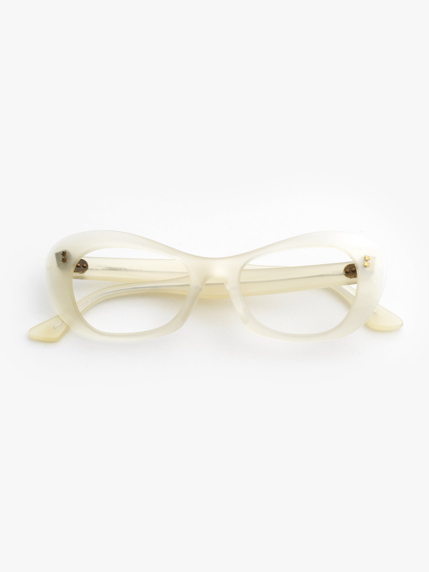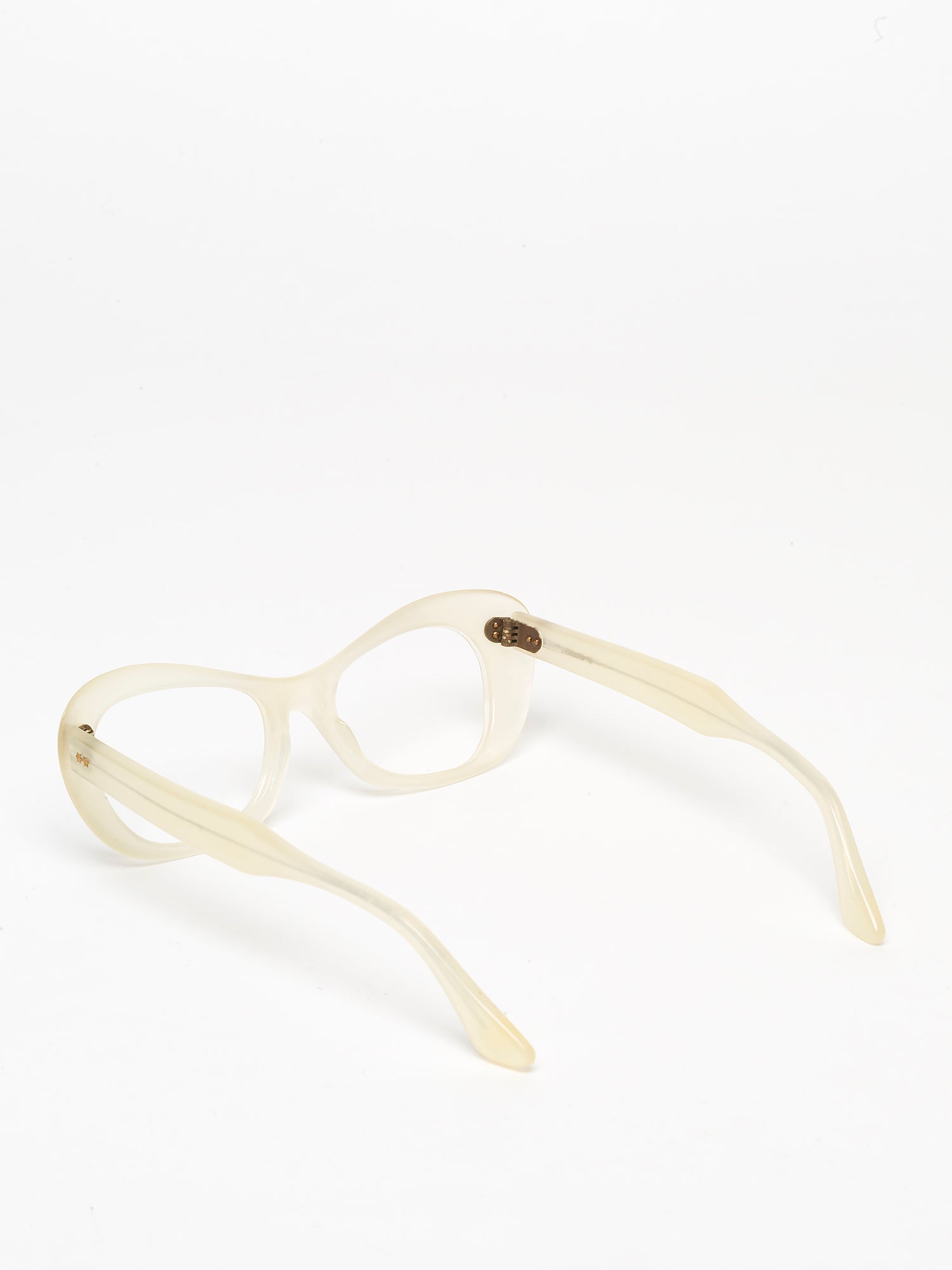 Beautiful cat-eye frame, with a pronounced thickness, made in France in the late 1950s, in a pearly white color reminiscent of mother-of-pearl. The hinge rivets are shaped like tiny stars, in gold, as was commonly used in glasses from that period."